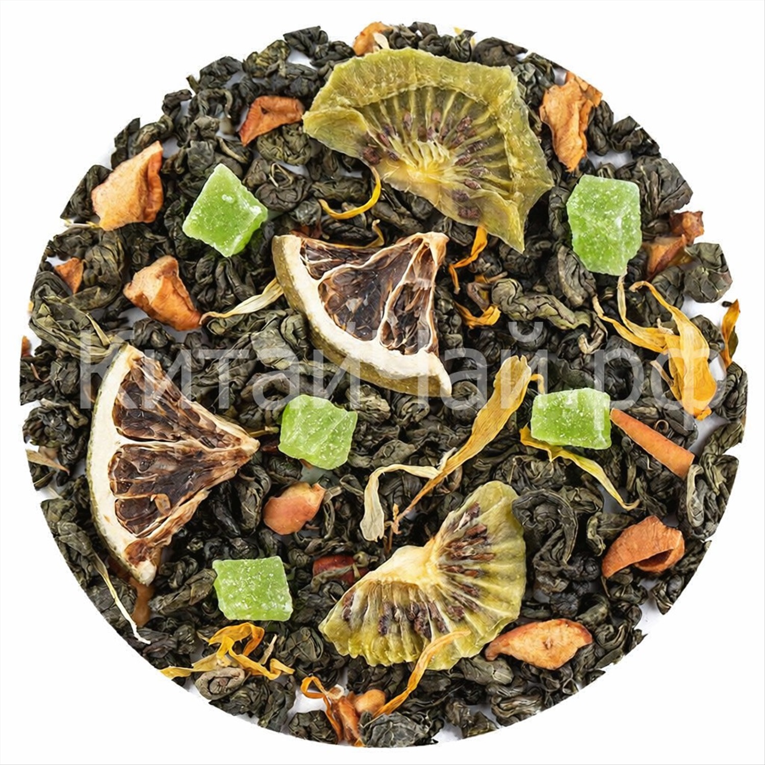 Зеленый китайский чай, кусочки яблок, кусочки ананаса, дольки киви, сегменты лайма, лепестки календулы, аромат кактуса.