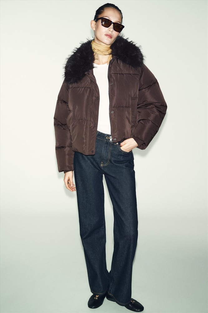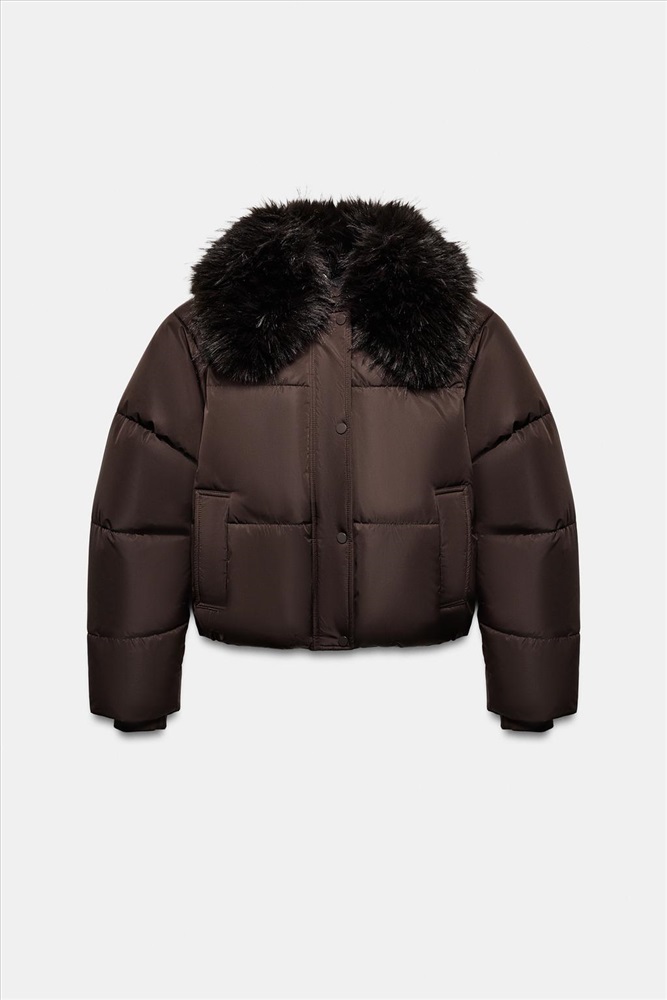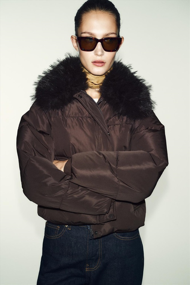 Puffer bomber jacket with a detachable faux fur lapel collar and long sleeves. Front welt pockets with an inner fleece lining. Adjustable hem with side drawstrings. Front zip and snap-button fastening. COMPOSITION, CARE & ORIGIN COMPOSITION OUTER SHELL 100% polyester LINING 100% polyester FILLING 100% polyester Which contains at least: OUTER SHELL 100% RCS certified recycled polyester LINING 100% RCS certified recycled polyester FILLING 100% RCS certified recycled polyester CERTIFIED MATERIALS RCS CERTIFIED RECYCLED POLYESTER Nowadays, recycled polyester is mainly made from PET plastic waste. This is a type of plastic that is widely used in a variety of items, such as plastic bottles. Using recycled materials helps limit the production of virgin polyester fibre. It is certified to the Recycled Claim Standard (RCS), which verifies the recycled content and tracks it from source to final product. Certified by Intertek 193341 More information CARE Caring for your garments to extend their useful life. To keep your jackets and coats clean, you only need to air them out and go over them with a cloth or a clothes brush. This process is gentler on fabrics and helps to reduce the impacts of washing.