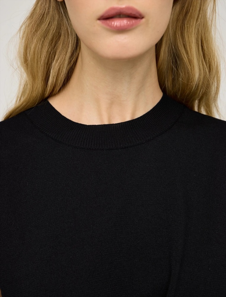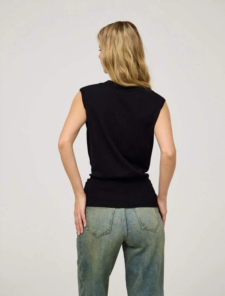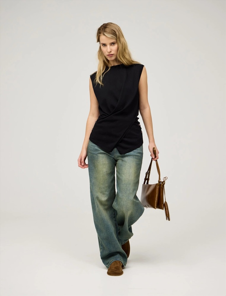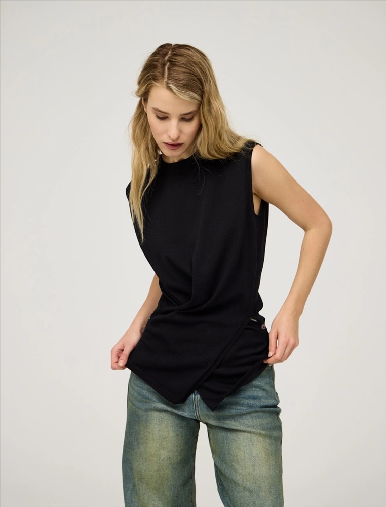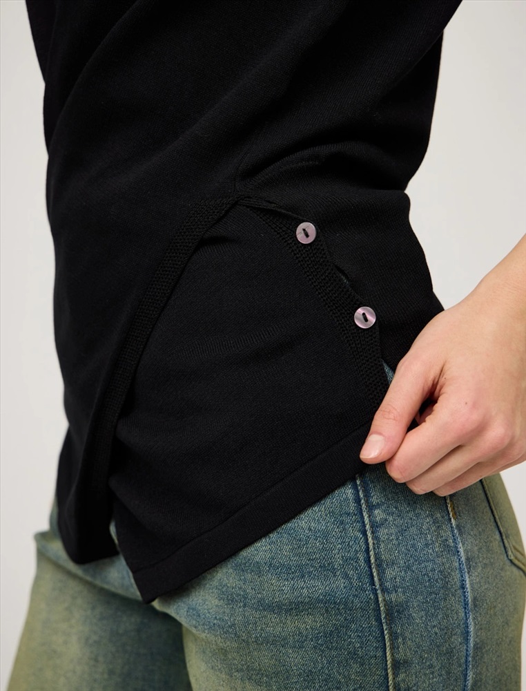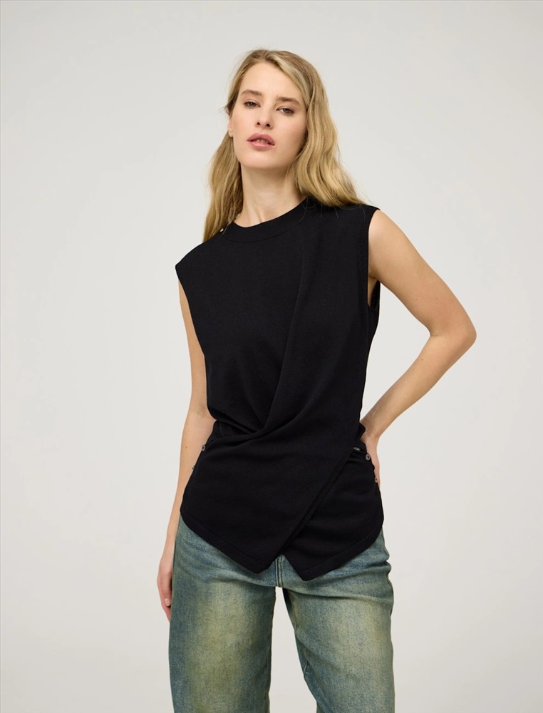 Вязаная блузка прямого силуэта, с круглой горловиной, без рукавов. По бокам — пуговицы, на которые застегивается низ блузы для создания драпировки. Эта деталь делает блузку трансформером, предлагая несколько вариантов стилизации. В составе натуральные, дышащие материалы — хлопок и лен. Представлена в черном цвете.