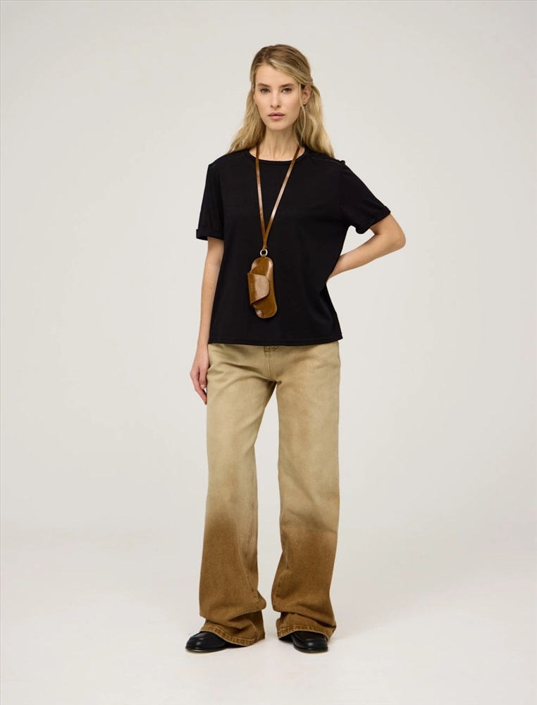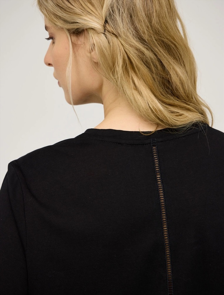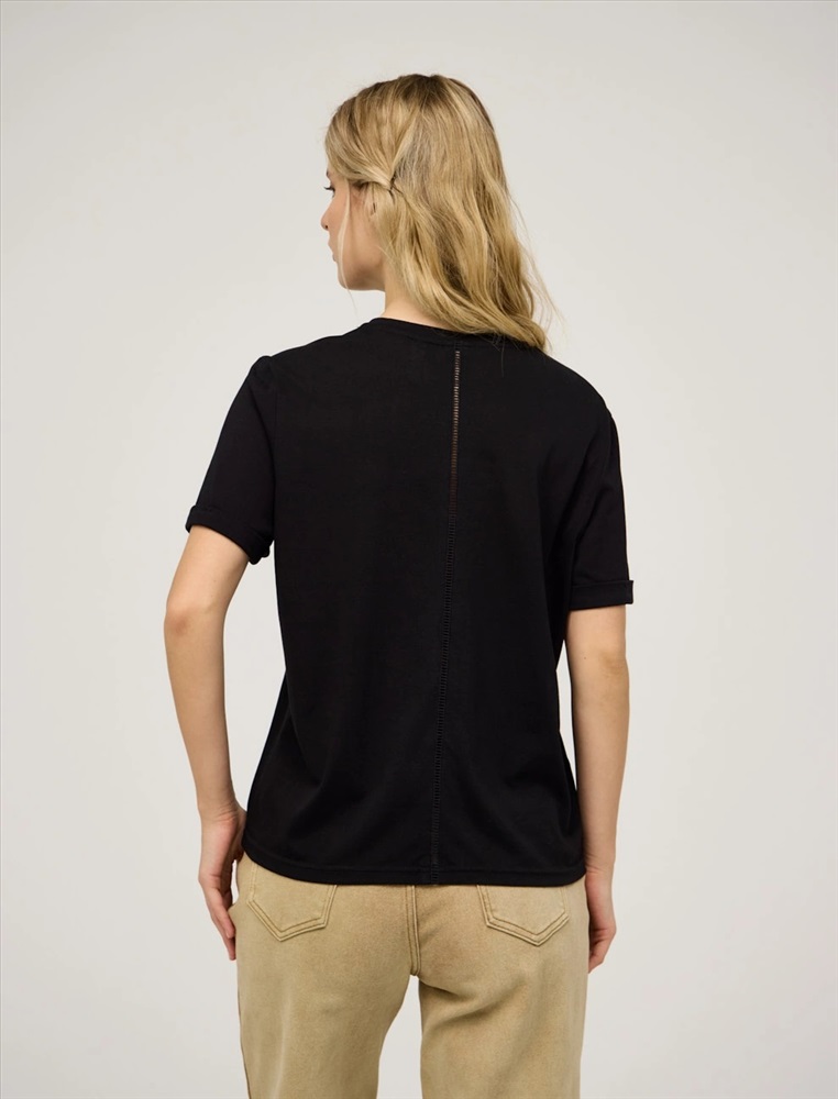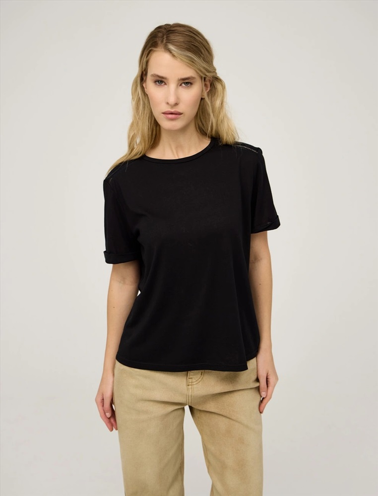 Футболка прямого силуэта с короткими рукавами и круглой горловиной. Рукава с подворотами, закрепленными закрепками. Акцентной деталью футболки являются вставки из вышивки-мережки, расположенные в районе плечевых швов и по спинке изделия. В составе футболки хлопок, лиоцелл, полиэстер и шелк, которые обеспечивают комфорт и долговечность. Представлена в светло-сером и черном оттенках.