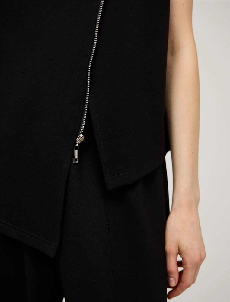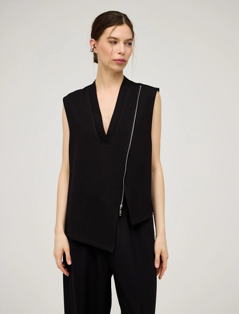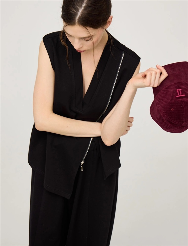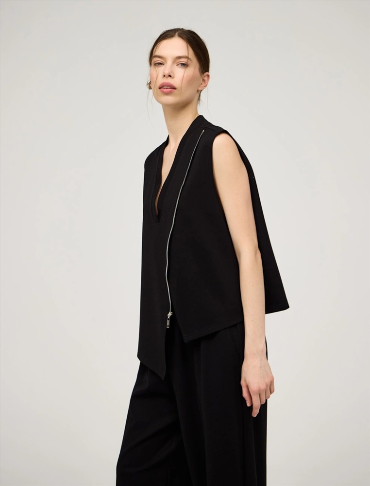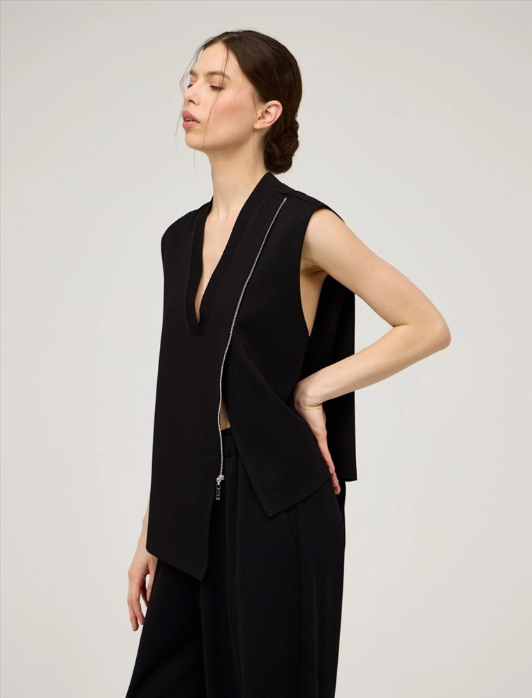 Жилет прямого силуэта с V-образной горловиной и асимметричным низом. По передней части изделия — имитация запаха и декоративная молния с пуллером. Выполнен из хлопка (95%) и спандекса, что обеспечивает комфорт и долговечность. Представлен в черном цвете.