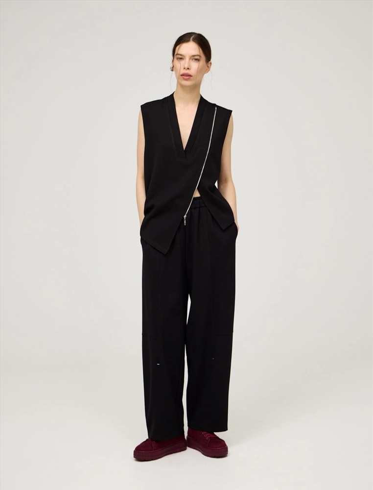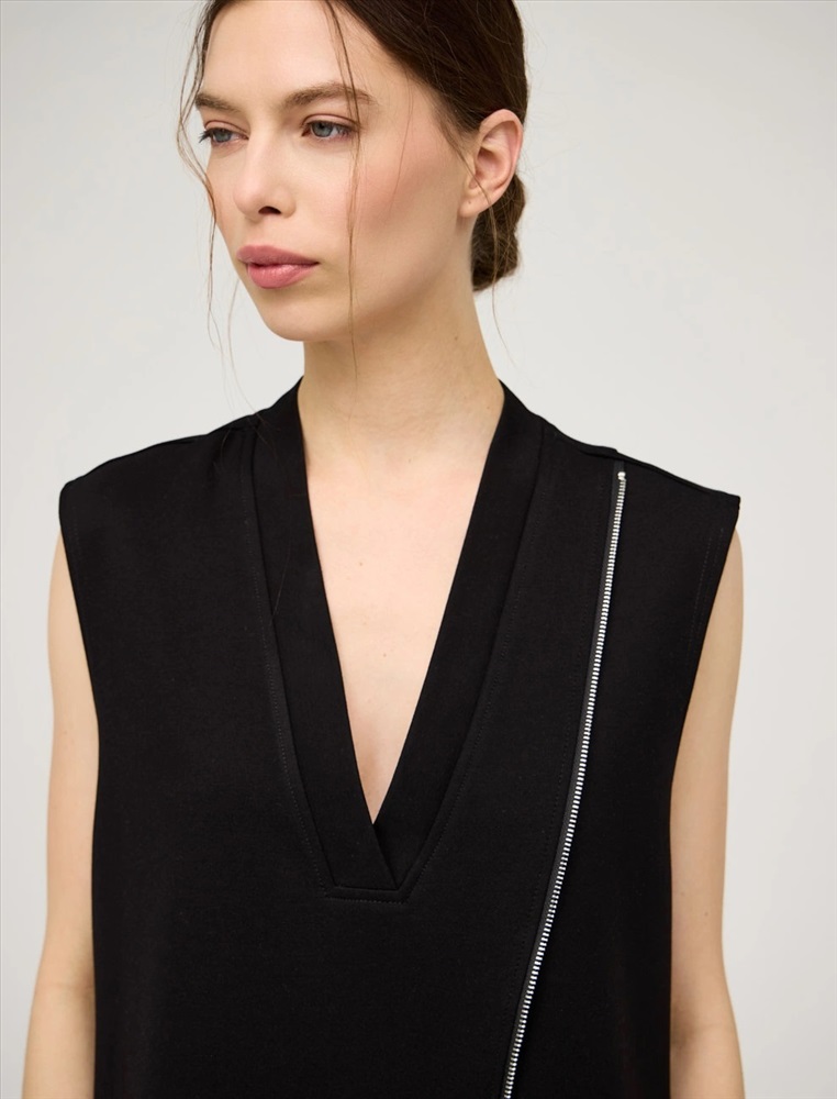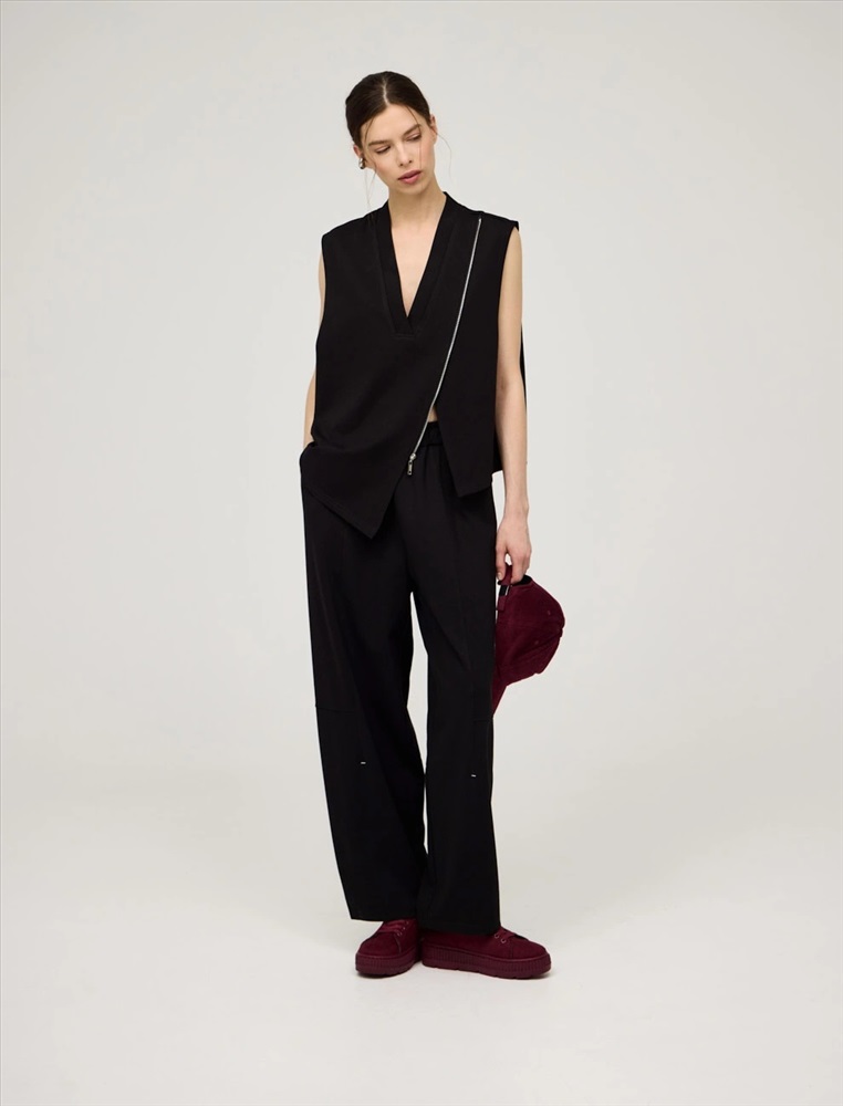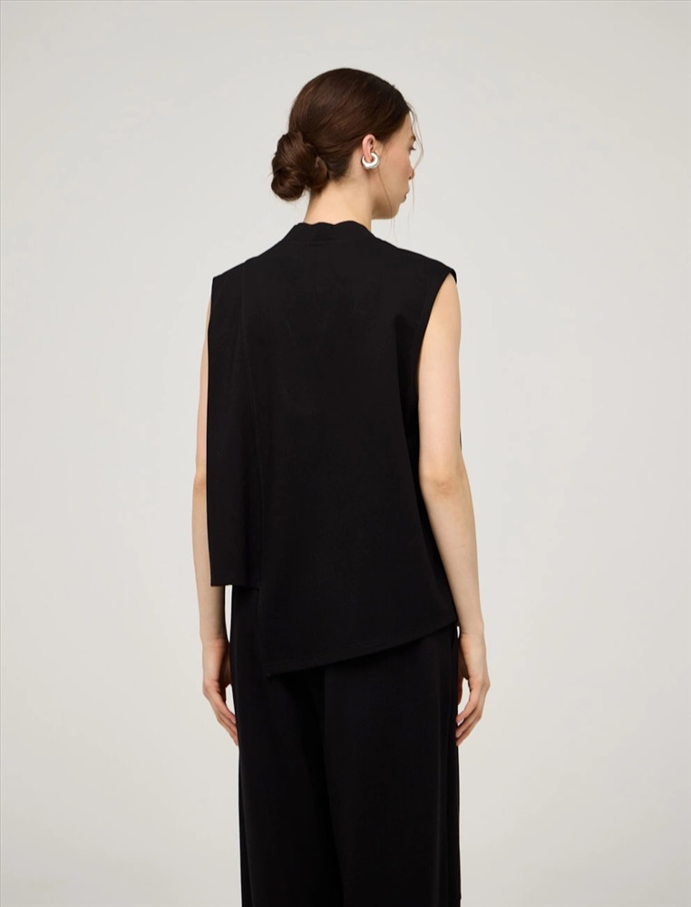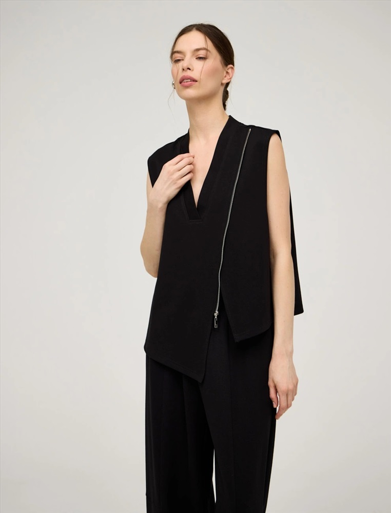 Жилет прямого силуэта с V-образной горловиной и асимметричным низом. По передней части изделия — имитация запаха и декоративная молния с пуллером. Выполнен из хлопка (95%) и спандекса, что обеспечивает комфорт и долговечность. Представлен в черном цвете.