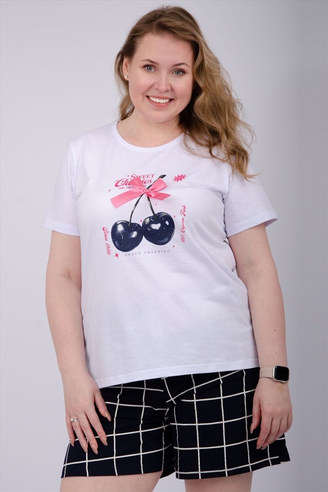 Стиль: домашний Пижама женская состоит из футболки с коротким рукавом и шортов. Футболка из однотонной кулирки с красивым принтом, шорты свободного покроя из ткани кулирка.