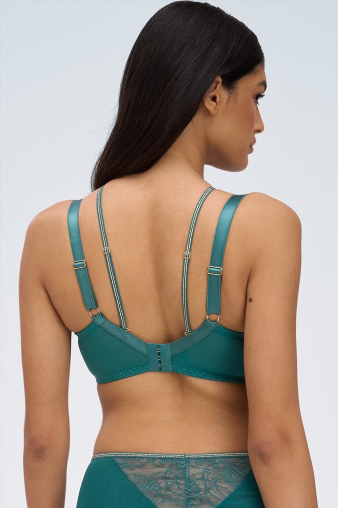 Состав: полиамид 50%, полиэстер 45%, эластан 5% Бюстгальтер из коллекции Chiara M выполнен в насыщенном летнем зелёном цвете с глубокими голубыми оттенками с мягкими чашечками на косточках, чашки шитые, из кружева, продублированы телесной сеткой, декорированы тесьмой в тон. Спинка из двух слоев стабилизирующей сетки. Бретельки регулируются по длине, не отстёгиваются. В зоне декольте дополнительные съемные тонкие бретели, регулируются по длине, крепятся между чашками и на спинке, при желании их можно перекрещивать на спине. На спине застёжка на удлинитель, количество крючков в ряду застёжки увеличивается пропорционально размеру бюстгальтера, фурнитура металлическая цвета желтого золота. Золотая люрексовая нить проходит через всю коллекцию, добавляя ей утончённого блеска и благородства. Бюстгальтер идеально сочетается с трусиками из коллекции Chiara. Комментарии к товару