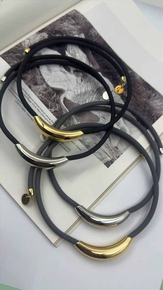 Лаконичное колье на каучуке глубокого чёрного и графитового оттенков. Металлические вставки в серебре и золоте создают баланс силы и утончённости. Чистая форма, монохром, энергия мегаполиса. В духе Balenciaga — ничего лишнего, только стиль. Комментарии к товару