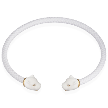 Изготовлено из ювелирного сплава на основе латуни с гальваническим покрытием золотом. Изделие украшают кристаллы SW и эмаль белого цвета. Длина колье на белом кожаном шнурке 36см.