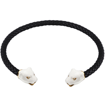 Изготовлено из ювелирного сплава на основе латуни с гальваническим покрытием золотом. Изделие украшают кристаллы SW и эмаль белого цвета. Длина колье на черном кожаном шнурке 36см.