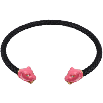 Изготовлено из ювелирного сплава на основе латуни с гальваническим покрытием золотом. Изделие украшают эмаль цвета фуксия и белые кристаллы SW. Длина колье на черном кожаном шнурке 36см.