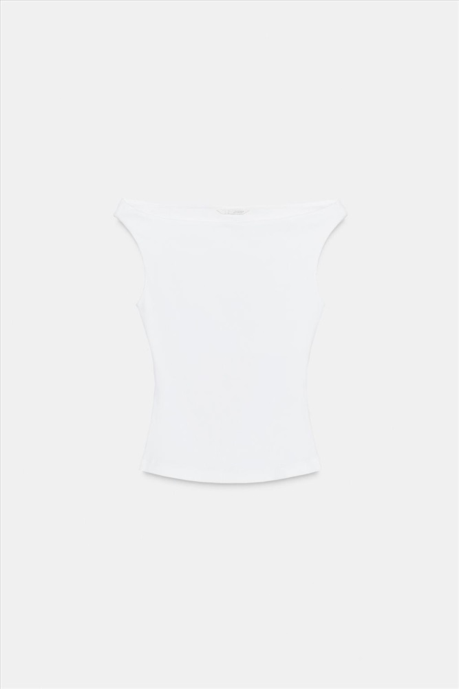 T-shirt with a straight neckline and cold-shoulder design. Ribbed fabric.