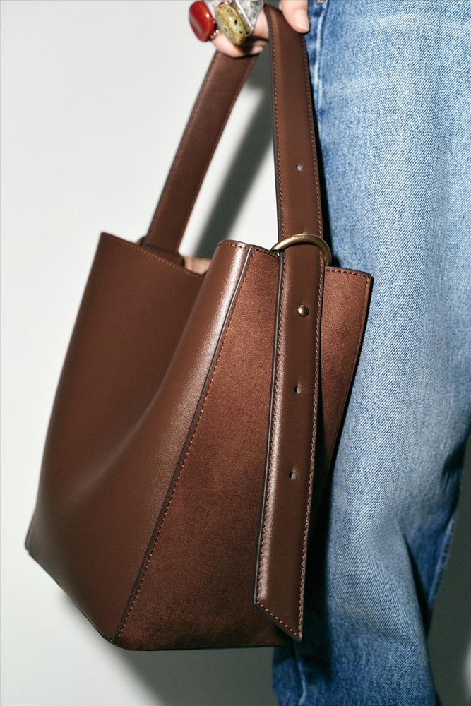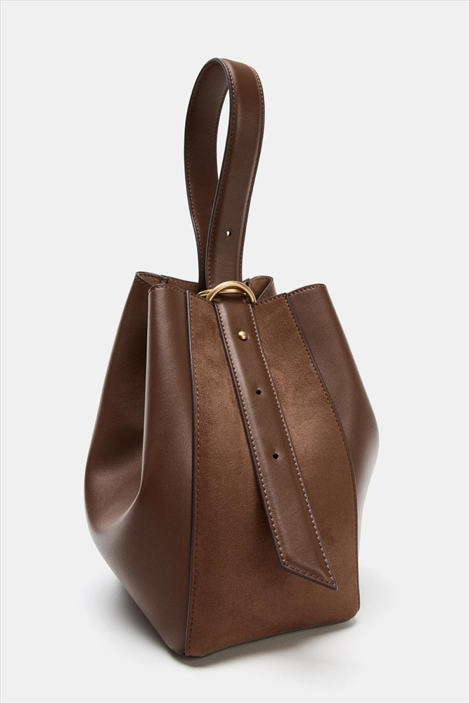 Bucket bag in a combination of materials. Shoulder strap and detachable crossbody strap. Metal details. Detachable inner bag with zip. Magnetic clasp closure. COMPOSITION, CARE & ORIGIN COMPOSITION OUTER SHELL SECONDARY FABRIC 100% polyester MAIN MATERIAL 100% polyurethane LINING 100% polyester CARE Caring for your garments to extend their useful life. Simple steps like cleaning your items with a dry cotton cloth or a soft brush, depending on the characteristics of the product, can help you care for it.