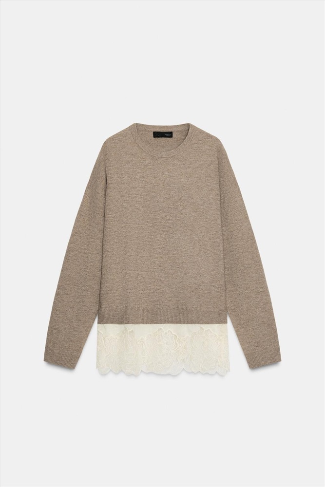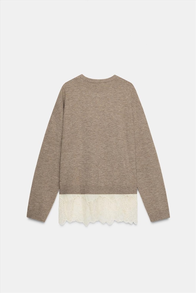 Plain knit jumper with a round neck and long sleeves. Hem finished with combined lace fabric. COMPOSITION, CARE & ORIGIN COMPOSITION OUTER SHELL MAIN FABRIC 8% wool EMBELLISHMENT 8% cotton Which contains at least: OUTER SHELL EMBELLISHMENT 5% RCS certified recycled acrylic 8% RCS certified recycled cotton 31% RCS certified recycled polyester MAIN FABRIC 18% RCS certified recycled acrylic 67% RCS certified recycled polyester CERTIFIED MATERIALS RCS CERTIFIED RECYCLED POLYESTER Nowadays, recycled polyester is mainly made from PET plastic waste. This is a type of plastic that is widely used in a variety of items, such as plastic bottles. Using recycled materials helps limit the production of virgin polyester fibre. It is certified to the Recycled Claim Standard (RCS), which verifies the recycled content and tracks it from source to final product. Certified by Intertek 193341 More information RCS CERTIFIED RECYCLED COTTON This fibre is made from recycled cotton textile waste. Using recycled materials helps limit the consumption of raw materials. It is certified to the Recycled Claim Standard (RCS), which verifies the recycled content and tracks it from source to final product. Certified by Intertek 193341 More information RCS CERTIFIED RECYCLED ACRYLIC This material is made from recycled acrylic waste from other production processes. Transforming waste into new materials helps limit the extraction of raw materials. It is certified to the Recycled Claim Standard (RCS), which verifies the recycled content and tracks it from source to final product. Certified by Intertek 193341 More information CARE Caring for your garments to extend their useful life. Lower temperature washes and delicate spin cycles are gentler on garments and help to protect the colour, shape and structure of the fabric.