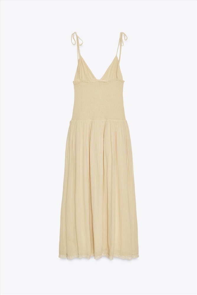 Midi dress with a V-neck and thin straps with tie detail. Contrast elasticated smocked fabric. Contrast lining. COMPOSITION, CARE & ORIGIN COMPOSITION OUTER SHELL 100% cotton LINING 100% cotton Which contains at least: OUTER SHELL 100% OCS certified organically grown cotton CERTIFIED MATERIALS OCS CERTIFIED ORGANICALLY GROWN COTTON This fibre is produced using no artificial fertilisers or pesticides and is grown from seeds that have not been genetically modified. We are currently working with the Organic Content Standard (OCS) that monitors the process from the source to the end product. Certified by Intertek 193341 More information CARE Caring for your garments to extend their useful life. Lower temperature washes and delicate spin cycles are gentler on garments and help to protect the colour, shape and structure of the fabric.