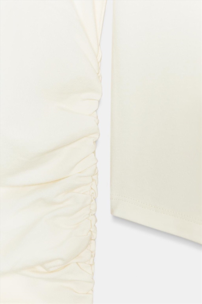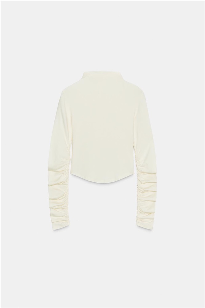T-shirt made from a cotton and modal blend. Featuring a high neck and long sleeves with ruching. COMPOSITION, CARE & ORIGIN COMPOSITION OUTER SHELL 50% cotton Which contains at least: OUTER SHELL 50% OCS certified organically grown cotton CERTIFIED MATERIALS OCS CERTIFIED ORGANICALLY GROWN COTTON This fibre is produced using no artificial fertilisers or pesticides and is grown from seeds that have not been genetically modified. We are currently working with the Organic Content Standard (OCS) that monitors the process from the source to the end product. Certified by Intertek 193341 More information CARE Caring for your garments to extend their useful life. Lower temperature washes and delicate spin cycles are gentler on garments and help to protect the colour, shape and structure of the fabric.