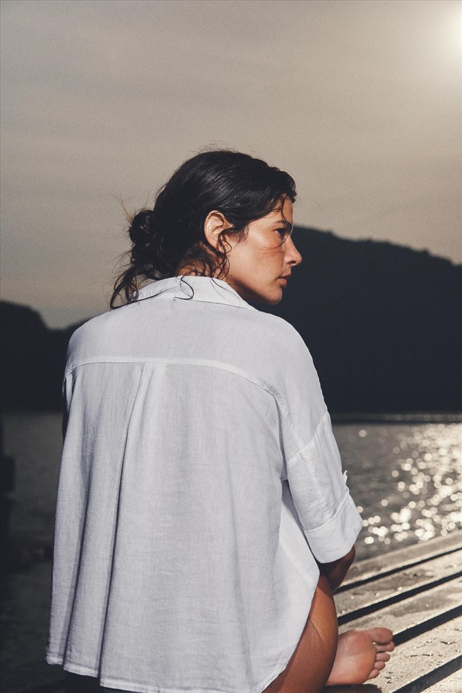 Linen shirt with a revere collar and v-neck, short sleeves, front patch pockets and button fastening.