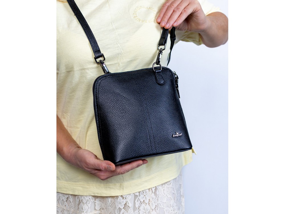 Длинный ремень с возможностью регулировки. Внутри: два отделения, между ними перегородка в виде кармана на молнии. Дополнительно два кармана для аксессуаров, один из которых застегивается на молнию. Снаружи: сзади карман для мелочей на молнии.