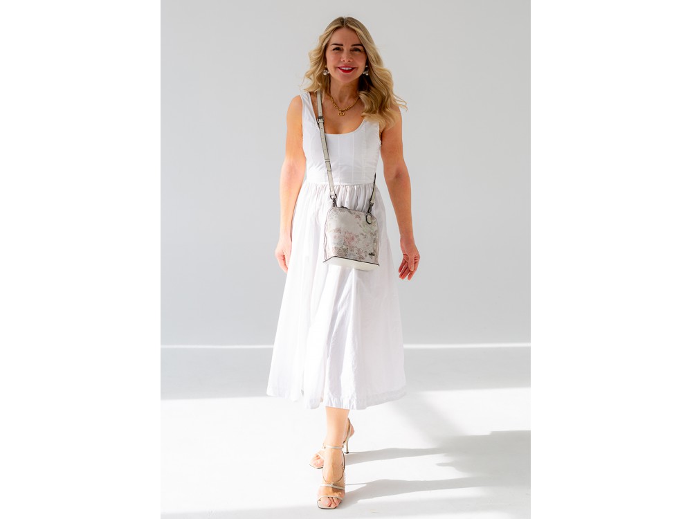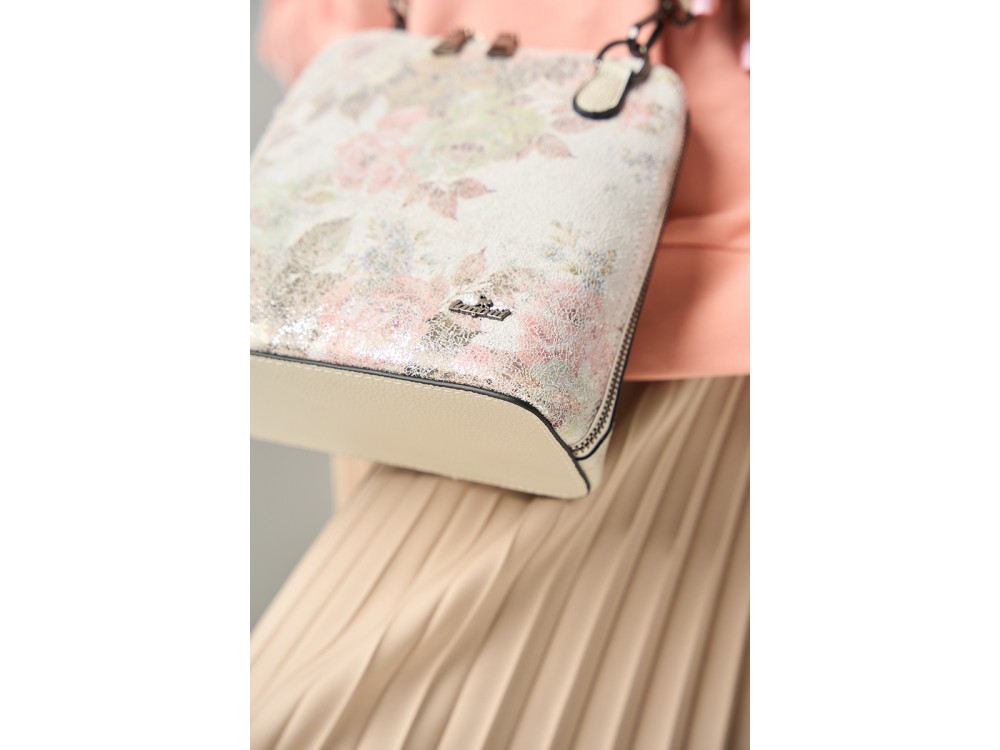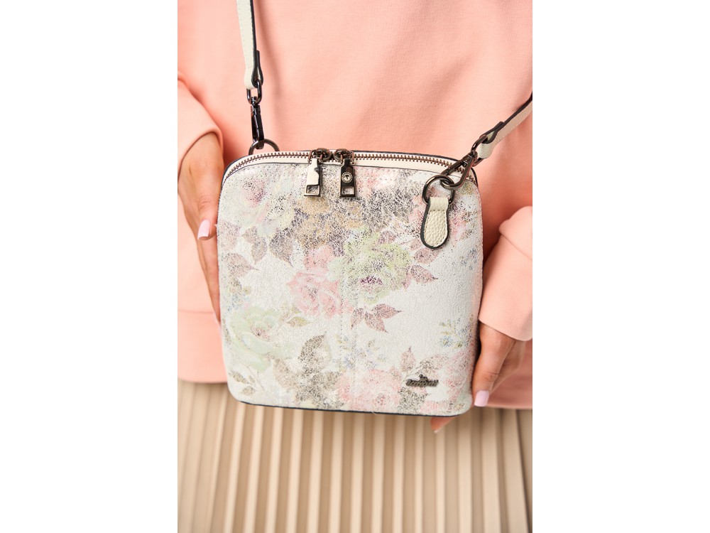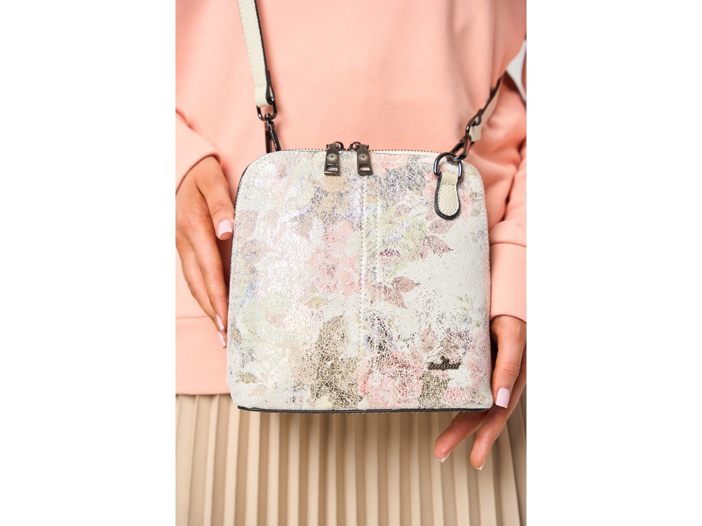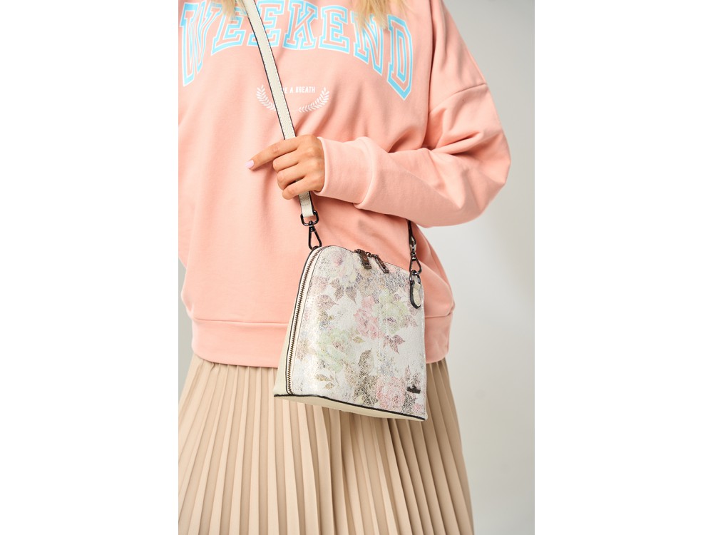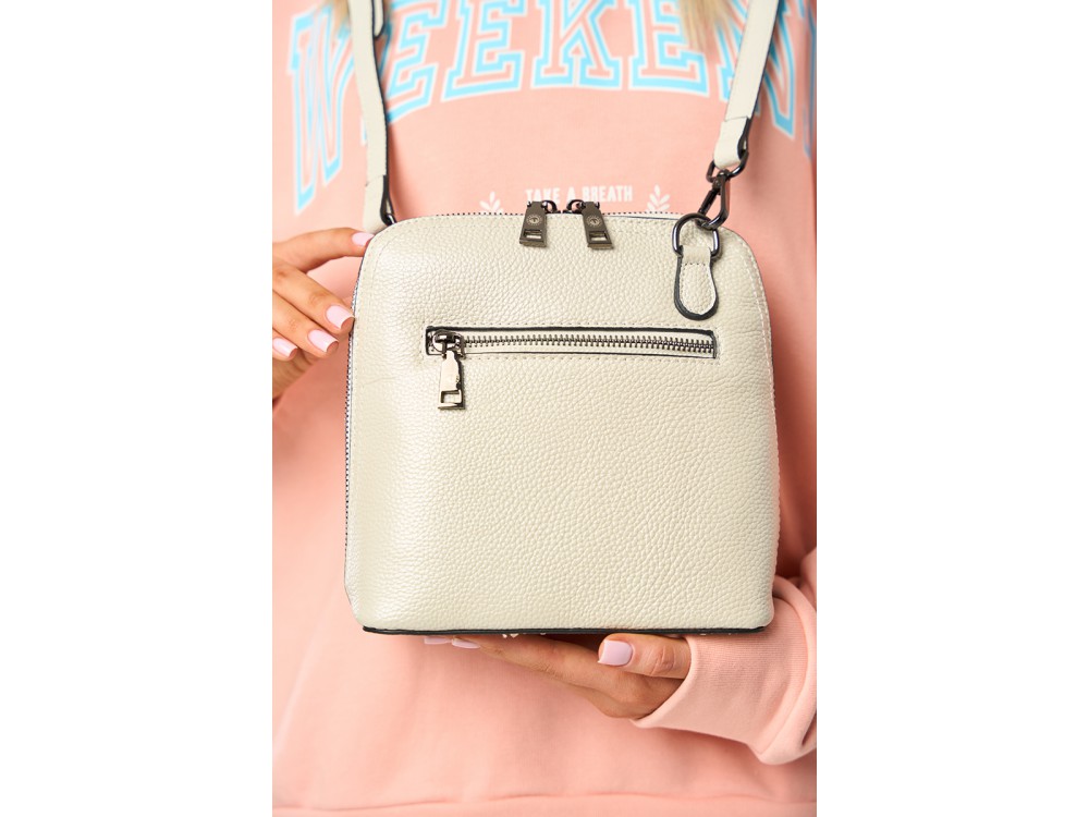 Белый цвет с легким эффектом перламутра. В комплекте длинный ремень с возможностью регулировки. Внутри: два отделения, между ними перегородка в виде кармана на молнии. Дополнительно два кармана для аксессуаров, один из которых застегивается на молнию. Снаружи: сзади карман для мелочей на молнии.