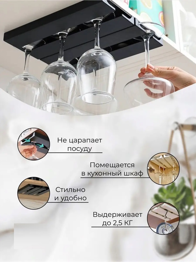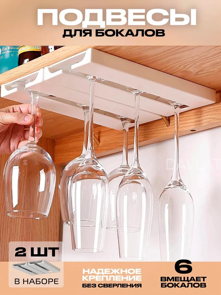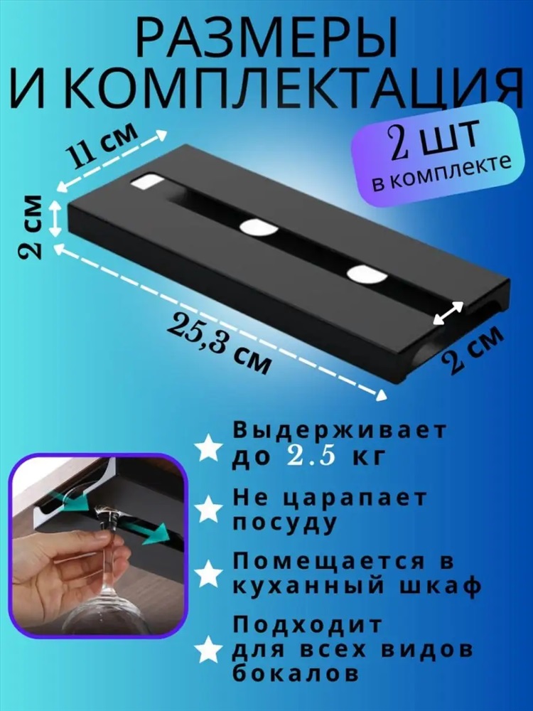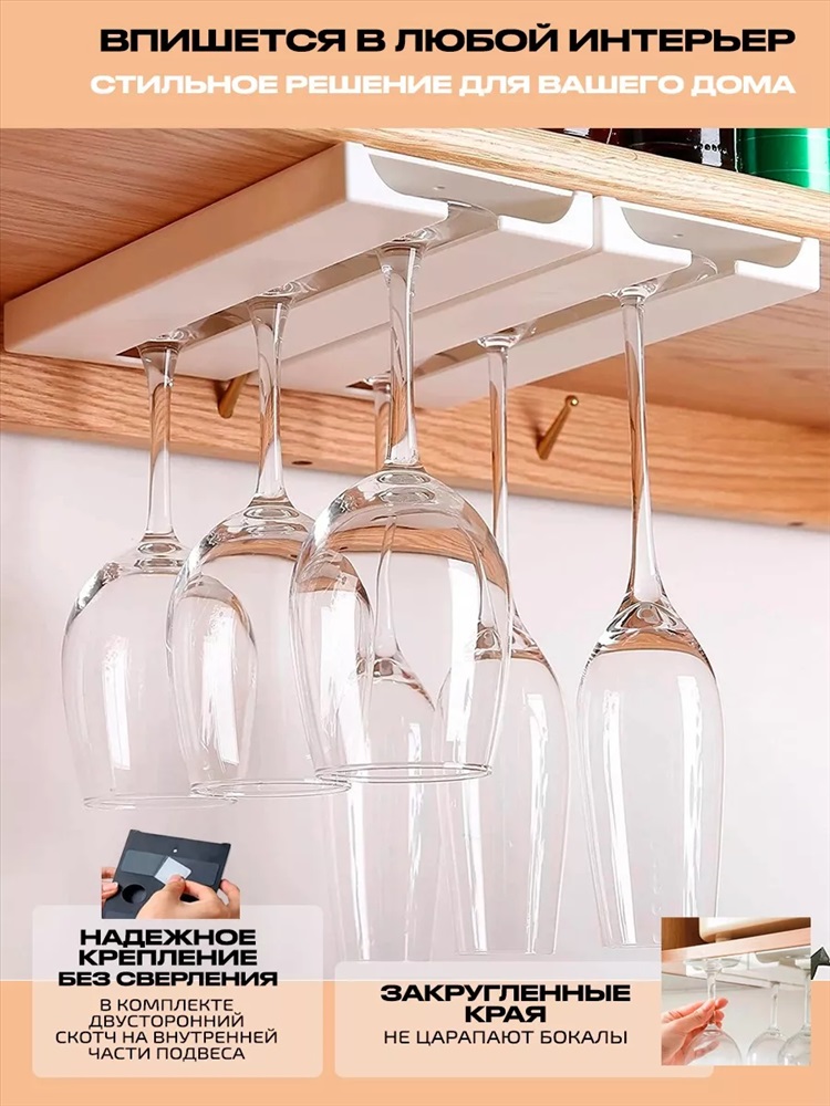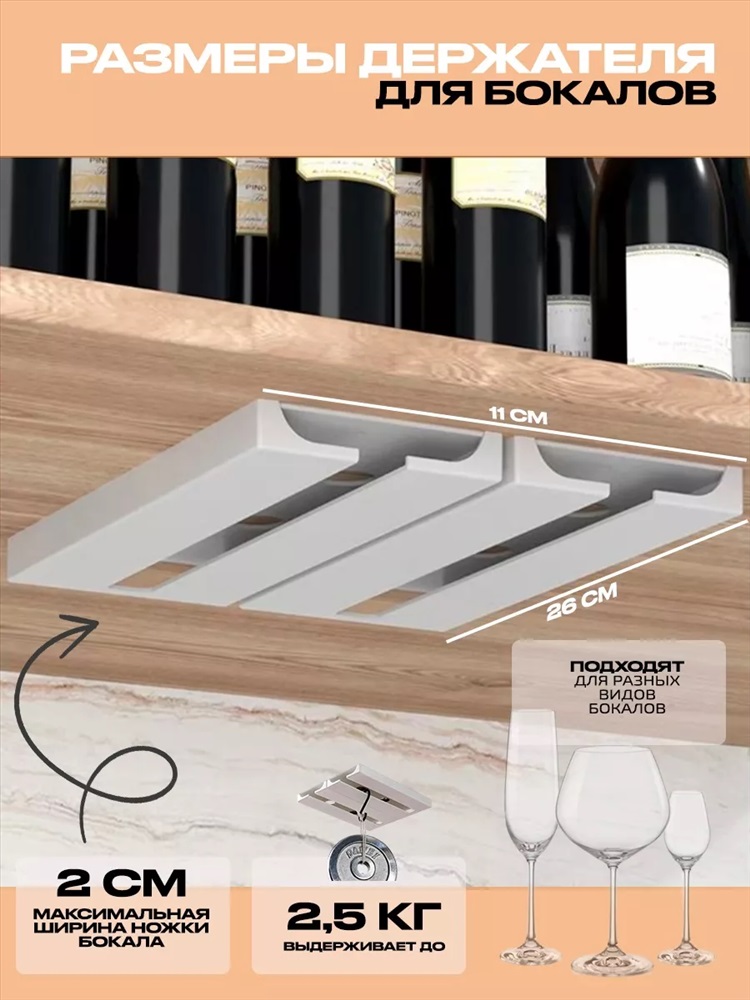 Модель: Держатель для бокалов подвесной 60287 Тип товара: держатель для бокалов Бренд: Натали Суслова Держатель для винных бокалов крепится без гвоздей, шурупов и сверления. Этот красивый, стильный, удобный органайзер для бокалов выдерживает нагрузку до 2,5 кг. Бакалодержатель подойдет для бокалов с любым диаметром ножки. Подвесной держатель для фужеров можно разместить внутри или снаружи кухонного шкафа. Вместимость двух держателей до 6 бокалов. Держатель представлен в двух цветах : белый и черный. Легко крепится на 2 клейкие пластины. Наклейка не оставляет следов на мебели. Закругленные концы не повредят руки и посуду. С помощью подвесной полки для бокалов вы можете сушить фужеры без пятен и развозов. Наши держатели дополнят интерьер вашей кухни и сделают хранение бокалов удобным. Навесной держатель для винных бокалов сэкономит место в шкафу. Таблица размеров и веса