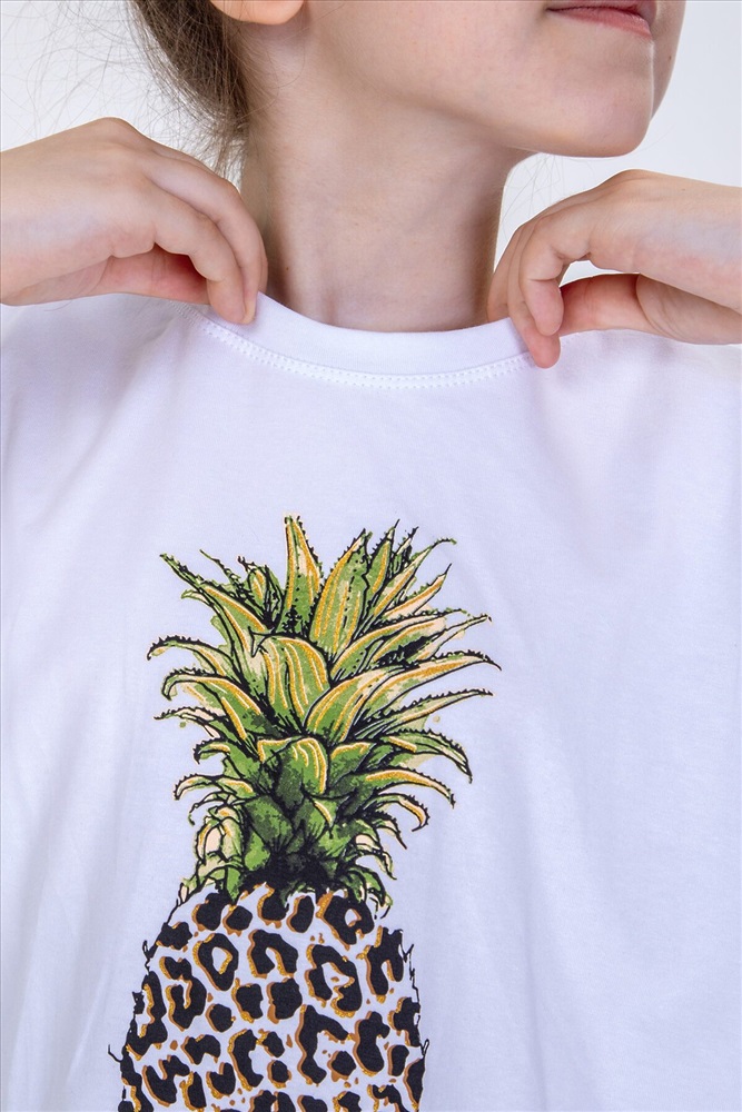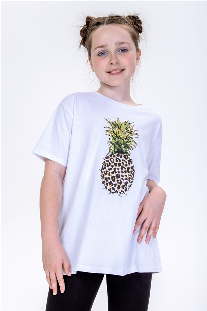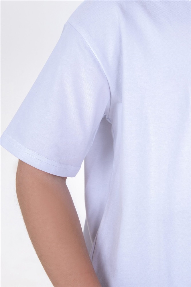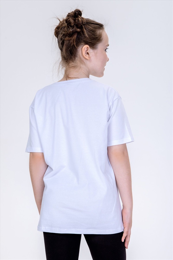 Футболка для девочек младшего школьного возраста, из однотонного трикотажного полотна кулирка с лайкрой. Футболка свободного, прямого силуэта, со спущенным плечом, с втачным рукавом, с обтачкой в горловине. Спереди и на спинке отсутствуют линии членения. Рукав одношовный. Низа рукавов и изделия подогнуты. По шву втачивания обтачки в горловину проложена отделочная строчка. Спереди нанесен печатный рисунок.