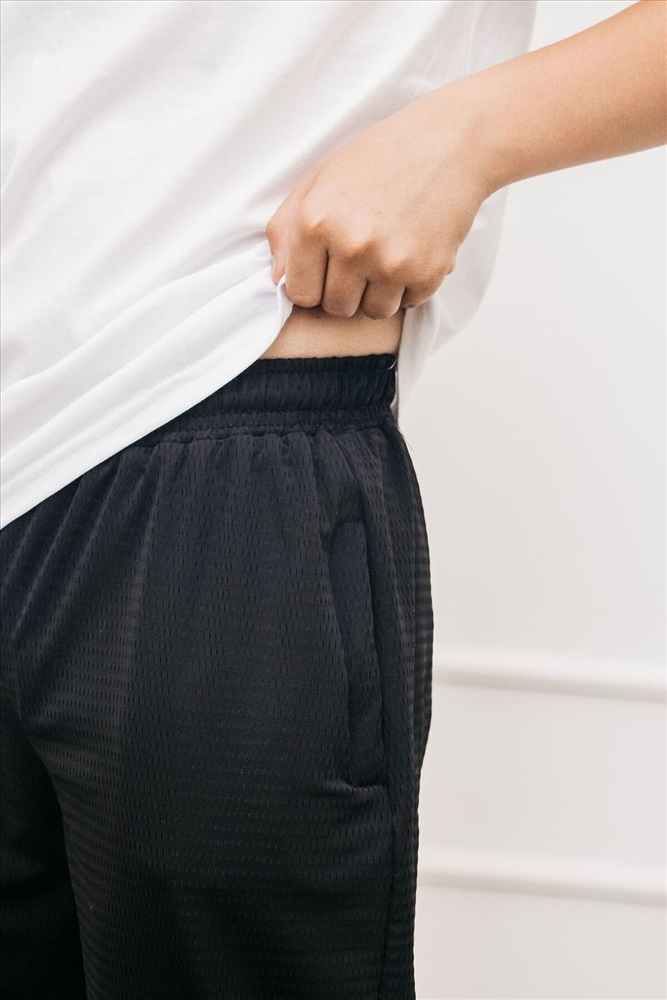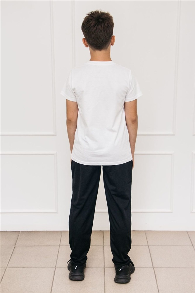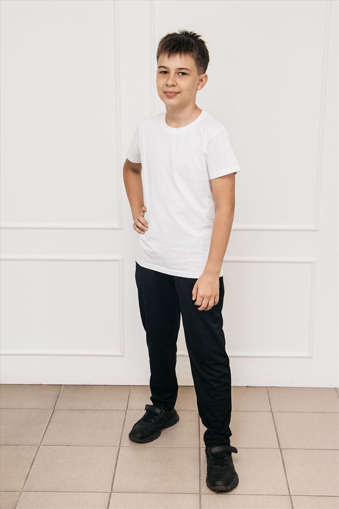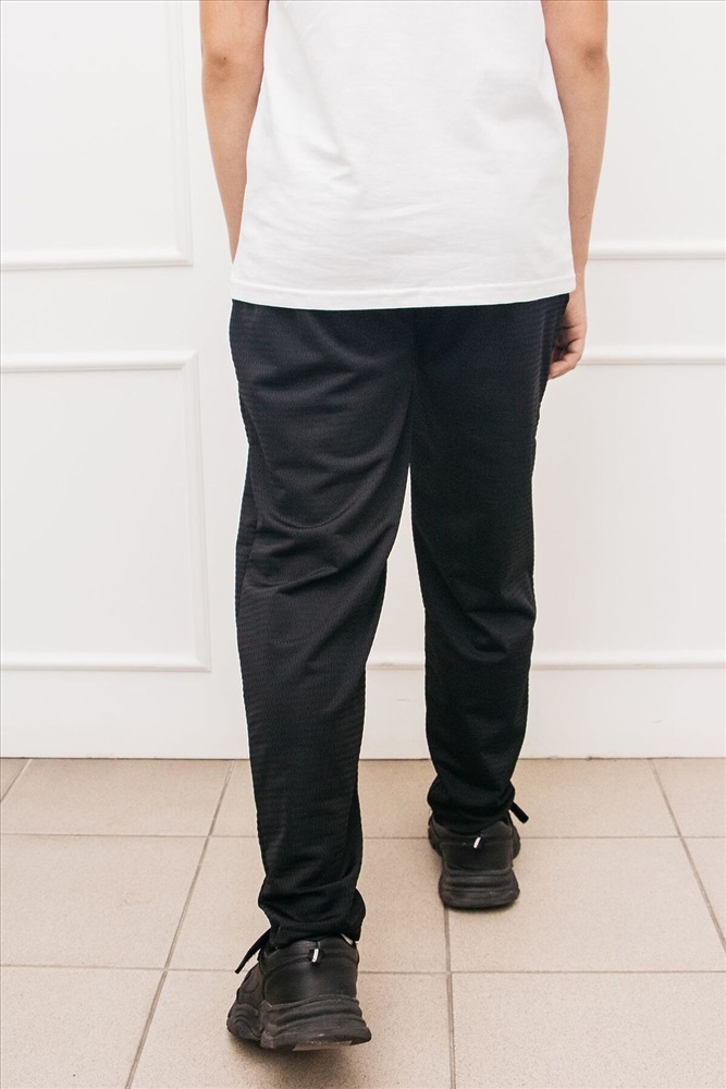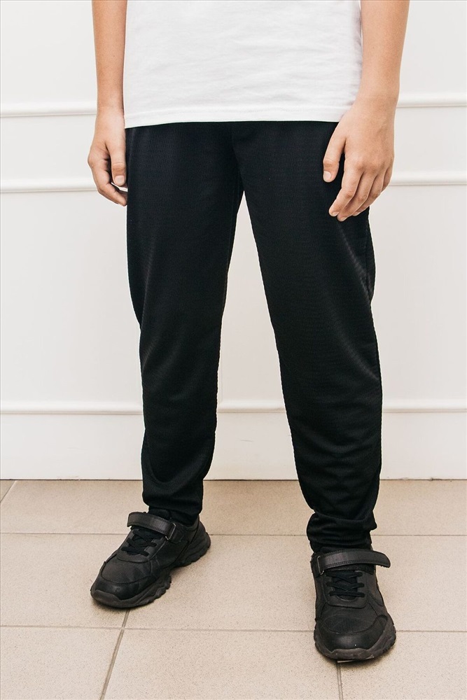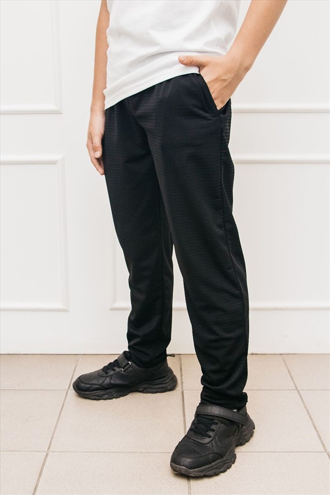 Брюки детские из полотна холодок-сетка прямого силуэта. Пояс отрезной, выполнен из основного полотна, с эластичной тесьмой внутри. Внутри пояса брюк вставлен плоский утягивающий шнурок с пластиковым наконечником. На уровне бедер выполнены карманы с прорезной листочкой, вход в карман с замком. По низу изделия цельнокроеные манжеты на резинки.