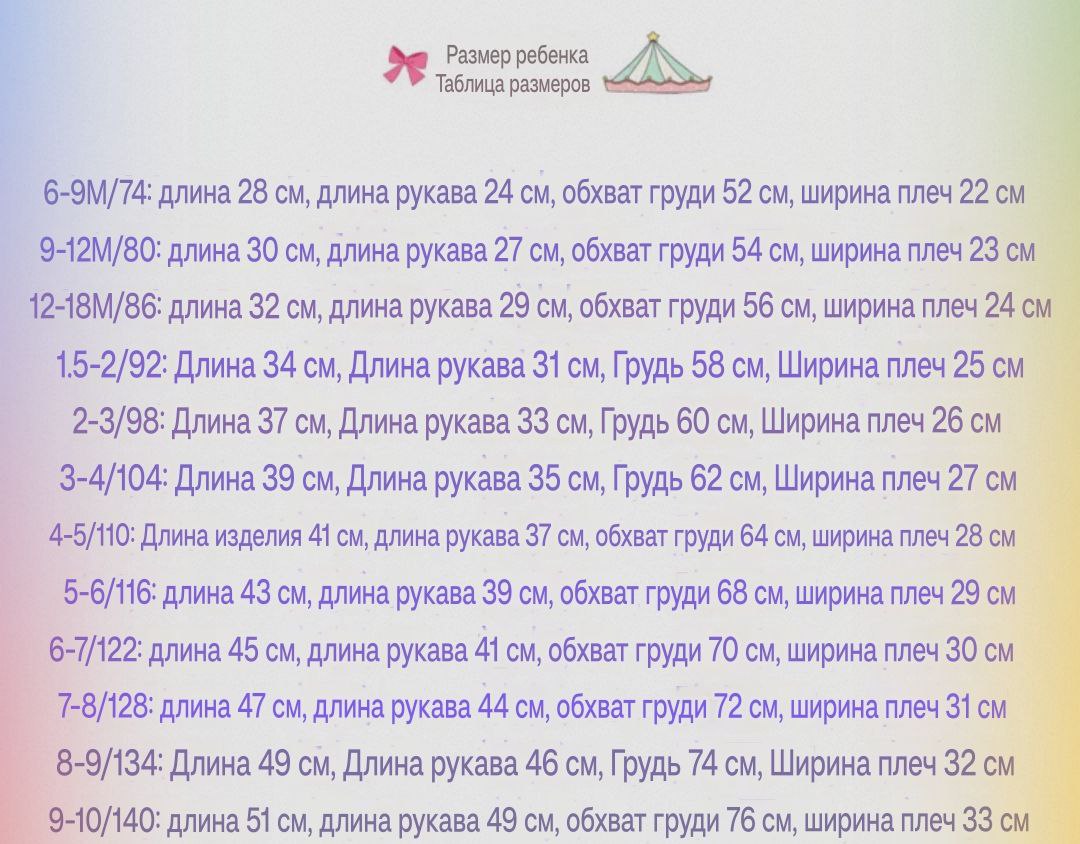 Размер: желтый 6-9м/74, 9-12м/80, 12-18м/86 1,5-2/92, 2-3/98, 3-4/104, 4-5/110, 7-8/128 Комментарии к товару