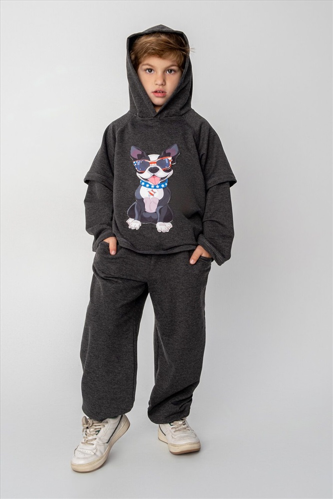 Костюм из мягкого футера двунитки. Свободный крой, стильная худи с капюшоном, прямые брюки с боковыми карманами. Подходит для прогулок, садика, а также для дома. Легкий в уходе, после стирки не деформируется и не пилингуется.