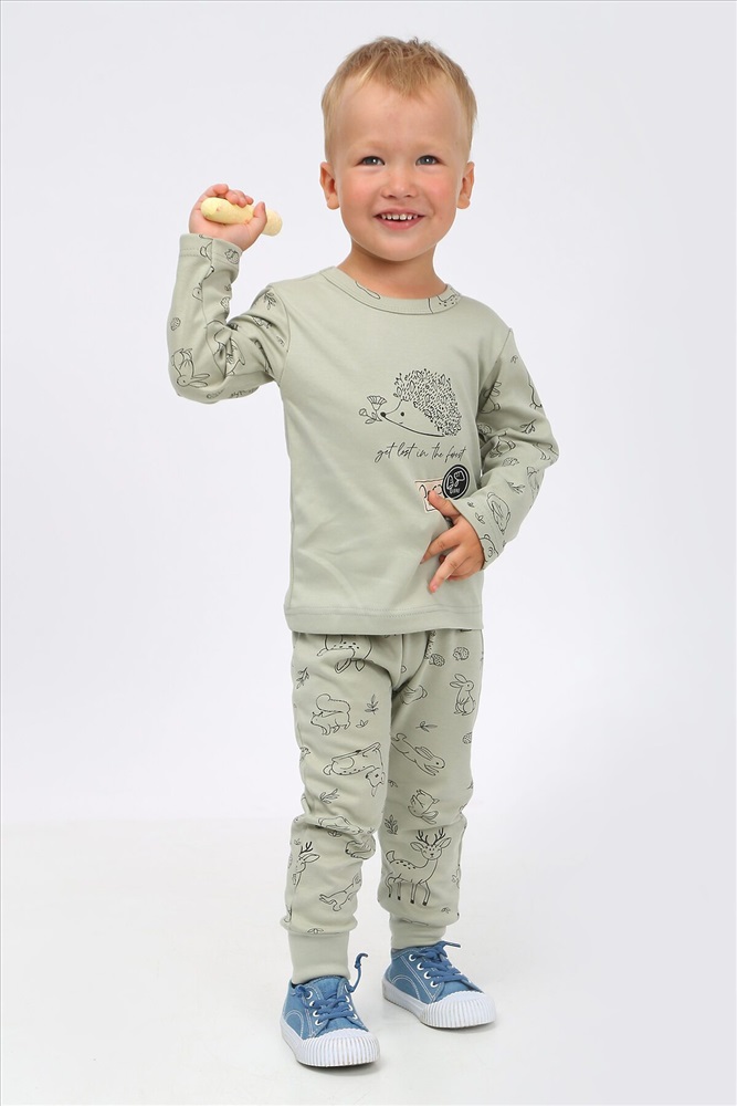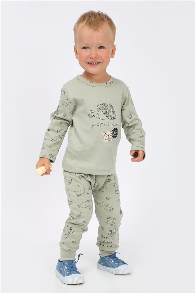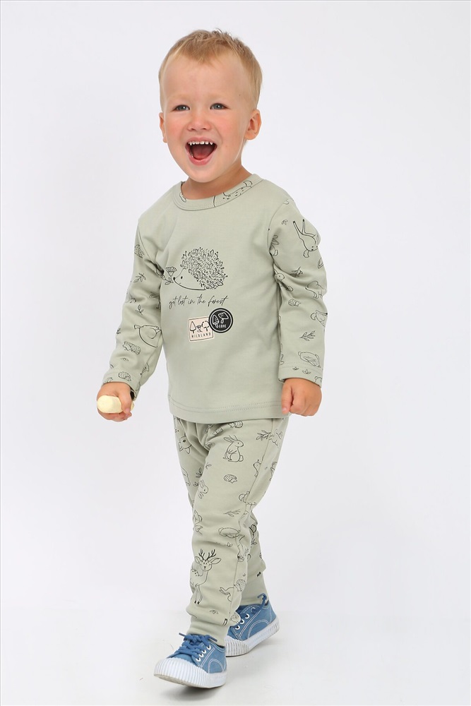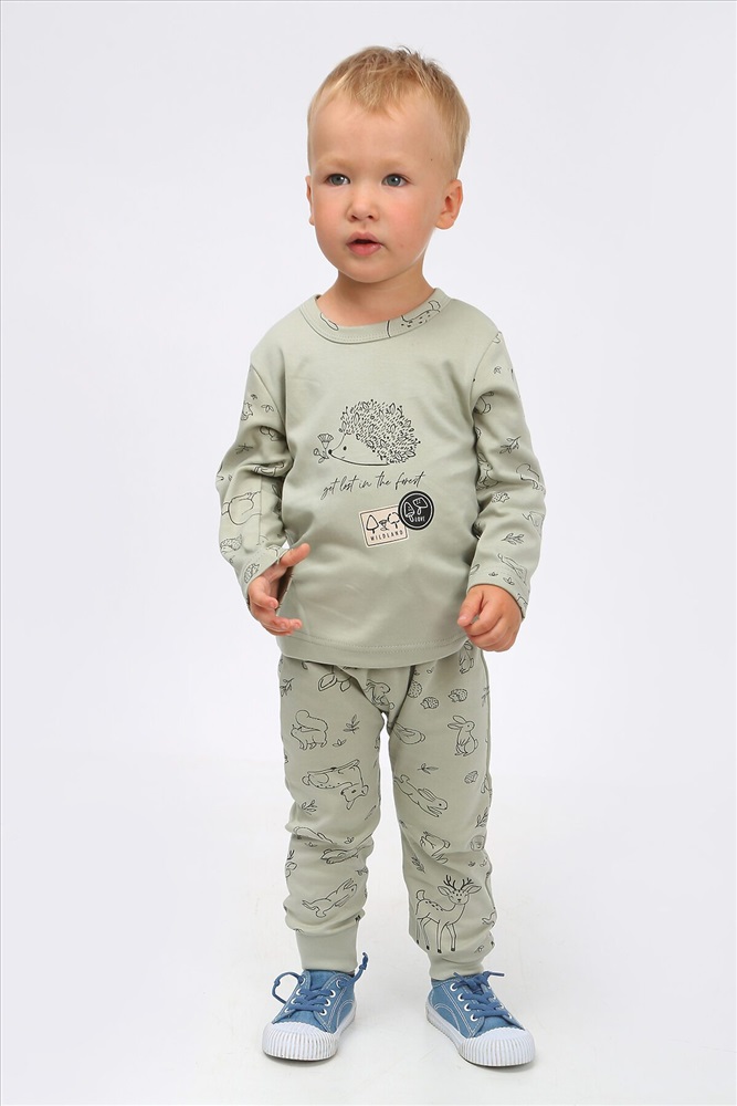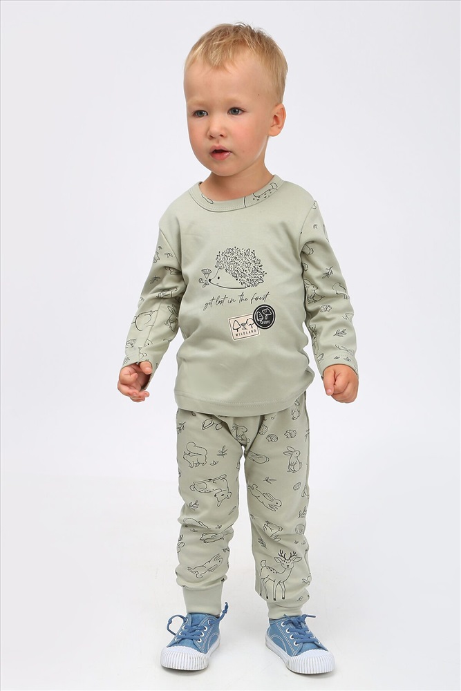 Стильный костюм для самых маленьких и немного постарше детишек, из нежного, мягкого, приятного к телу трикотажа-интерлока. Ткань 100% хлопок. Абсолютно гипоалергенна. Застежка на кнопках, свободный крой. Материал высокого качества сохраняет форму и легко стирается. Хлопок обеспечивает отличную терморегуляцию и воздухообмен, чтобы ребенок не потел. В такой одежде Ваш малыш всегда будет чувствовать себя комфортно и уютно. Лонгслив с длинным рукавом и интересной печатью, повторяющей основной рисунок. Удобные не стесняющие штанишки на широком поясе с манжетами по низу. На поясе шнурок. Отлично подойдет для повседневных прогулок, в детский садик или в качестве домашнего костюма