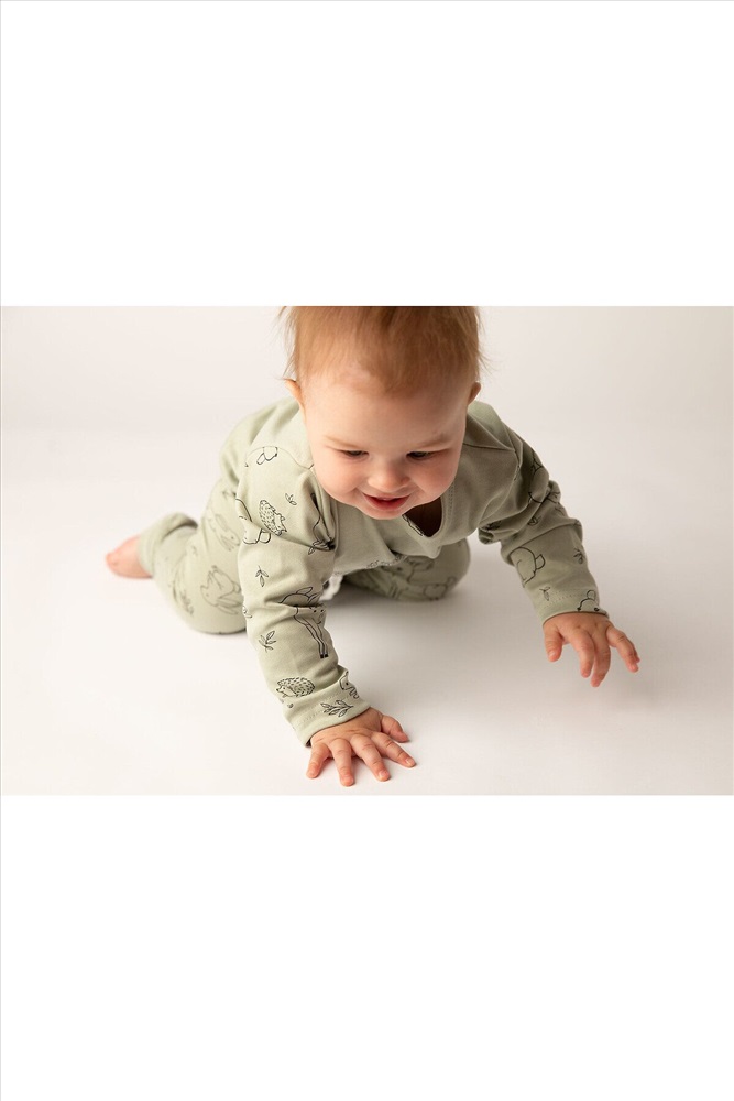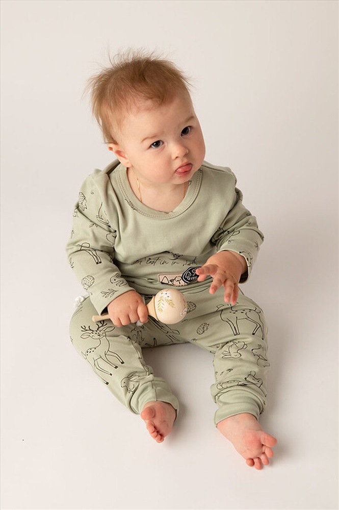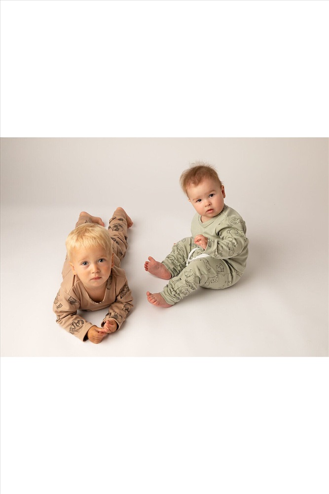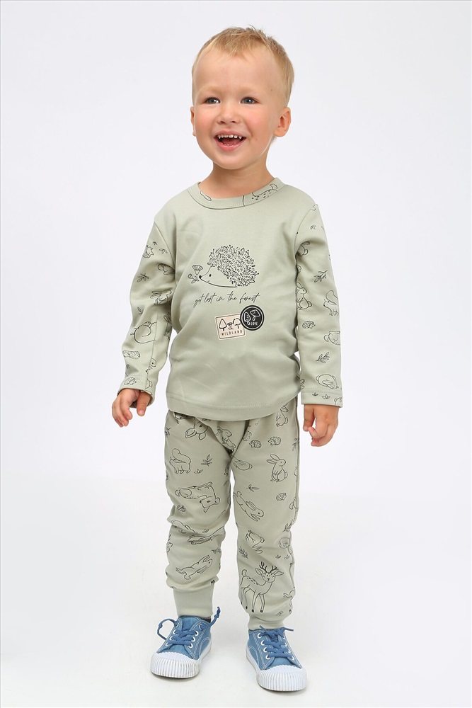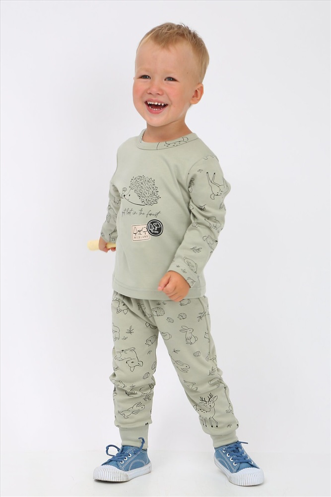 Стильный костюм для самых маленьких и немного постарше детишек, из нежного, мягкого, приятного к телу трикотажа-интерлока. Ткань 100% хлопок. Абсолютно гипоалергенна. Застежка на кнопках, свободный крой. Материал высокого качества сохраняет форму и легко стирается. Хлопок обеспечивает отличную терморегуляцию и воздухообмен, чтобы ребенок не потел. В такой одежде Ваш малыш всегда будет чувствовать себя комфортно и уютно. Лонгслив с длинным рукавом и интересной печатью, повторяющей основной рисунок. Удобные не стесняющие штанишки на широком поясе с манжетами по низу. На поясе шнурок. Отлично подойдет для повседневных прогулок, в детский садик или в качестве домашнего костюма