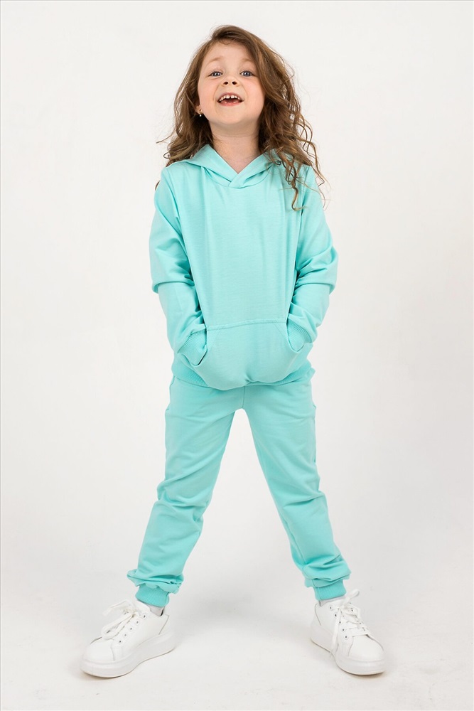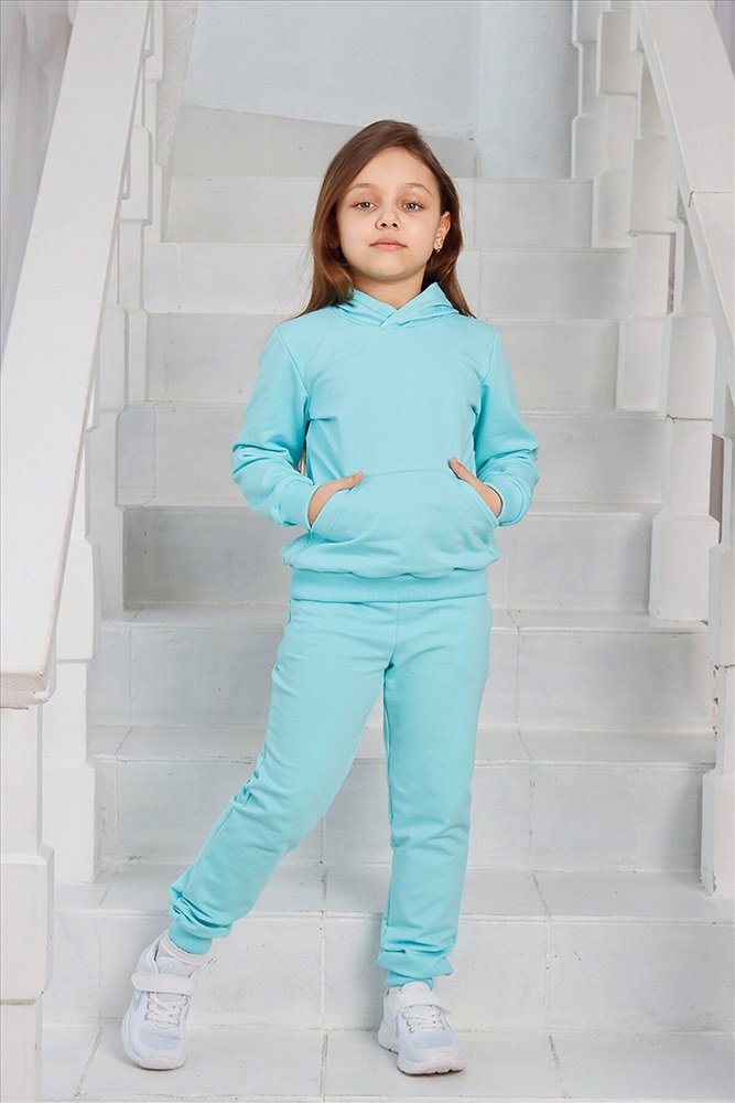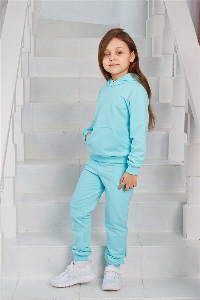Страна производства: Россия Костюм для девочек дошкольного и младшего школьного возраста. Костюм состоит из толстовки и штанов. Костюм из трикотажного эластичного хлопкового однотонного полотна футер . Толстовка с капюшоном, с длинным рукавом на манжете и поясе из основного полотна. На переде толстовки расположен карман-кенгуру. Штаны с боковыми карманами, на манжетах и поясе из основного полотна.