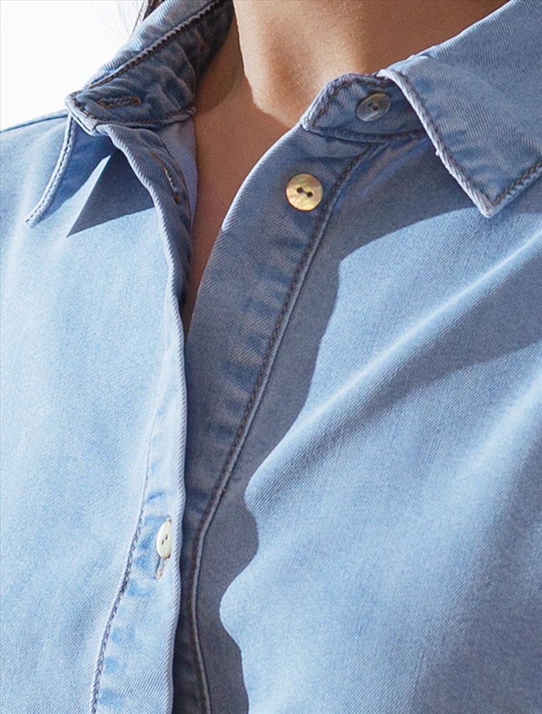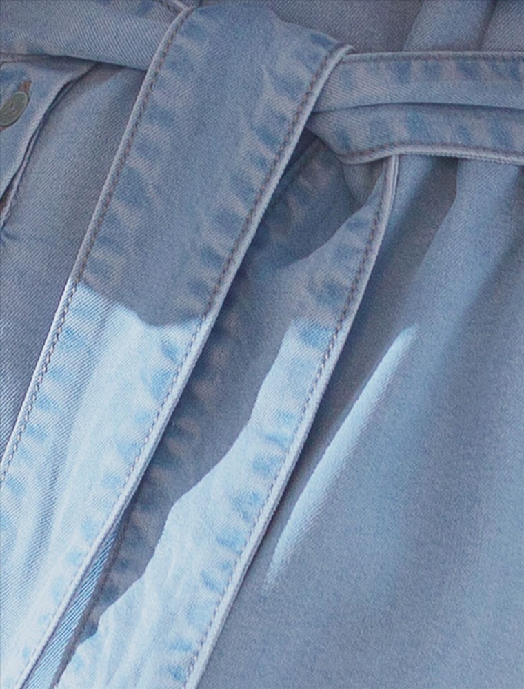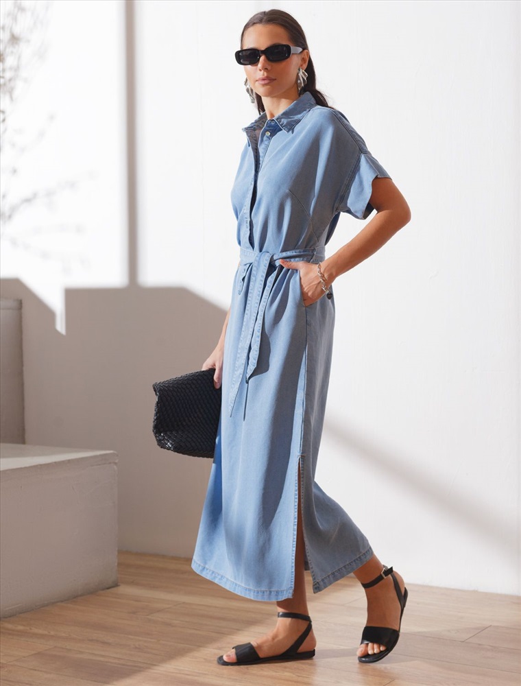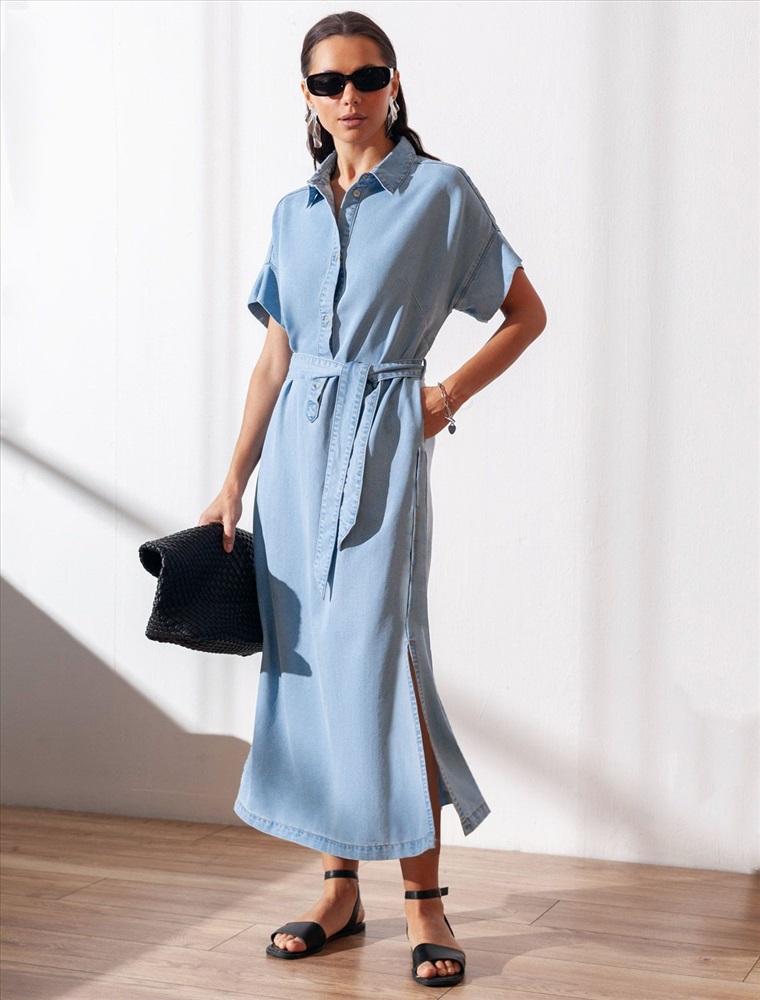Джинсовое длинное платье-рубашка плотностью 7,8 OZ светло-голубого цвета с поясом и разрезами — универсальное решение для современного гардероба. Модель легко вписывается как в повседневный, так и в деловой стиль. Пояс отлично подчеркивает талию, а цельнокроеный рукав добавляет комфорта. Высокие разрезы по бокам обеспечивают свободу движений, добавляют динамики образу и стиля. Особенность этого платья - состав ткани, сочетающая прочность и мягкость лиоцелла с вискозой, что делает её невероятно комфортной, дышащей,, устойчивой к сминанию и идеально подходящей для чувствительной кожи. Благодаря нежным тактильтным ощущениям, будто шелк, от которого ощущается приятная прохлада, легкое платье подойдет на теплое время года и даже на жаркое лето. Повседневное платье с коротким рукавом подходит на большие размеры и способно подчеркнуть красоту любой фигуры. Продуманный свободный крой платья с отложным воротничком отлично садится на разные типы телосложения, создавая аккуратный и современный образ. Классический силуэт сочетается с различными аксессуарами, что делает платье на пуговицах универсальным выбором для повседневной носки и особых случаев.