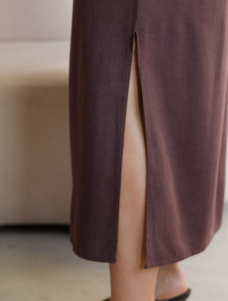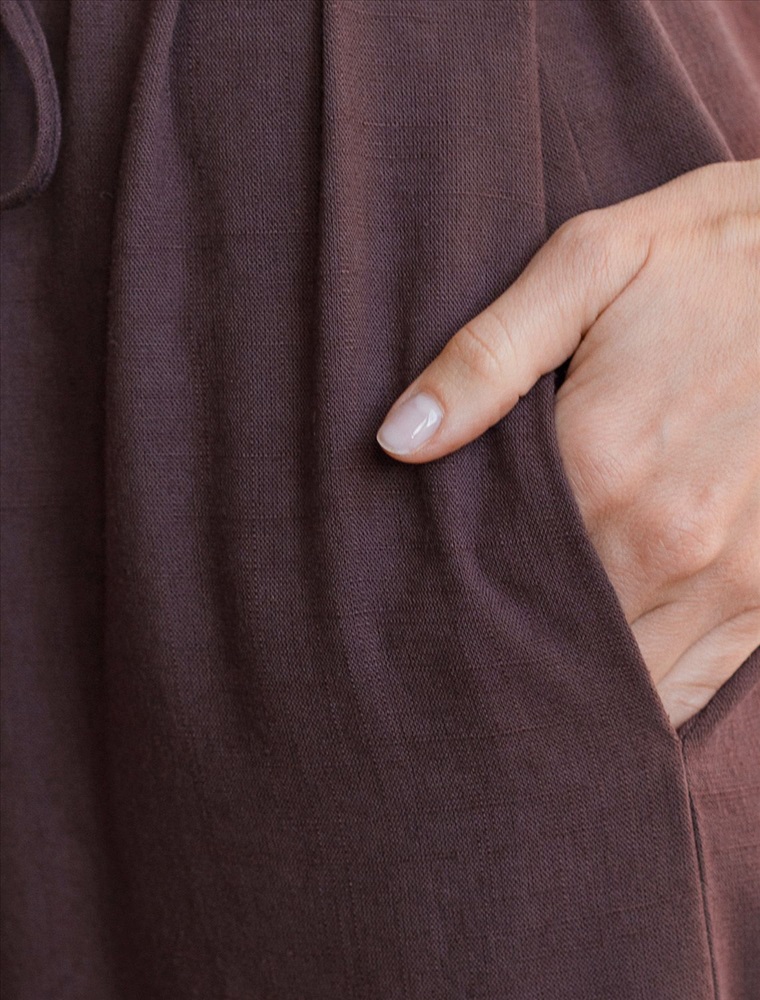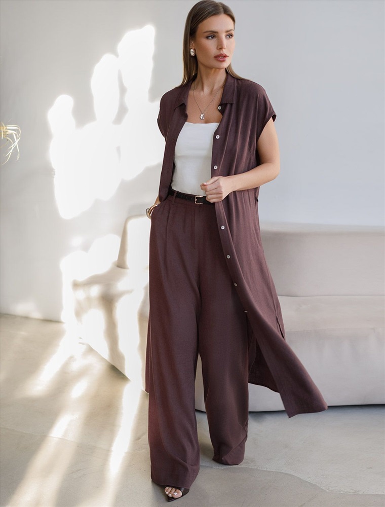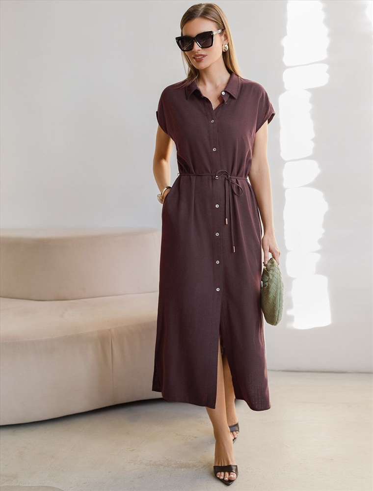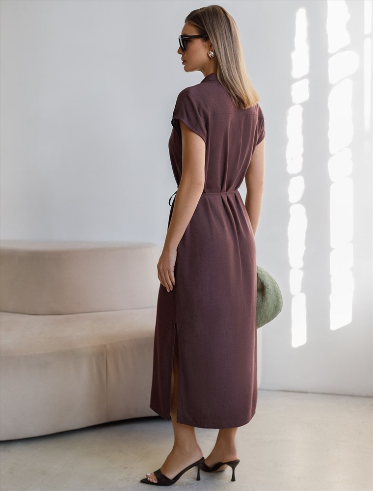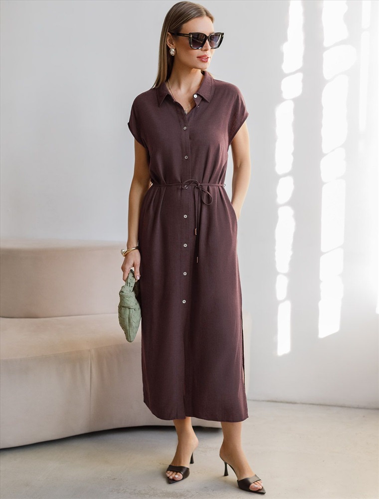 Платье-рубашка коричневого цвета выполнено из натурального льна и вискозы, плотностью 200 Г/м2. Сочетание льна и вискозы обеспечивает комфорт и прохладу в жаркие дни. Это свободное платье на пуговицах по всей длине будет идеальным выбором для лета и весны. Благодаря качественному составу ткани, платье отлично держит форму, не сковывает движения и отличается износостойкостью. Отложной воротник добавляет классический акцент, удобный пояс подчеркивает талию, делая силуэт выразительным и женственным. Платье с коротким цельнокроеным рукавом смотрится современно, а высокие разрезы по бокам добавляют легкости и динамики образу. Подойдет на большие размеры, скроет возможные недостатки и подчеркнет достоинства фигуры. На высокий рост платье будет длины миди, а на низкий рост - длина макси. Такое красивое и легкое платье подойдет для работы, городской прогулки и повседневного стиля.