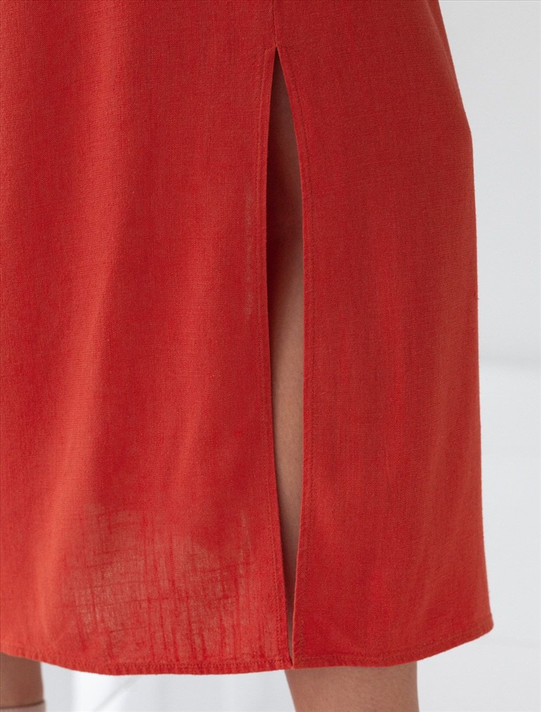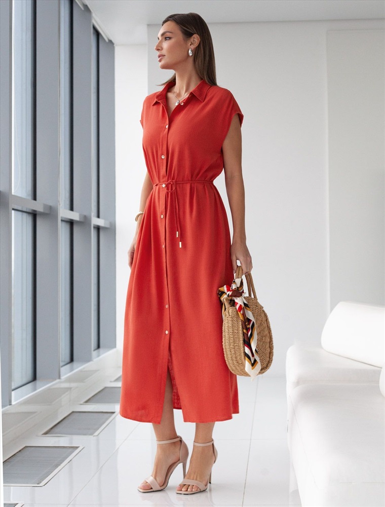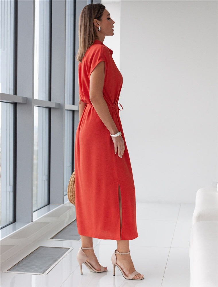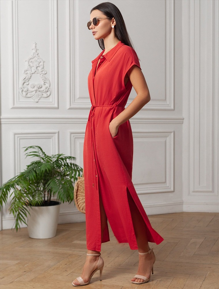 Платье-рубашка кораллового цвета выполнено из натурального льна и вискозы, плотностью 200 Г/м2. Сочетание льна и вискозы обеспечивает комфорт и прохладу в жаркие дни. Это свободное платье на пуговицах по всей длине будет идеальным выбором для лета и весны. Благодаря качественному составу ткани, платье отлично держит форму, не сковывает движения и отличается износостойкостью. Отложной воротник добавляет классический акцент, удобный пояс подчеркивает талию, делая силуэт выразительным и женственным. Платье с коротким цельнокроеным рукавом смотрится современно, а высокие разрезы по бокам добавляют легкости и динамики образу. Подойдет на большие размеры, скроет возможные недостатки и подчеркнет достоинства фигуры. На высокий рост платье будет длины миди, а на низкий рост - длина макси. Такое красивое и легкое платье подойдет для работы, городской прогулки и повседневного стиля.