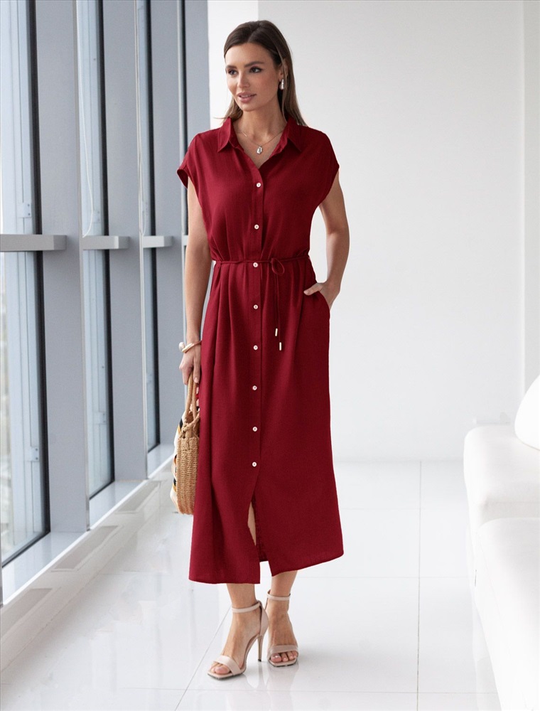 Плотность: 200 Г/м2 Платье-рубашка гранатового цвета выполнено из натурального льна и вискозы, плотностью 200 Г/м2. Сочетание льна и вискозы обеспечивает комфорт и прохладу в жаркие дни. Это свободное платье на пуговицах по всей длине будет идеальным выбором для лета и весны. Благодаря качественному составу ткани, платье отлично держит форму, не сковывает движения и отличается износостойкостью. Отложной воротник добавляет классический акцент, удобный пояс подчеркивает талию, делая силуэт выразительным и женственным. Платье с коротким цельнокроеным рукавом смотрится современно, а высокие разрезы по бокам добавляют легкости и динамики образу. Подойдет на большие размеры, скроет возможные недостатки и подчеркнет достоинства фигуры. На высокий рост платье будет длины миди, а на низкий рост - длина макси. Такое красивое и легкое платье подойдет для работы, городской прогулки и повседневного стиля. Комментарии к товару