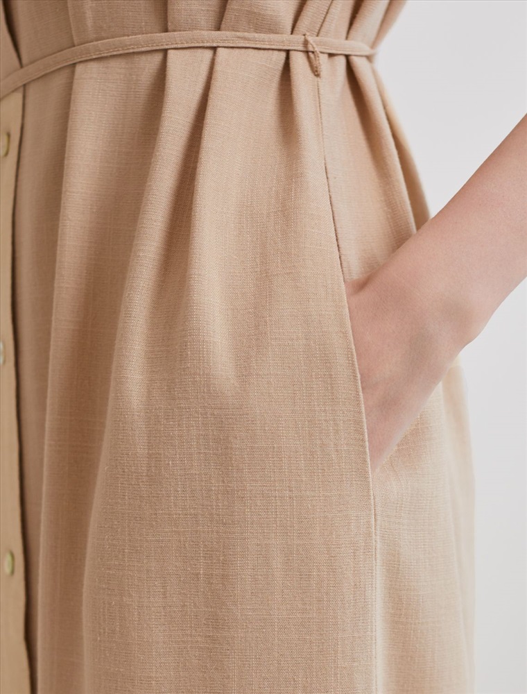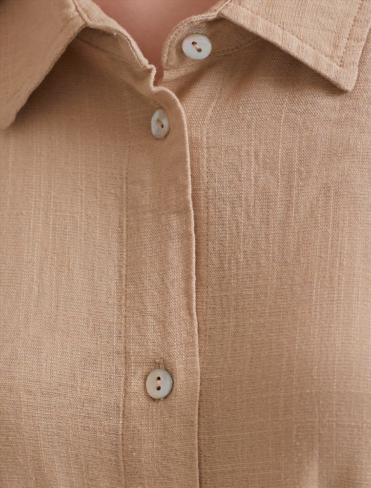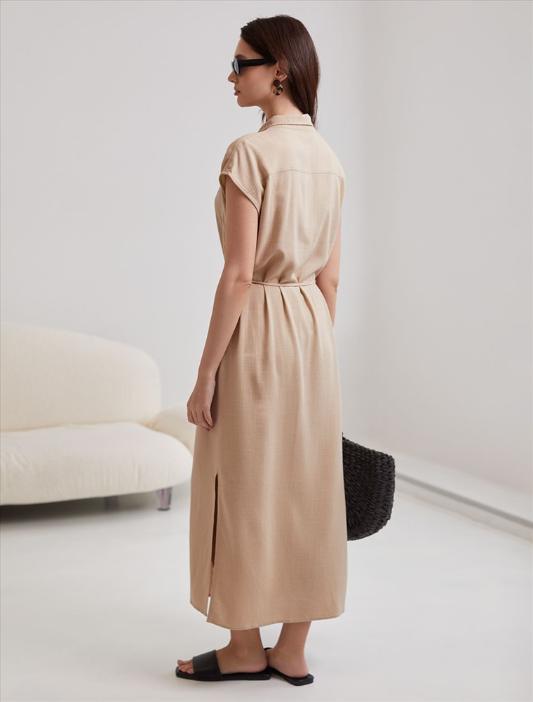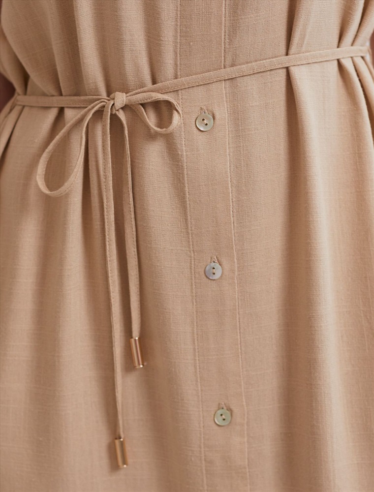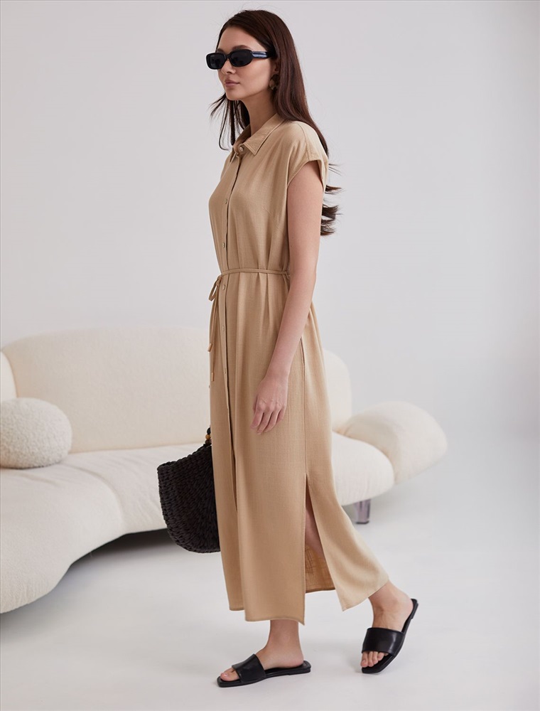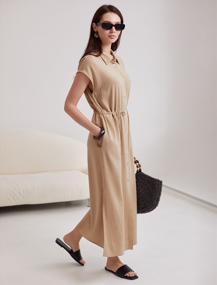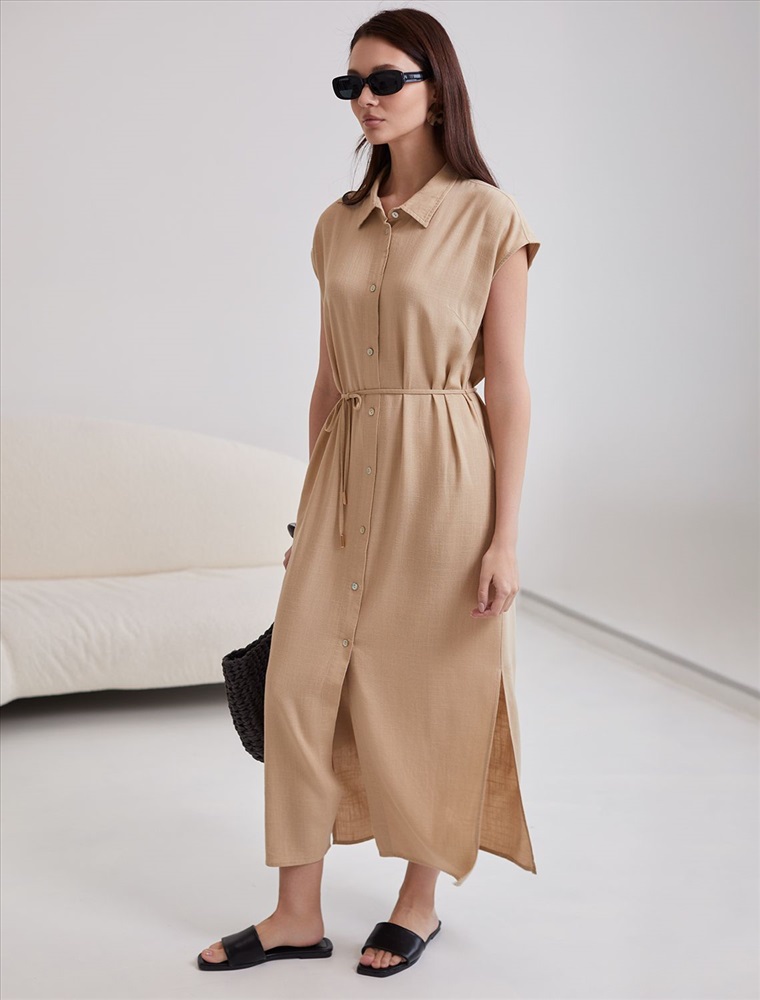 Платье-рубашка бежевого цвета выполнено из натурального льна и вискозы, плотностью 200 Г/м2. Сочетание льна и вискозы обеспечивает комфорт и прохладу в жаркие дни. Это свободное платье на пуговицах по всей длине будет идеальным выбором для лета и весны. Благодаря качественному составу ткани, платье отлично держит форму, не сковывает движения и отличается износостойкостью. Отложной воротник добавляет классический акцент, удобный пояс подчеркивает талию, делая силуэт выразительным и женственным. Платье с коротким цельнокроеным рукавом смотрится современно, а высокие разрезы по бокам добавляют легкости и динамики образу. Подойдет на большие размеры, скроет возможные недостатки и подчеркнет достоинства фигуры. На высокий рост платье будет длины миди, а на низкий рост - длина макси. Такое красивое и легкое платье подойдет для работы, городской прогулки и повседневного стиля.