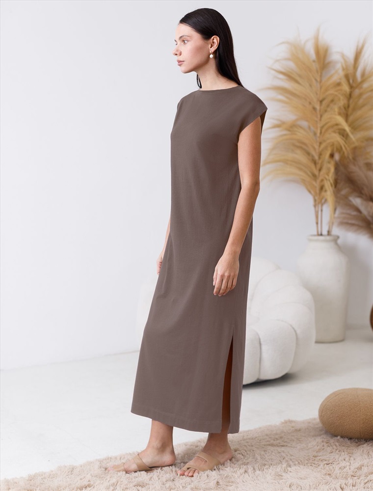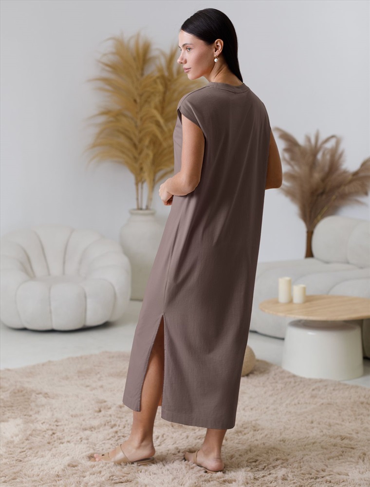 Плотность: 140 Г/м2 Стильное базовое платье кофейного цвета длины макси выполнено из 100% хлопка плотностью 140 Г/м2. Главная особенность этого изделия — тонкое кулирное полотно, которое легче и воздушнее стандартного трикотажа. Благодаря своей деликатной текстуре модель идеально подходит для домашних образов и пижамных комплектов. Ткань отлично «дышит», обеспечивая максимальный уют во время сна и отдыха. Свободный и прямой крой не сковывает движений и легко скроет возможные недостатки фигуры., а разрезы добавляют легкости и непринужденности образу. Короткий цельнокроеный рукав и позволяет чувствовать себя удобно в теплую погоду, а так же в домашней обстановке. Простота кроя сочетается с современным дизайном, создавая гармоничный лук без излишеств. Это легкое платье подойдет для тех, кто ценит комфорт и элегантность одновременно. Комментарии к товару