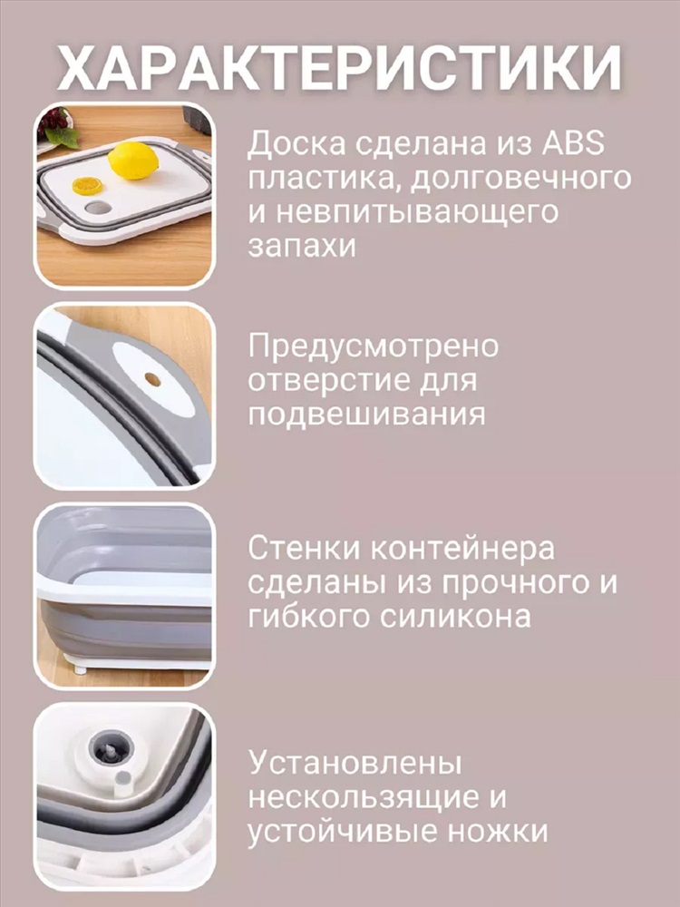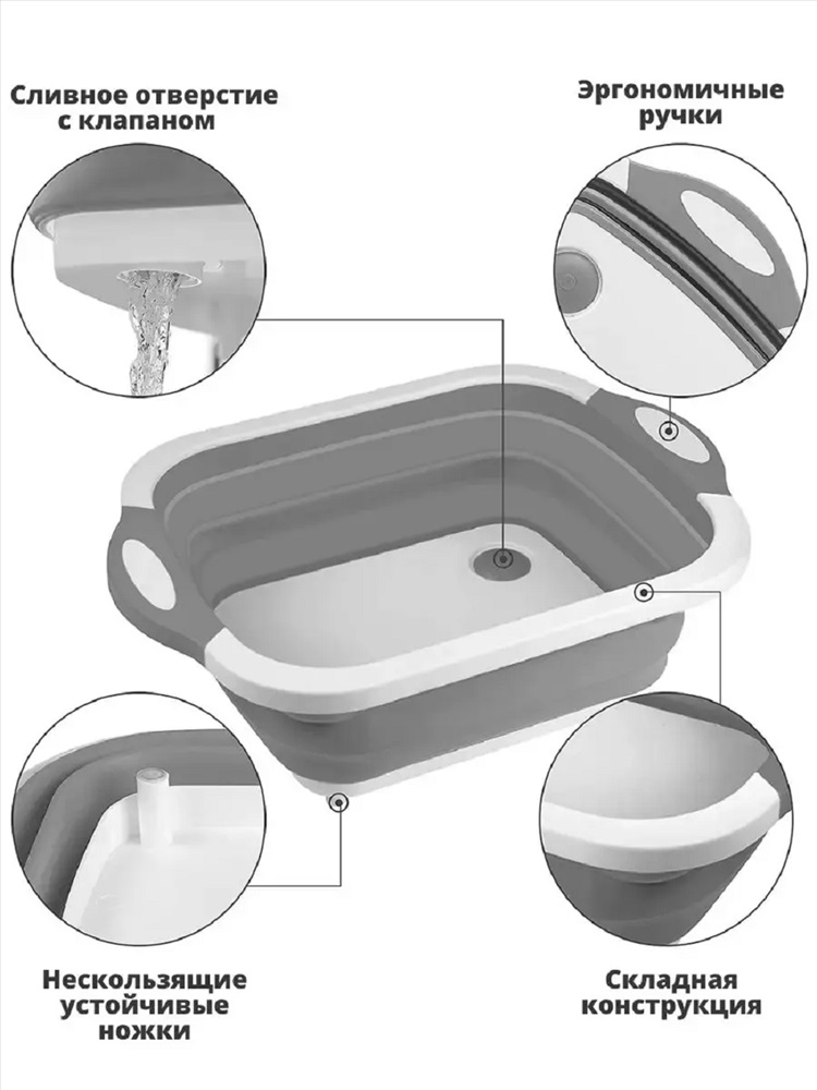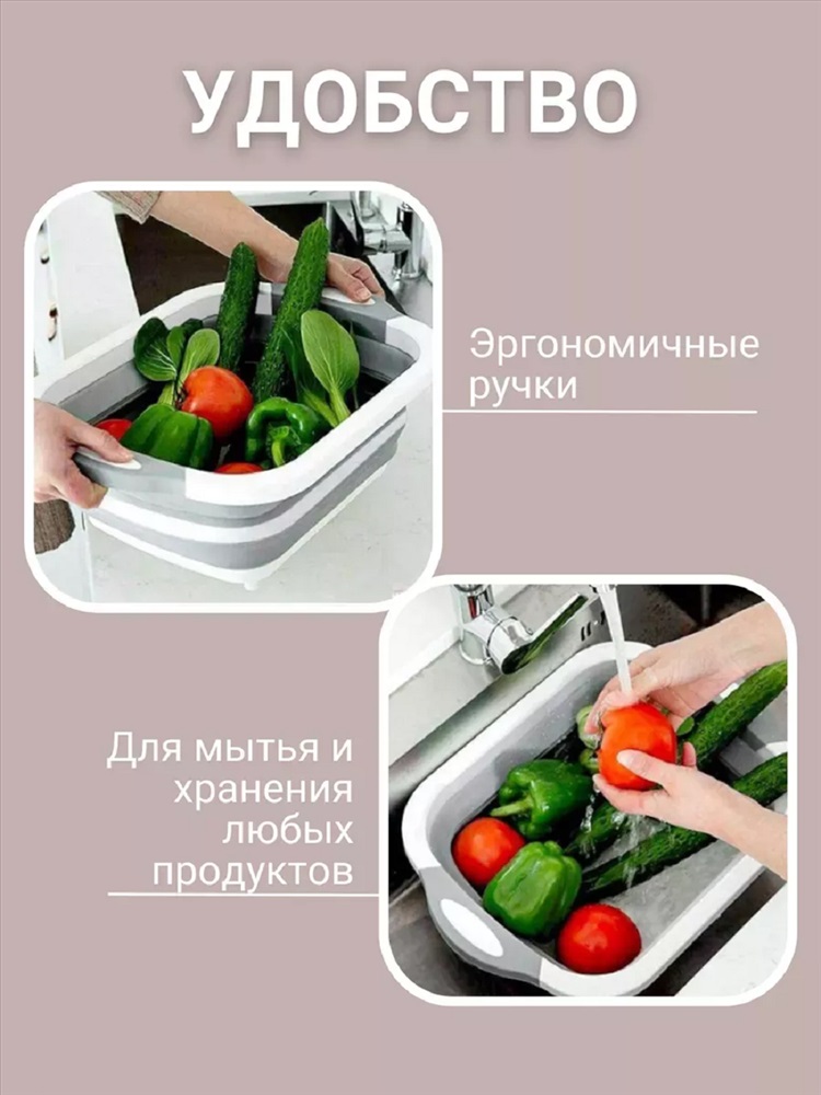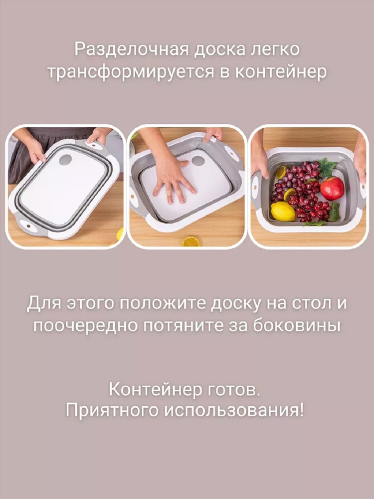 Тип товара: доска разделочная Назначение: для дачи Рейтинг: Рейтинг 4 и выше Многофункциональная складная разделочная доска 3 в 1, изготовлена из прочного пищевого пластика и силикона, безопасна. Изделие сочетает функции кухонной миски, небольшого тазика, дуршлага и складной разделочной доски. Объем чаши 6 литров. Может использоваться в качестве корзины под фрукты и овощи и доски для подачи закусок, бутербродов. Разделочная доска трансформер с ножом отличается удобством в применении. Подходит для кухни, дачи, для путешествия, пикника на природе. Доска-дуршлаг - отличный подарок маме, сестре, бабушке или себе на любой повод будь то новоселье, свадьба, день рождения. Незаменима не только на кухне, но и во время похода или пикника. В сложенном состоянии не занимает много места и применяется как досочка для резки продуктов. При этом доска разделочная пластиковая силиконовая не тупит ножи, не впитывает запахи, легко моется. Потянув за края легко превращается в контейнер со сливом. В котором можно хранить и мыть овощи, фрукты и другие продукты. Воду можно слить, нажав клапан на дне тазика, можно использовать для замачивания и стирки белья. Прочное пластиковое дно с нескользящими ножками, крепкие силиконовые бортики делают изделие устойчивым. Разрешено ё мыть в посудомоечной машине. Таблица размеров и веса