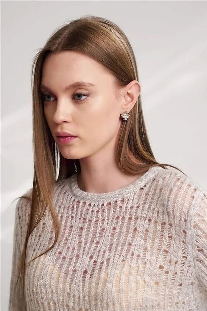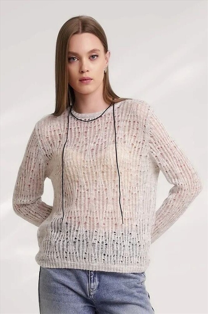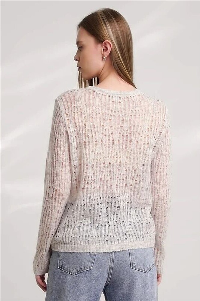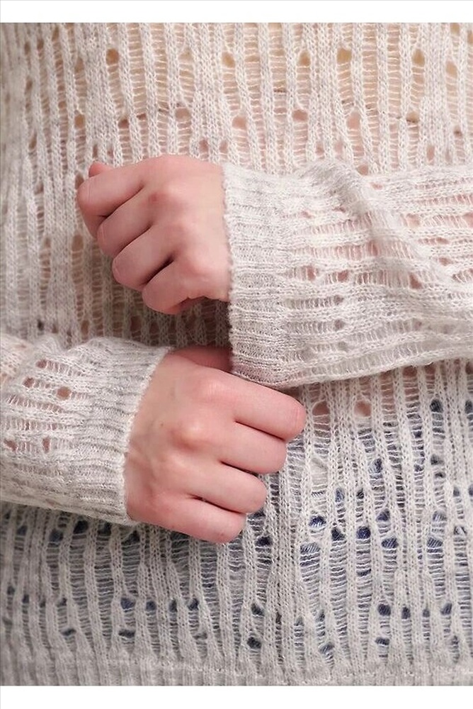 Вязаный джемпер из акриловой пряжи, переплетения ажур на основе глади. Длинный втачной рукав. Округлая горловина с бейкой. По низу изделия, рукавов манжеты.