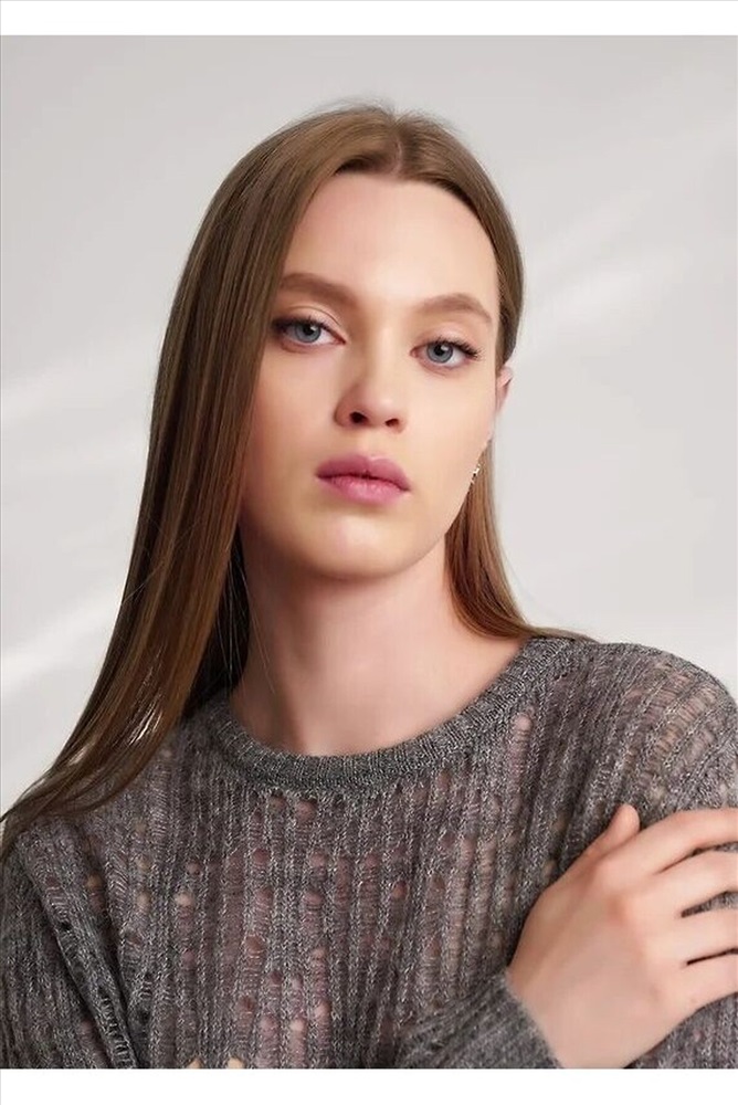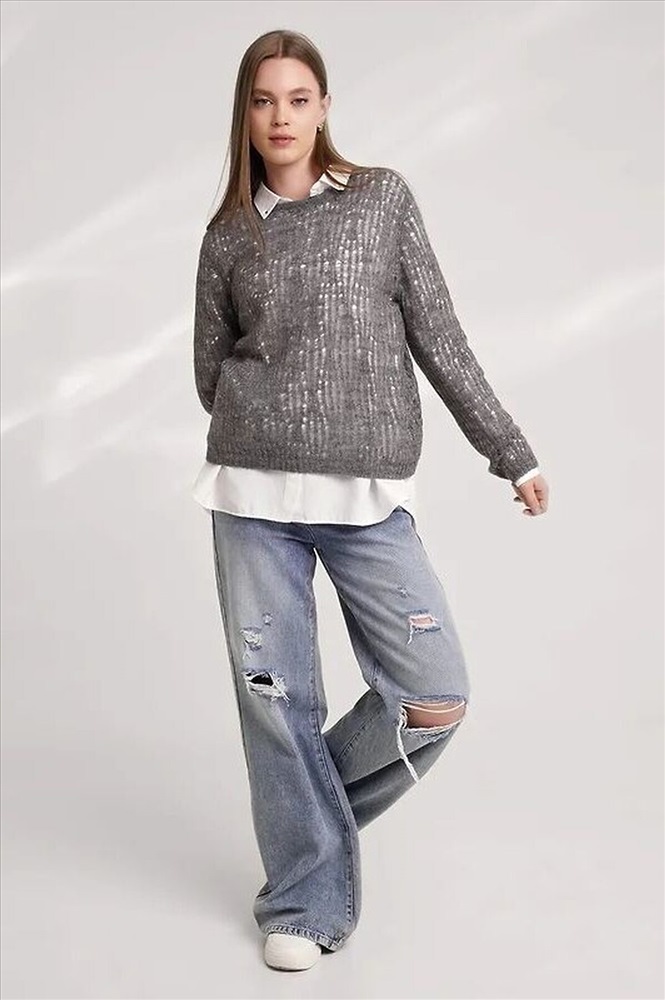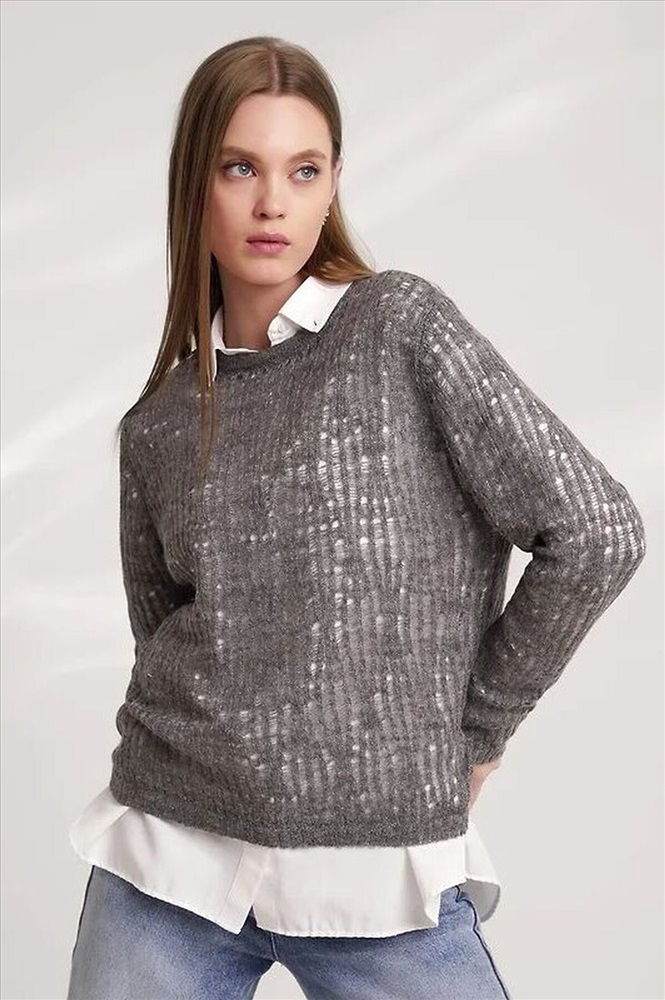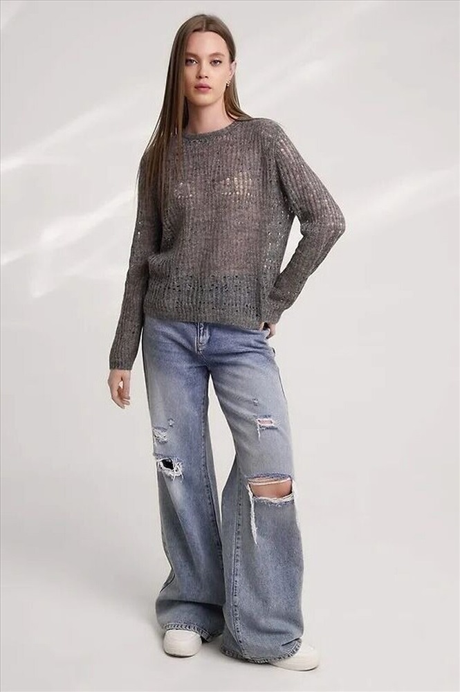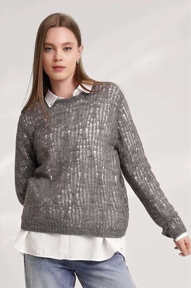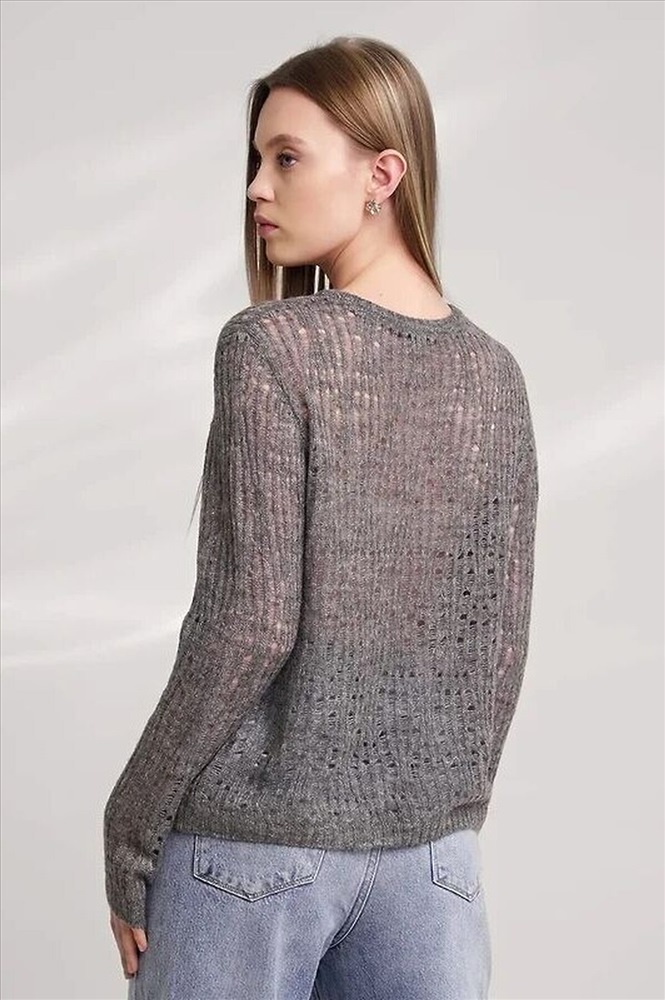 Вязаный джемпер из акриловой пряжи, переплетения ажур на основе глади. Длинный втачной рукав. Округлая горловина с бейкой. По низу изделия, рукавов манжеты.