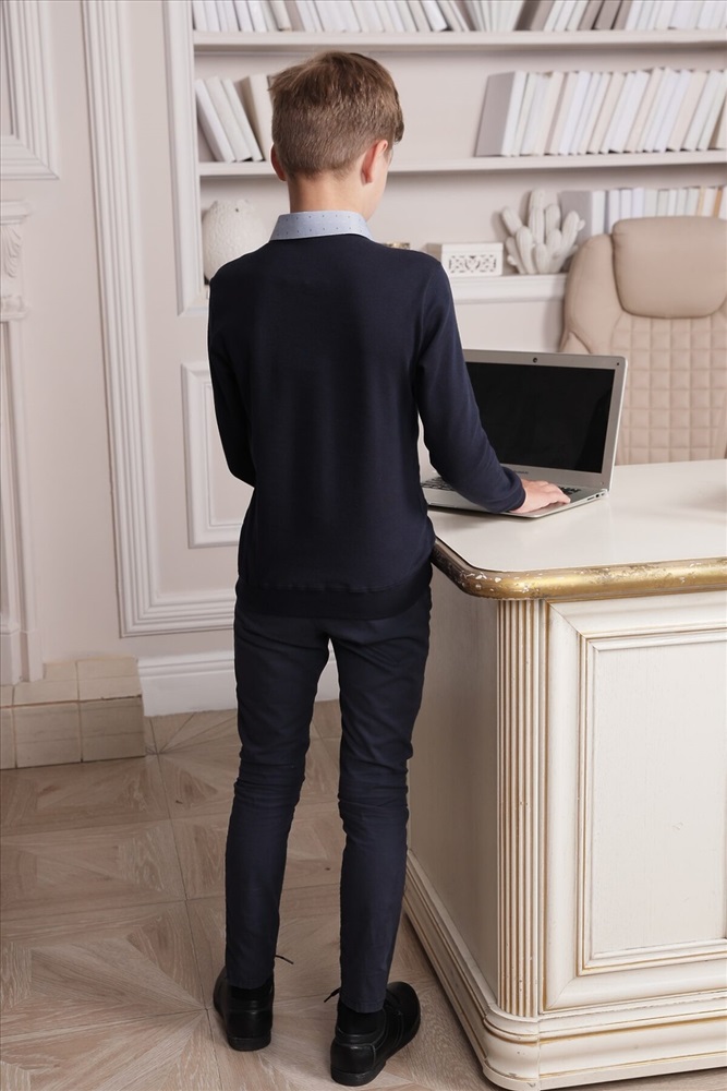 Страна производства: Россия Джемпер-обманка Jersey Lab с длинным рукавом одновременно сочетает в себе 2 предмета гардероба: джемпер в классическом стиле и имитацию рубашки, с застежкой на пуговицы. Рубашку-обманку не нужно заправлять в брюки и она не выбивается из под одежды, как рубашка в классическом варианте. Изделия отшиваются из кулирки высокого качества пенье, низ рукавов и джемпера на манжете. Джемпер-рубашка - это оптимальное решение для создания стильных образов в школу и праздничных мероприятий. Джемпер для мальчика изготовлен из плотного хлопкового полотна, а воротник из рубашечной ткани. Обратите внимание - модель маломерит на 1-1,5 размера!