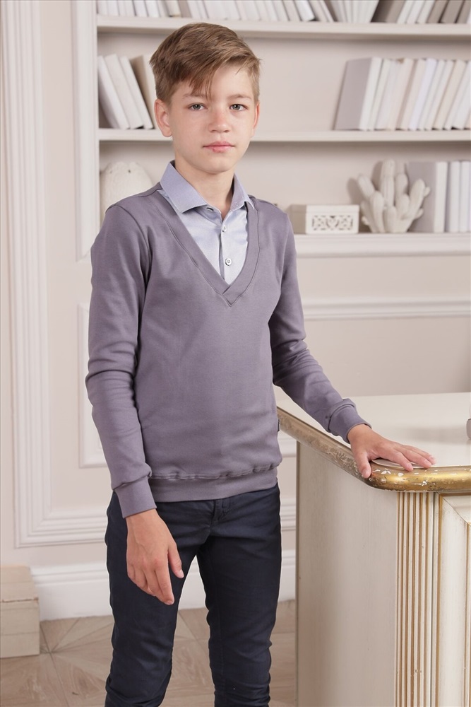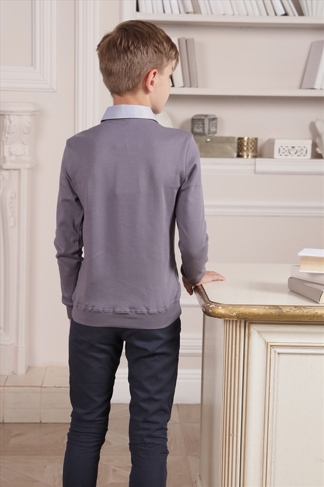 Страна производства: Россия Джемпер-обманка Jersey Lab с длинным рукавом одновременно сочетает в себе 2 предмета гардероба: джемпер в классическом стиле и имитацию рубашки, с застежкой на пуговицы. Рубашку-обманку не нужно заправлять в брюки и она не выбивается из под одежды, как рубашка в классическом варианте. Изделия отшиваются из кулирки высокого качества пенье, низ рукавов и джемпера на манжете. Джемпер-рубашка - это оптимальное решение для создания стильных образов в школу и праздничных мероприятий. Джемпер для мальчика изготовлен из плотного хлопкового полотна, а воротник из рубашечной ткани. Обратите внимание - модель маломерит на 1-1,5 размера!