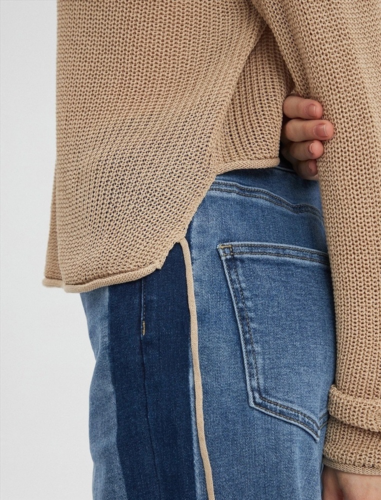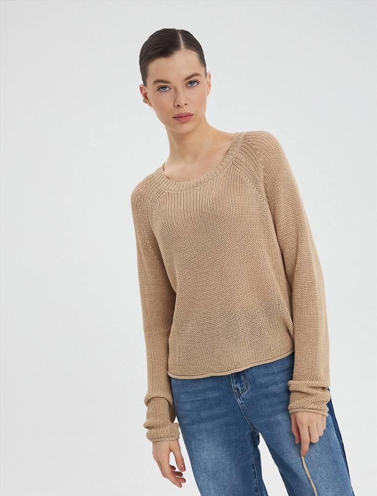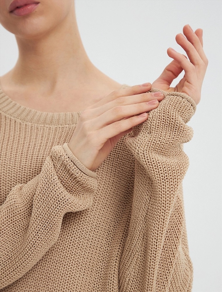 Джемпер свободного силуэта с удлиненными рукавами. Сзади модель укорочена и регулируется декоративными шнурками.