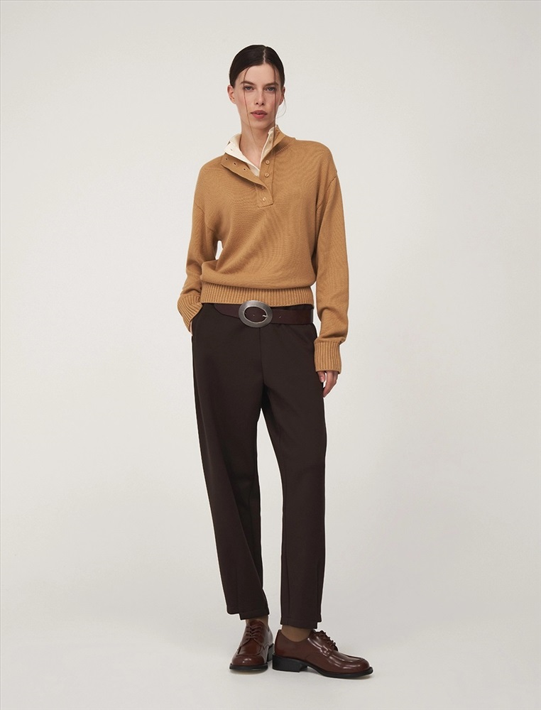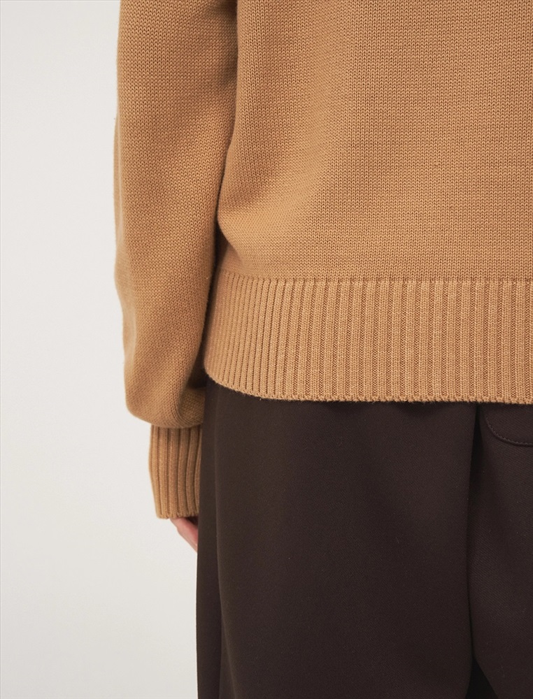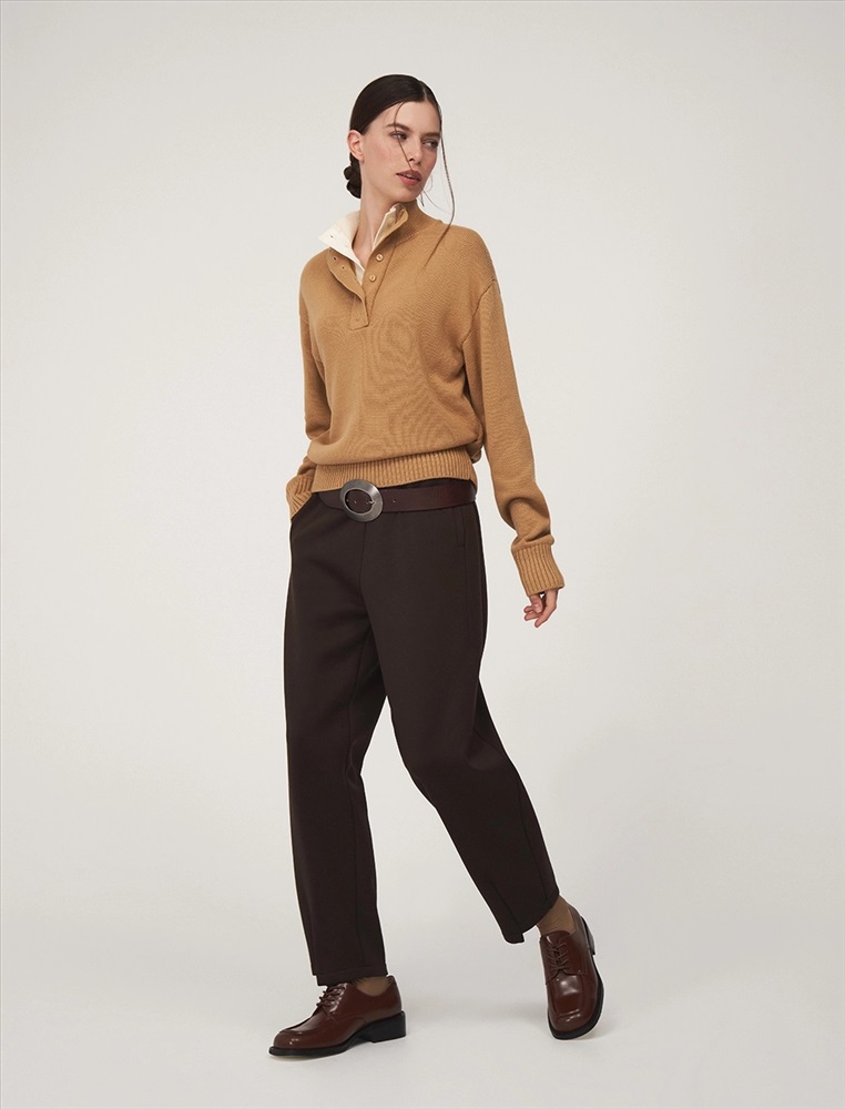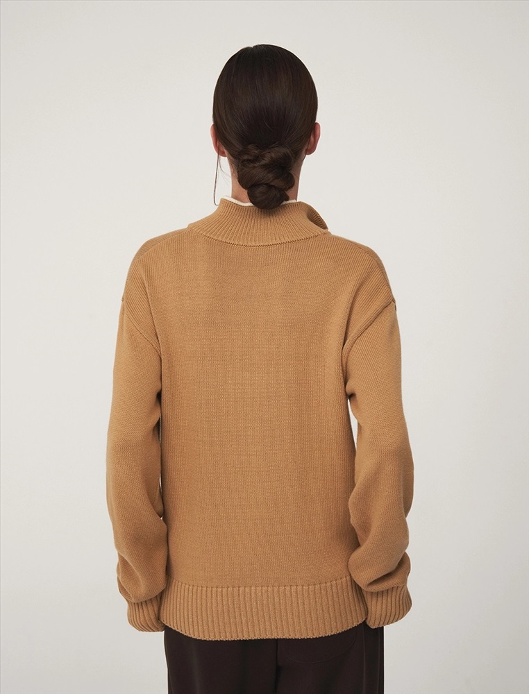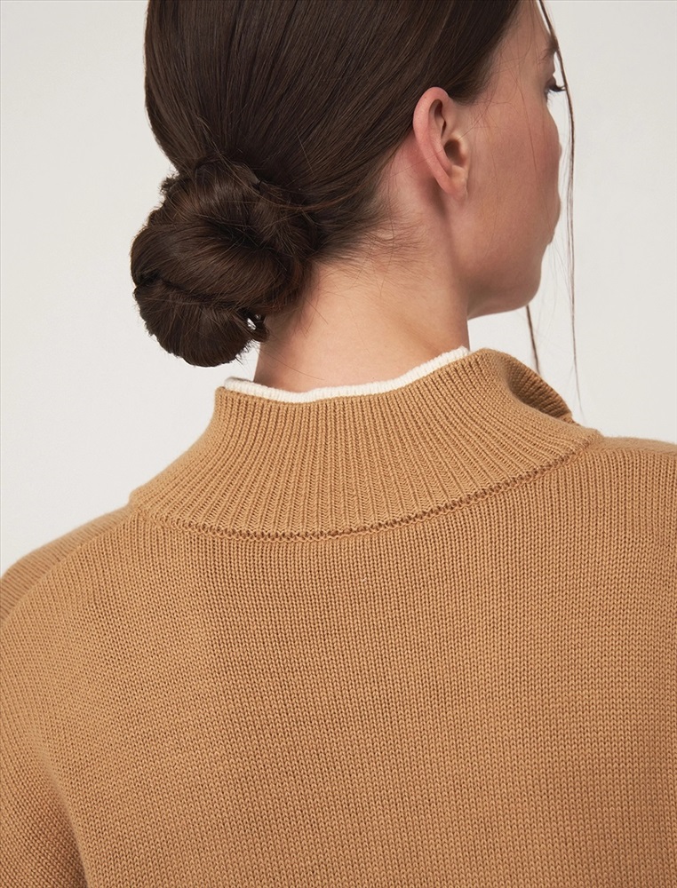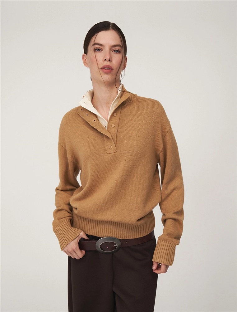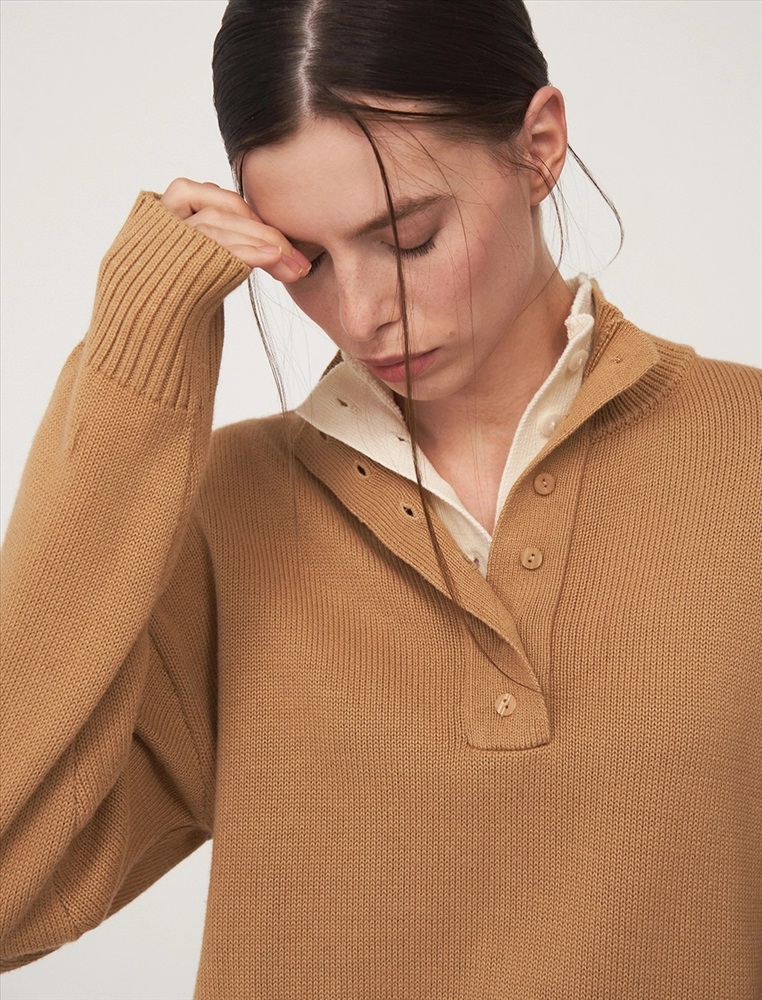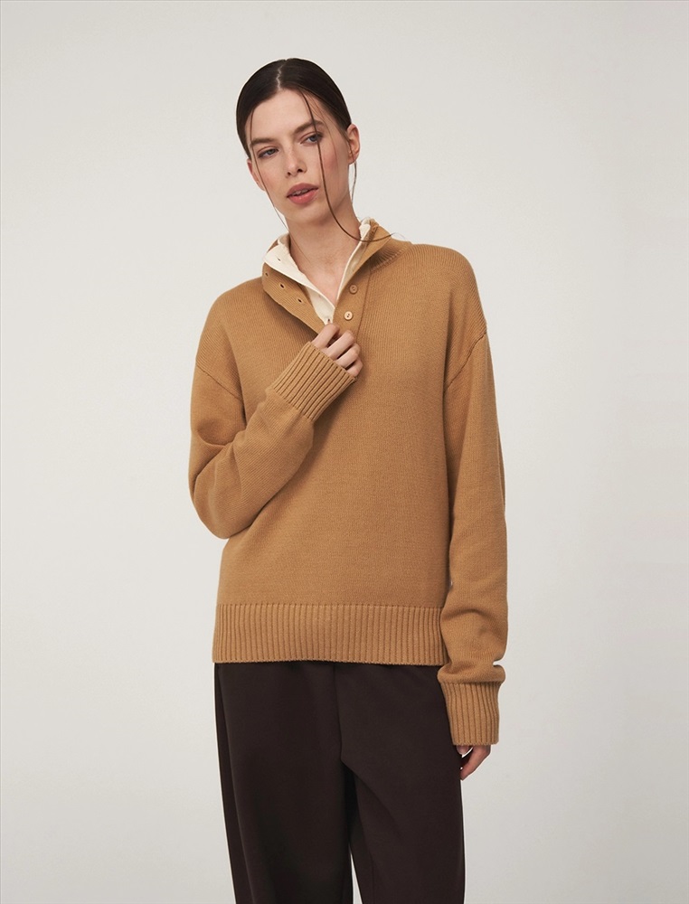 Вязаный джемпер регулярного силуэта со спущенной линией плеча. Воротник-стойка застегивается на пуговицы. Дополнительный светлый воротник добавляет изделию эффект многослойности. Выполнен из хлопка и акрила с добавлением кашемира, что обеспечивает комфорт, долговечность и тепло. Представлен в сером и бежевом оттенке.