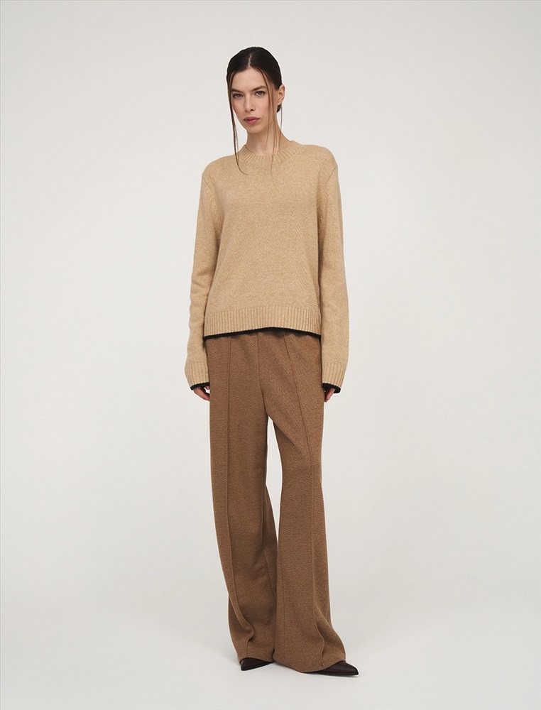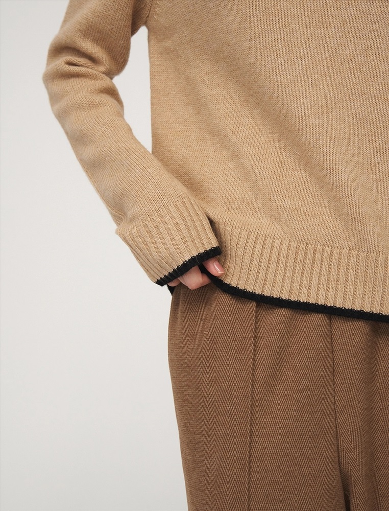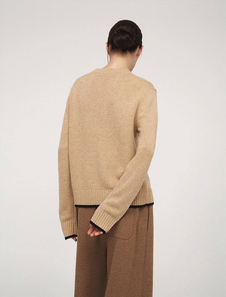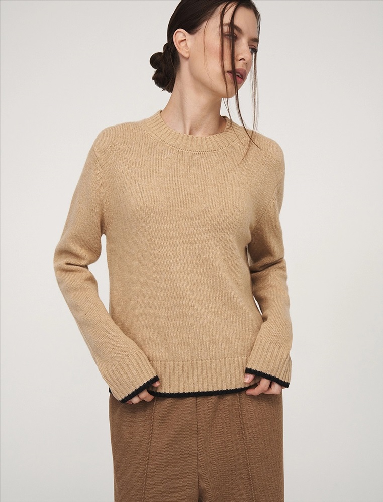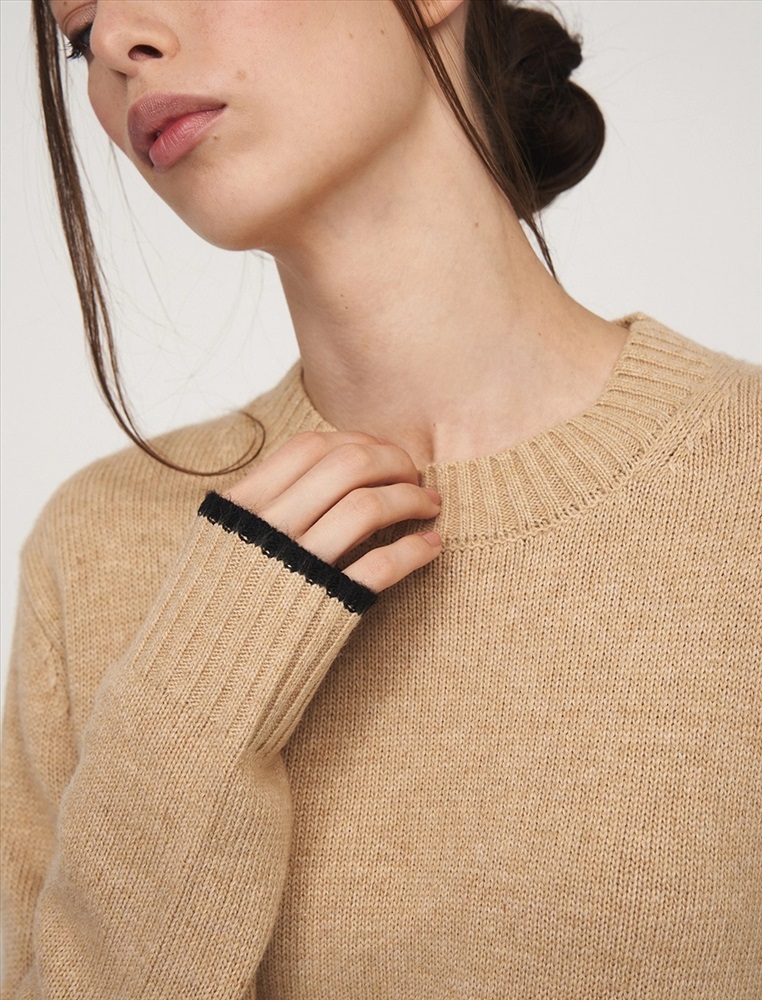 Вязаный джемпер регулярного силуэта со спущенной линией плеча. Горловина по типу R-neck. Низ изделия и рукавов имеют вязку контрастного оттенка. Выполнен из хлопка и акрила с добавлением кашемира, что обеспечивает комфорт, долговечность и тепло. Представлен в бежевом оттенке.