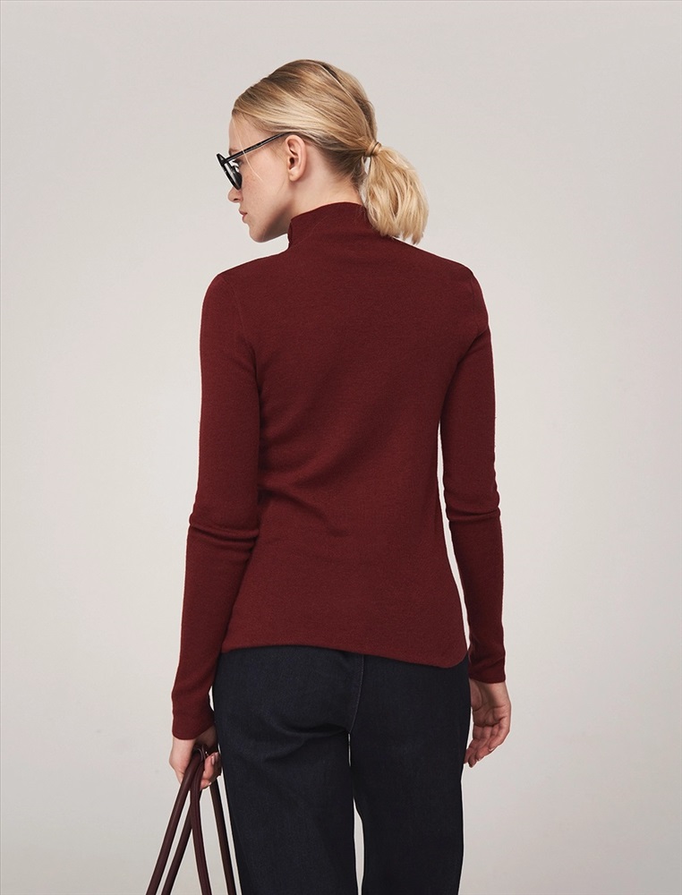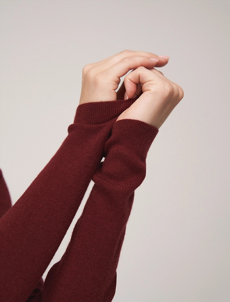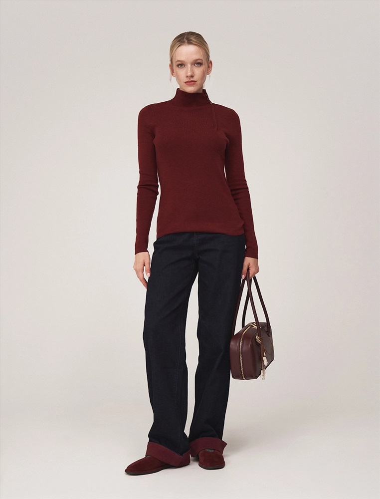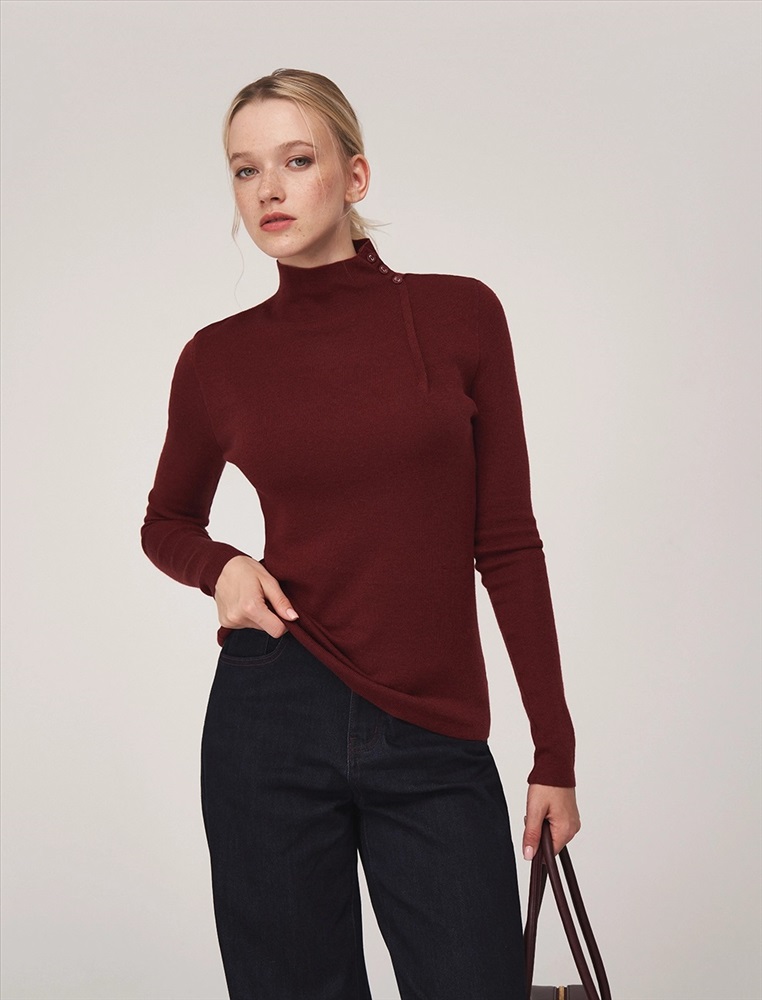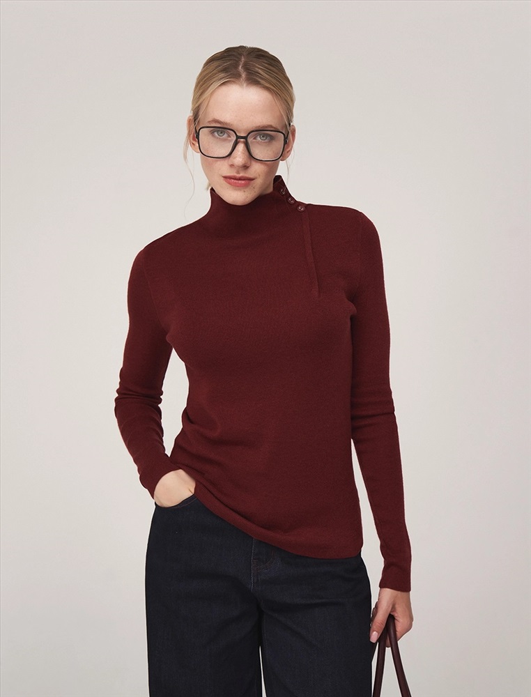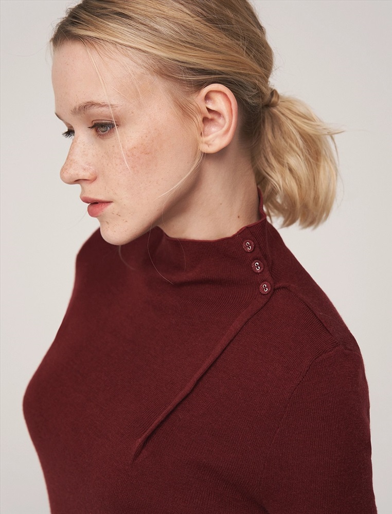 Водолазка прилегающего силуэта, с воротником. С левой стороны воротника, сбоку, расположены пуговицы. По передней части изделия, с левой стороны, перпендикулярно плечу, застрочена декоративная складка. Выполнена из мягкого хлопка и акрила с добавлением кашемира и шелка, обеспечивающих тепло и комфорт в носке. Представлена в сером и бордовом оттенках.