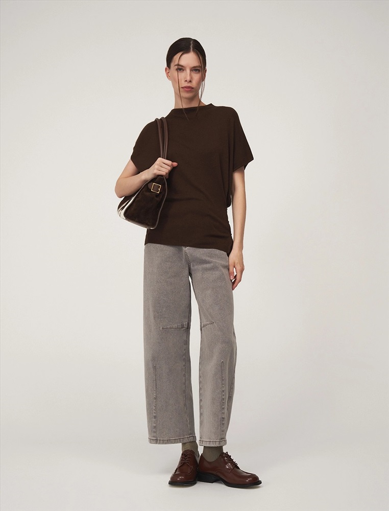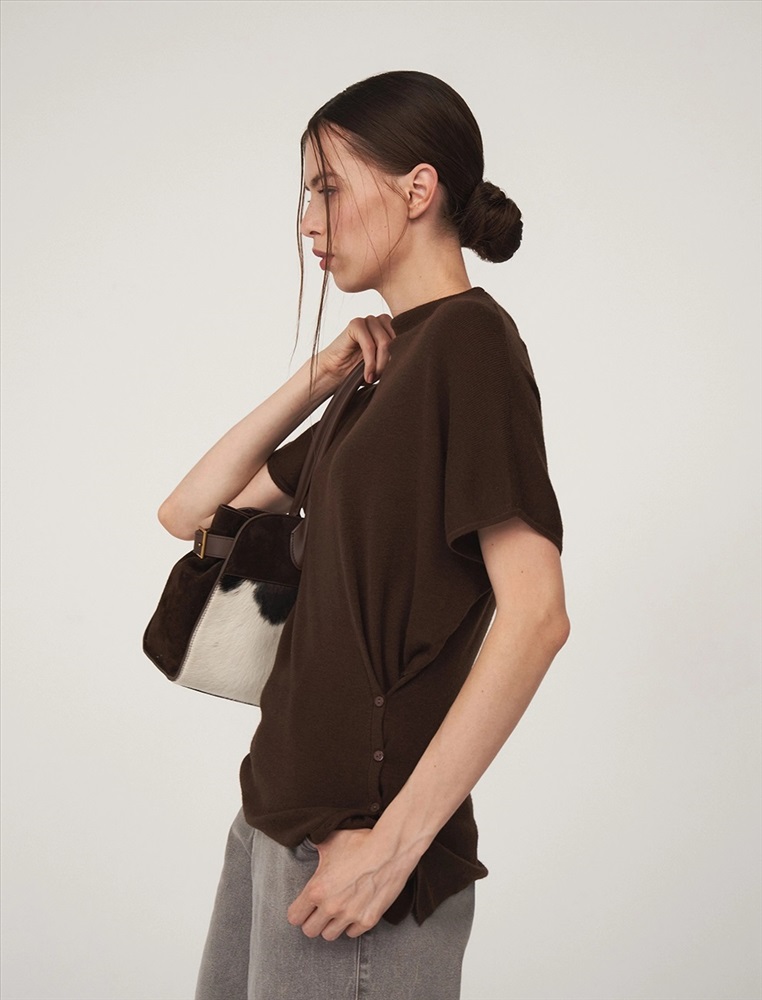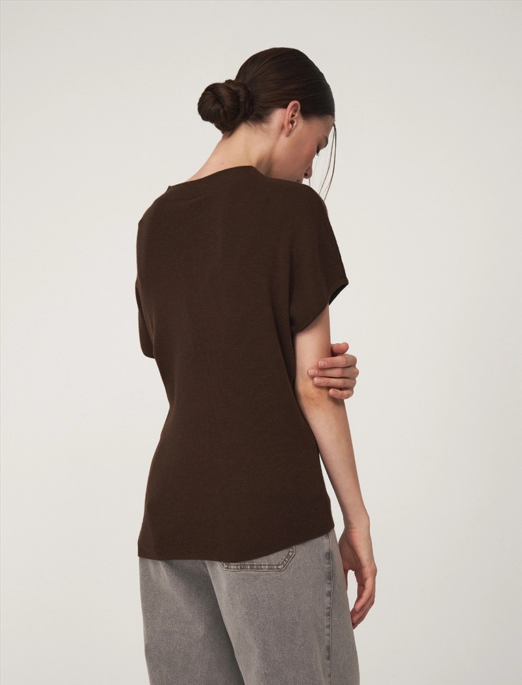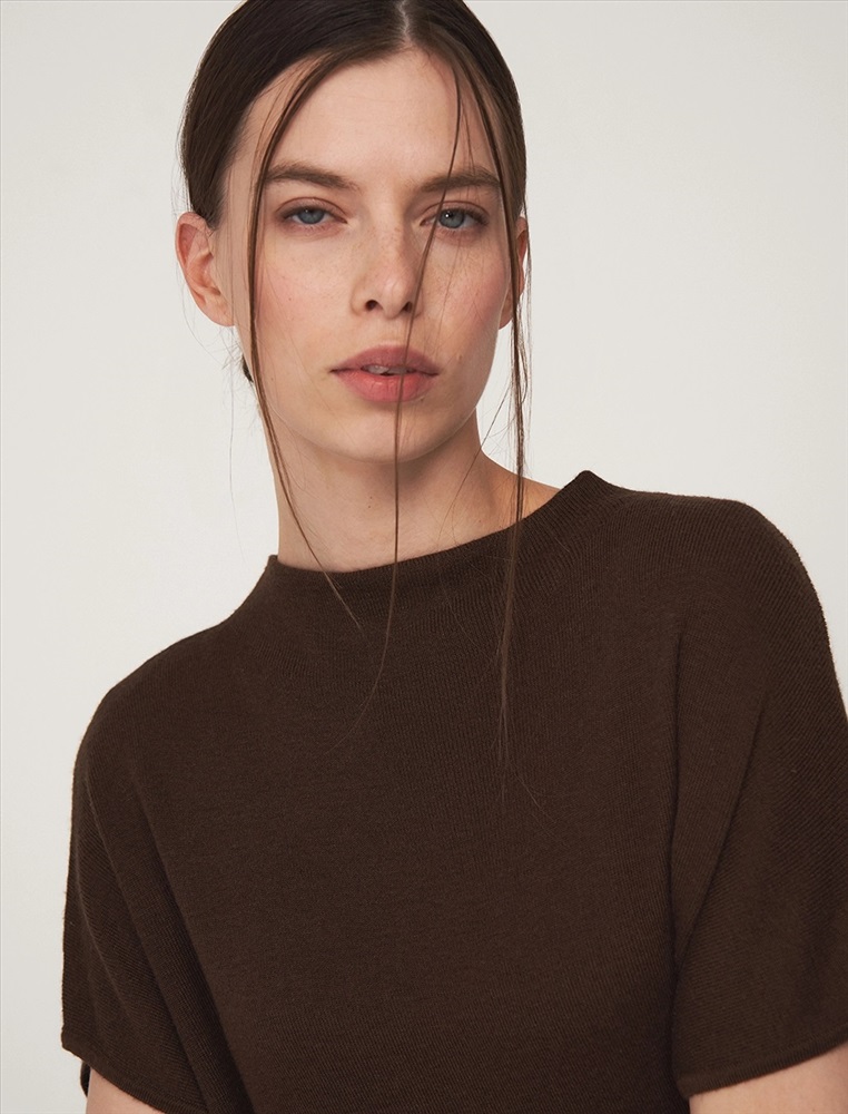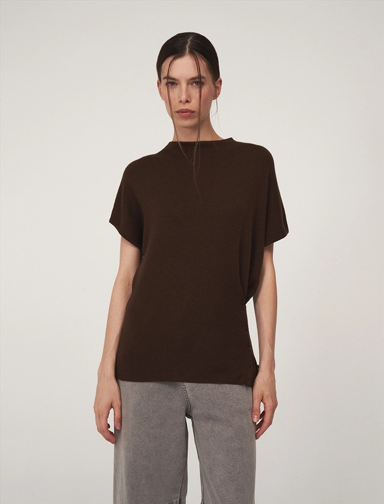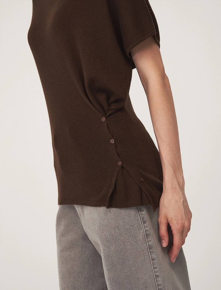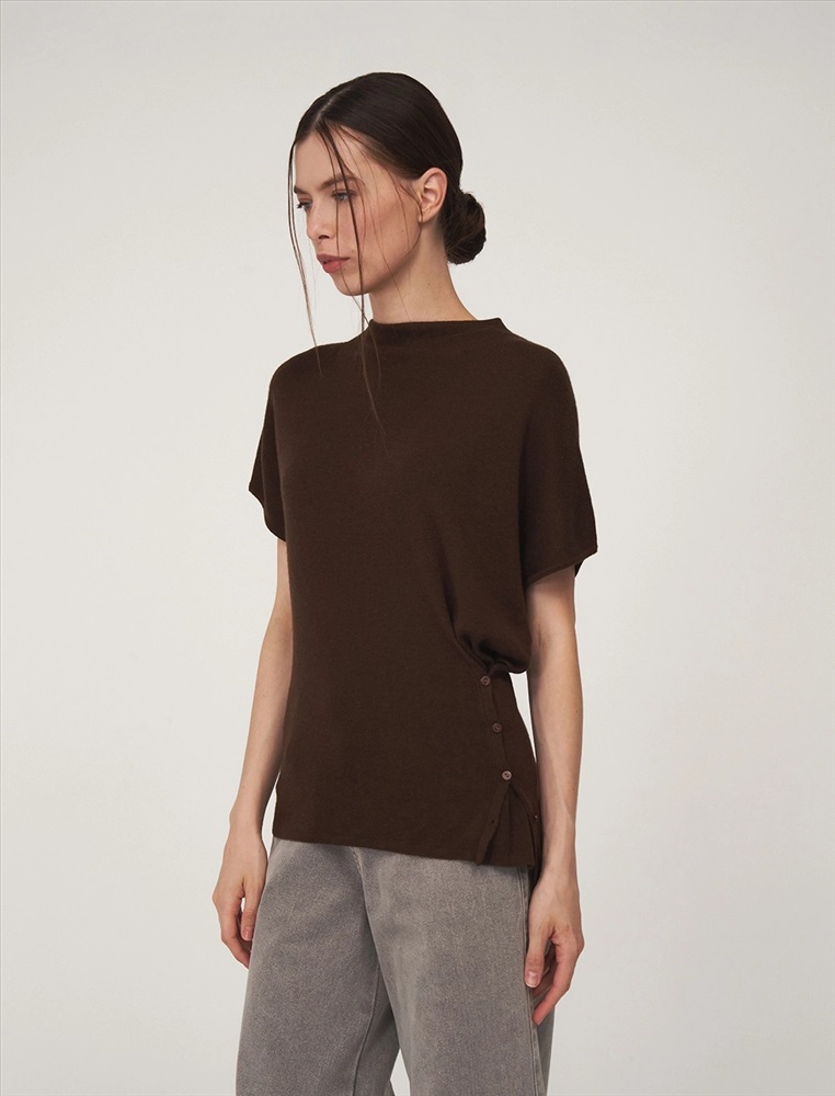 Видео: https-//hassfashion.ru/upload/iblock/307/ki3twqe08e3ohzt1s21p9x0958ec2zpn.mp4 осень-зима 50% Хлопок, 35% Акрил, 10% Кашемир, 5% Шелк Вязаный джемпер регулярного силуэта с коротким цельнокроенным рукавом и воротником-стойкой. По передней части, снизу, с левой стороны – застежка на пуговицы для приталивания силуэта. Выполнен из хлопка и акрила с добавлением кашемира и шелка, что обеспечивает комфорт и тепло. Представлен в сером и коричневом оттенке.