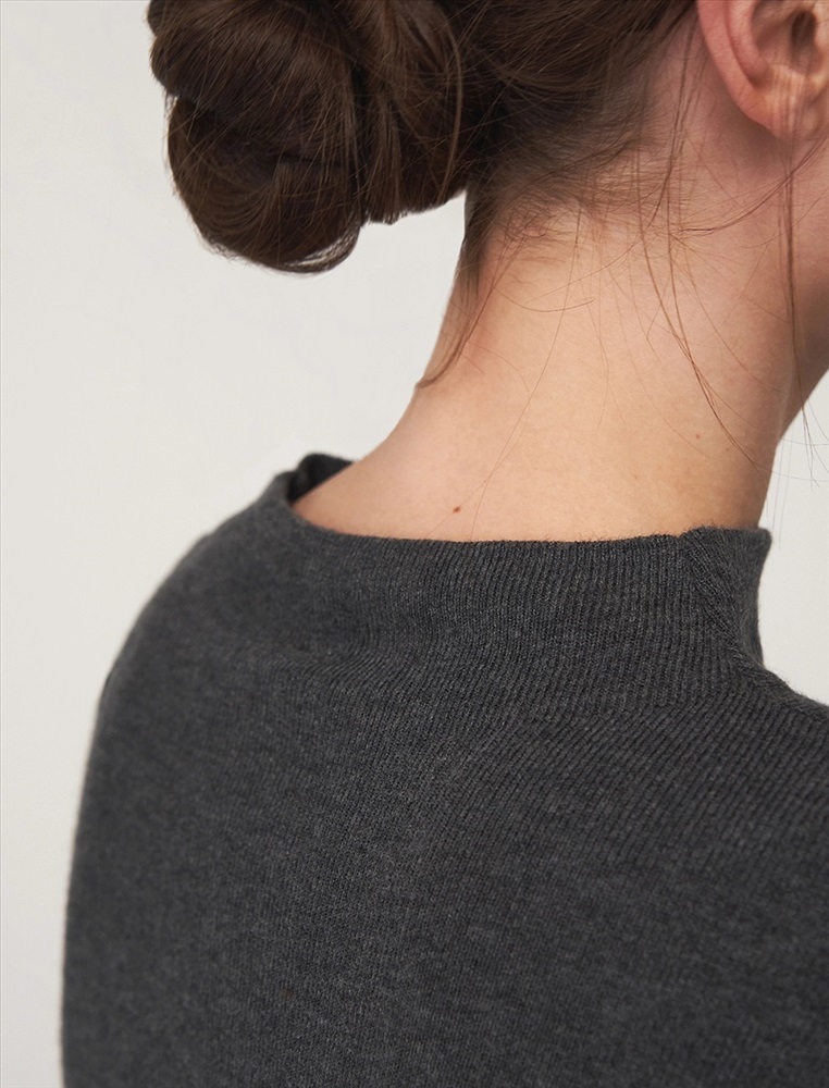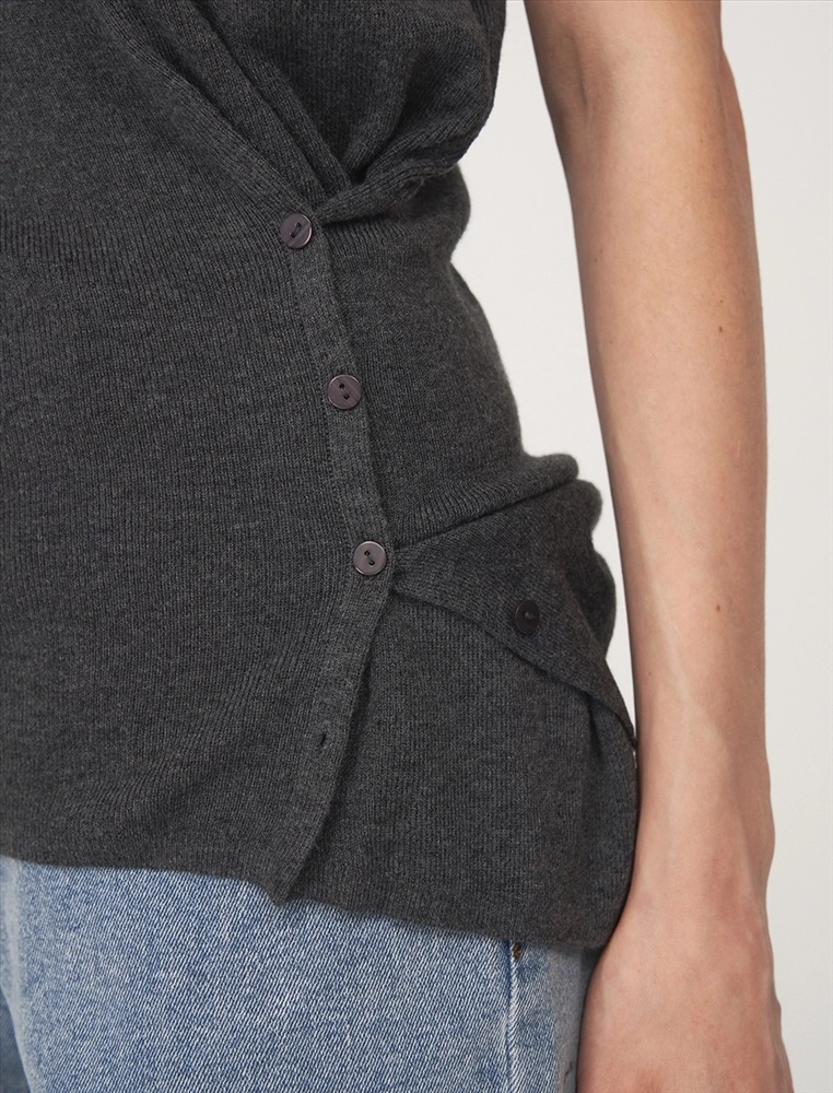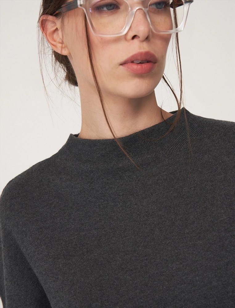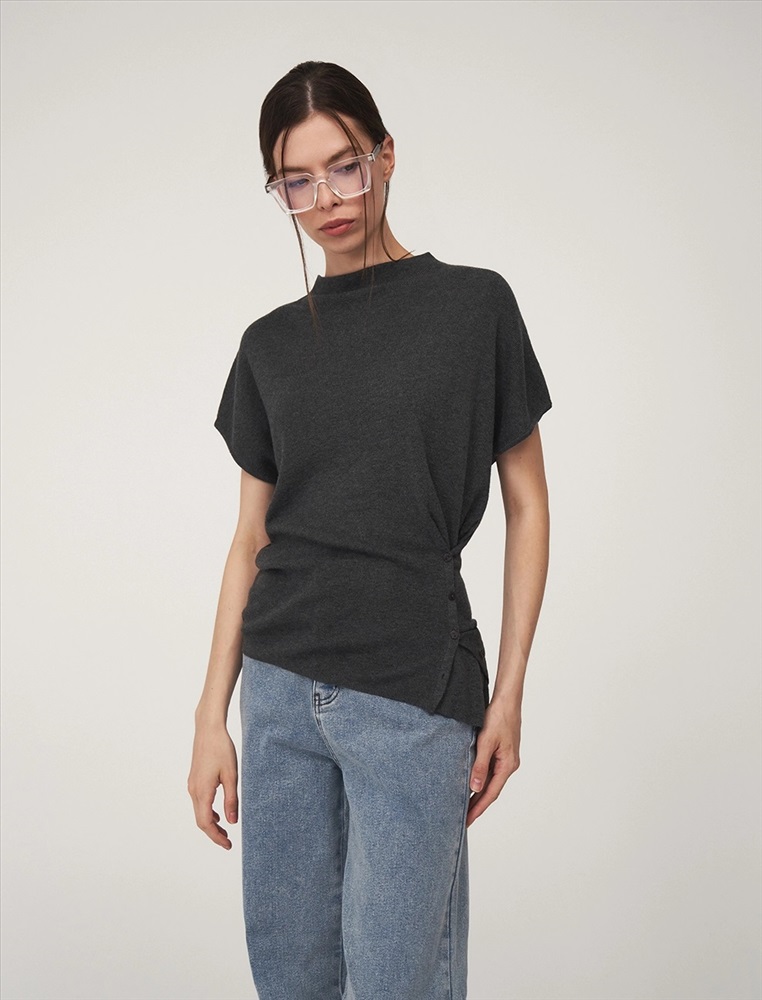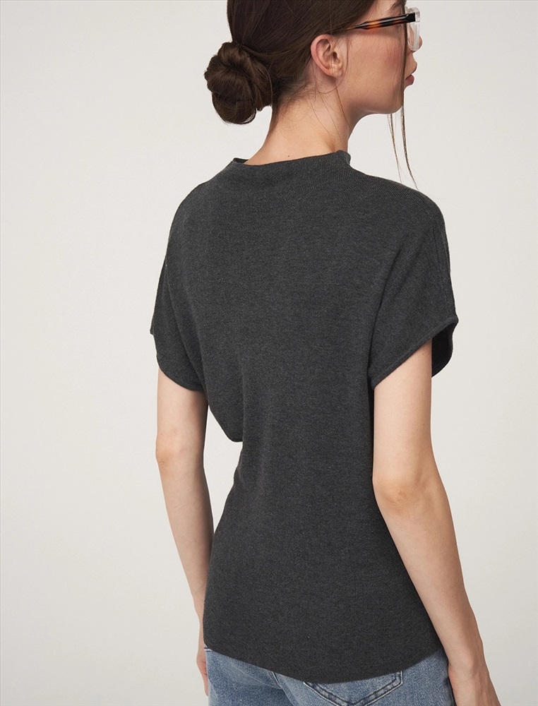 Вязаный джемпер регулярного силуэта с коротким цельнокроенным рукавом и воротником-стойкой. По передней части, снизу, с левой стороны – застежка на пуговицы для приталивания силуэта. Выполнен из хлопка и акрила с добавлением кашемира и шелка, что обеспечивает комфорт и тепло. Представлен в сером и коричневом оттенке.