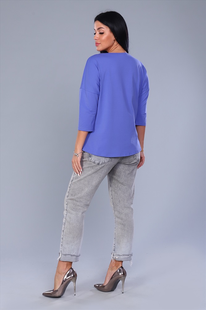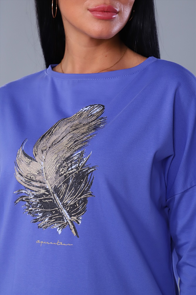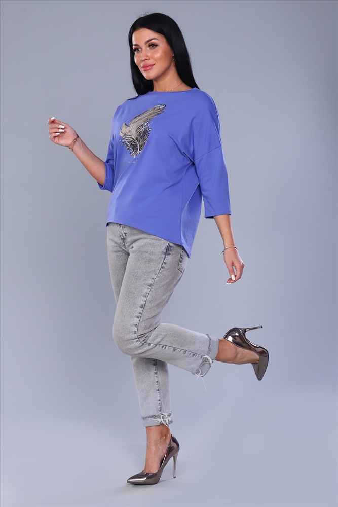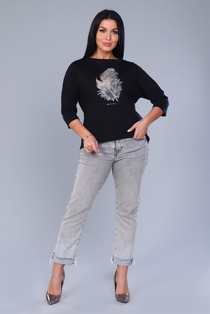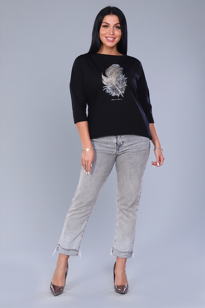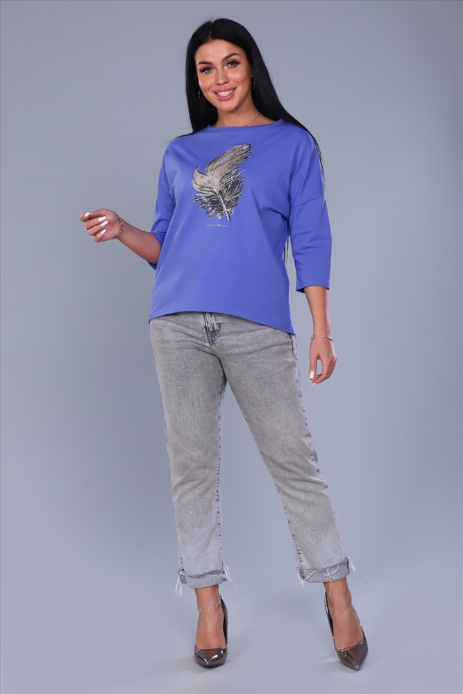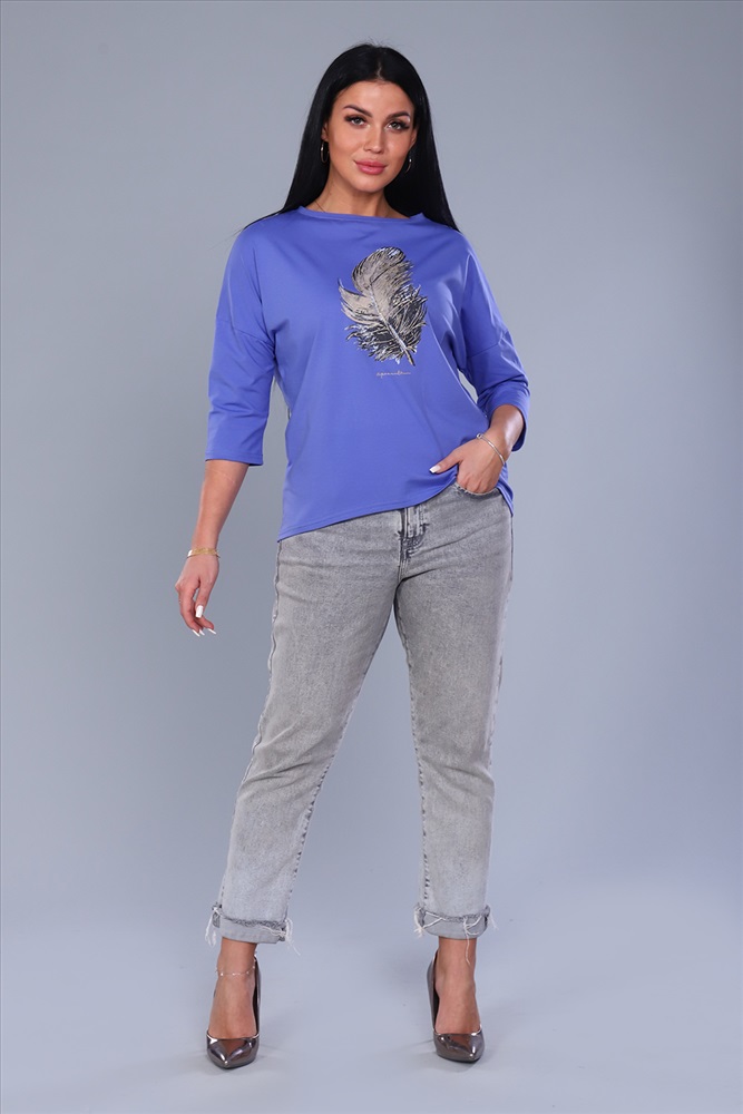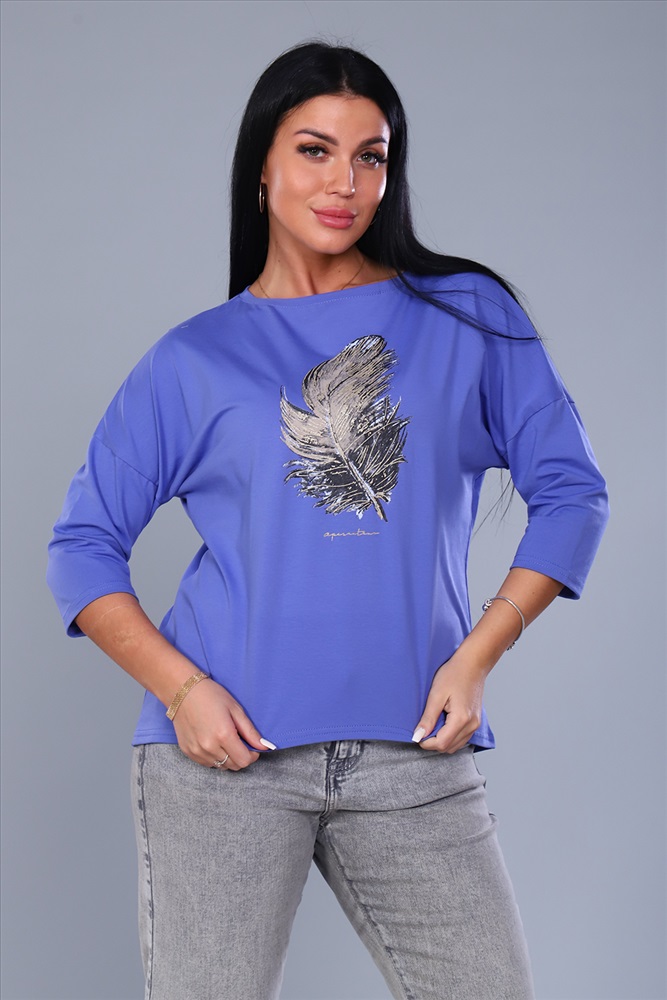 Застежка: без застежки Джемпер женский с мерцающим принтом 3Д в виде пёрышка, из плотной кулирки с лайкрой качества пенье. Модель слегка приталенного силуэта, горловина круглая обработана обтачкой, спущенное плечо, рукав 3/4, спинка слегка удлинена и закруглена. Джемпер стильный, лёгкий, приятный к телу, отличный офисный вариант. Модель дополнит любой образ и создаст настроение от элегантного до вечернего. Длина рукава в таблице измерений указана от начала горловины.