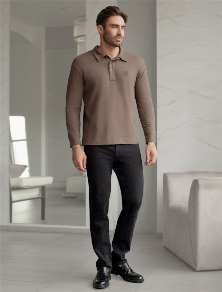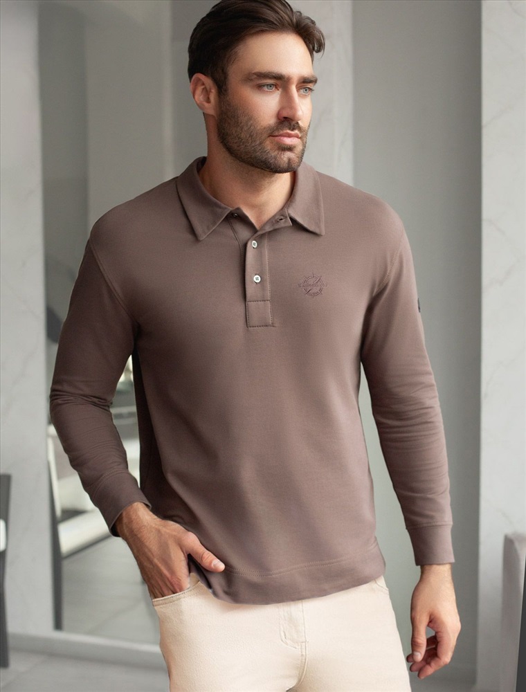 Стильный лонгслив кофейного цвета с воротником поло выполнен из премиального хлопка в сочетании с эластаном . Натуральная ткань обеспечивает легкость, воздухопроницаемость и приятные тактильные ощущения даже когда жарко, позволяет не перегреваться и поддерживает комфортный микроклимат в течение всего дня. Удобный отложной воротник на аккуратных пуговицах делает образ современным и стильным, а длинный рукав защищает руки при ветреной погоде. Поло хорошо садится по фигуре благодаря добавлению эластичных волокон — такой вариант подходит для мужчин любого роста и размеров, не стесняет движений и создает ощущение свободы и легкости.