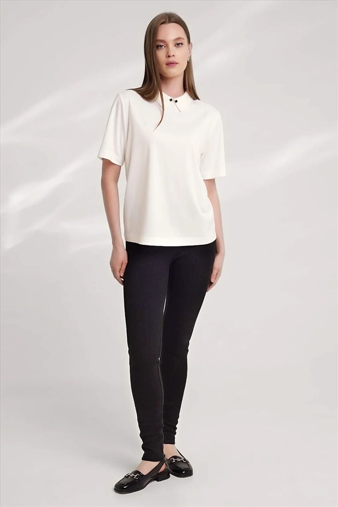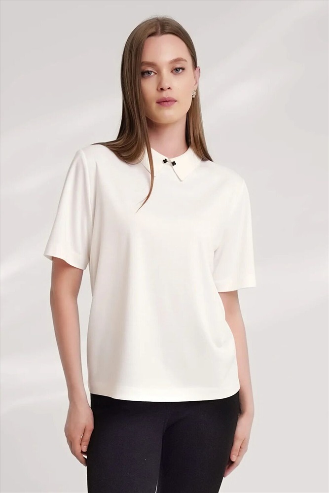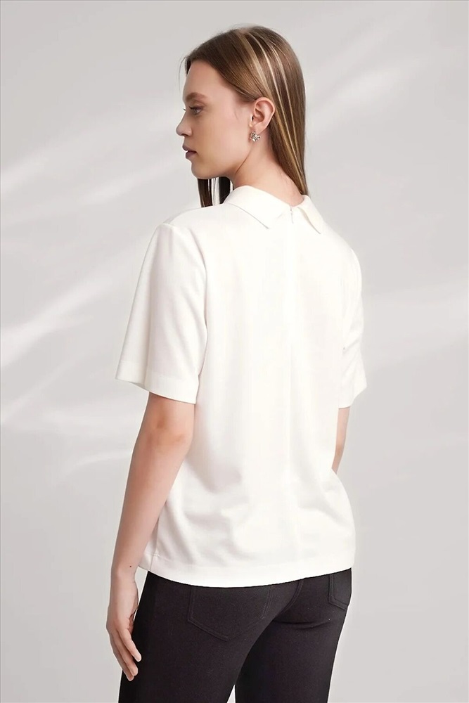 Джемпер из трикотажного полотна интерлок, прямого кроя. Короткий втачной рукав. По горловине отложной вязаный воротник, по центру декор металл. По спинке средний шов с застежкой на молнию.