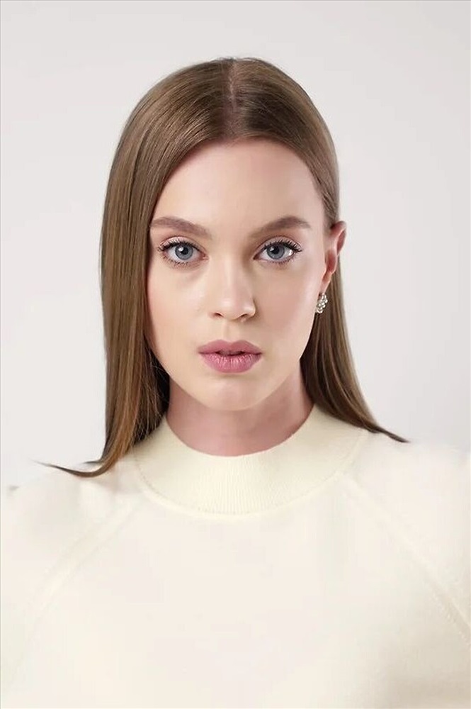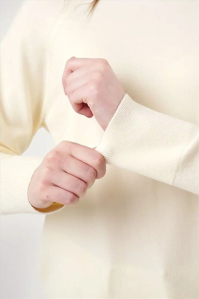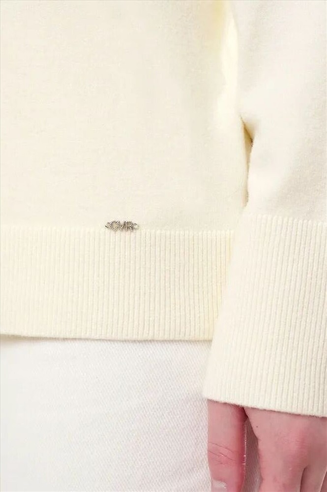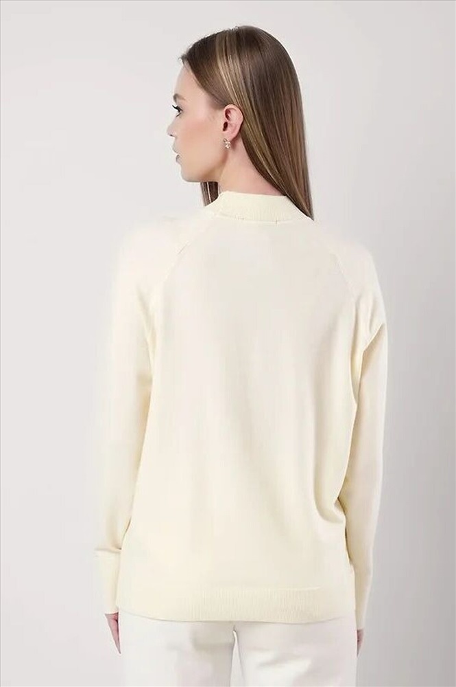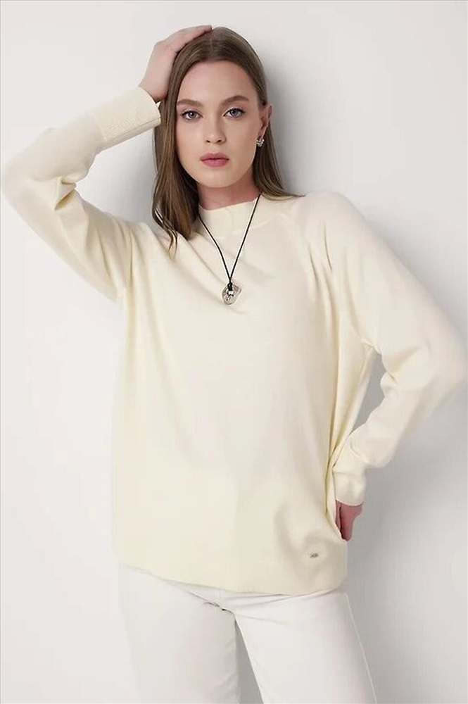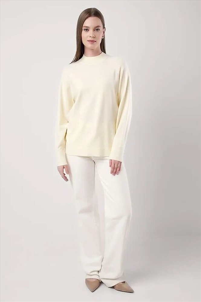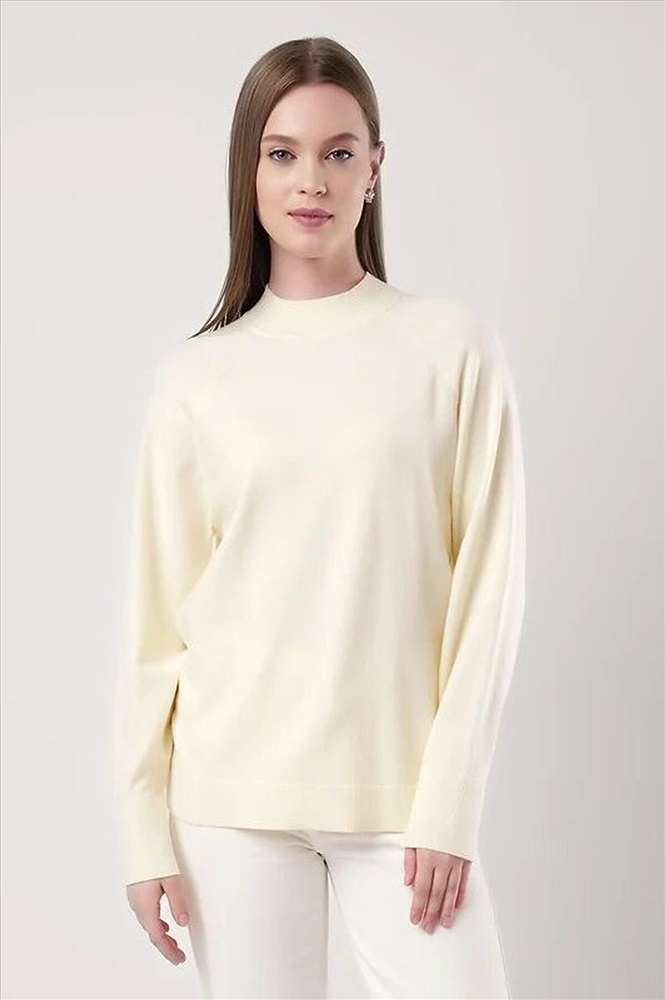 Вязаный джемпер свободного силуэта из вискозной пряжи, переплетения гладь. Длинный рукав реглан. Округлая горловина стойка без загиба. По низу изделия и рукавов манжеты. Спереди нашивка металл.