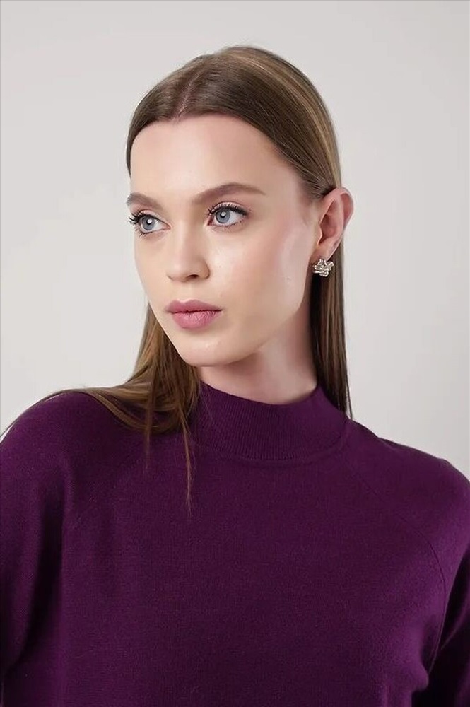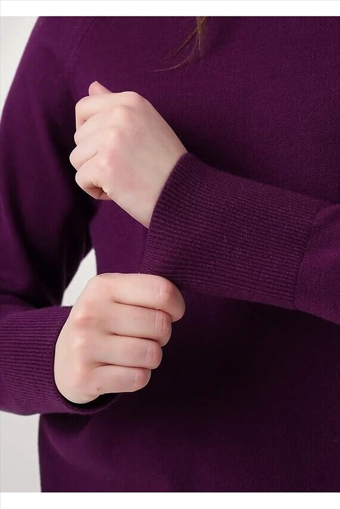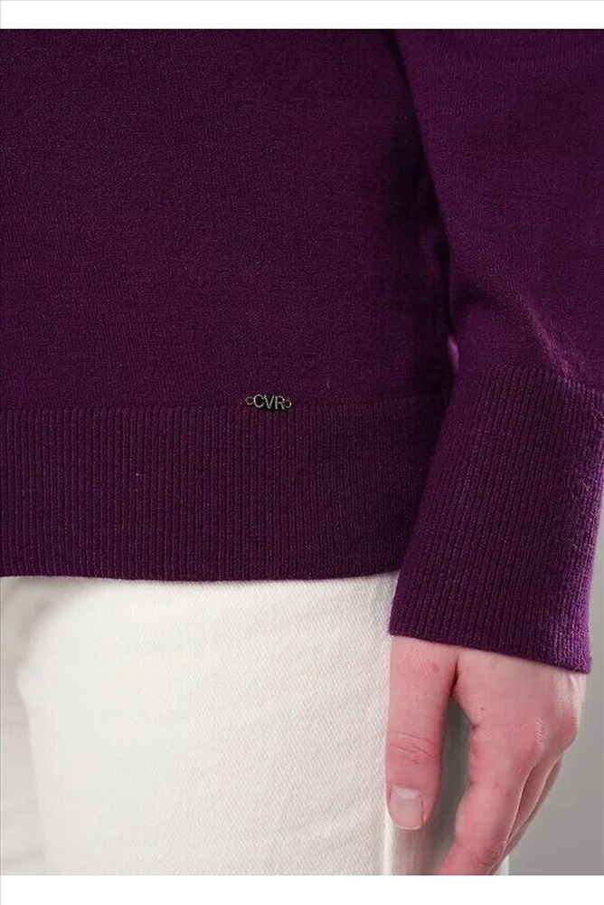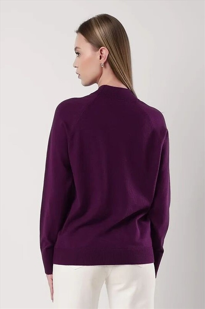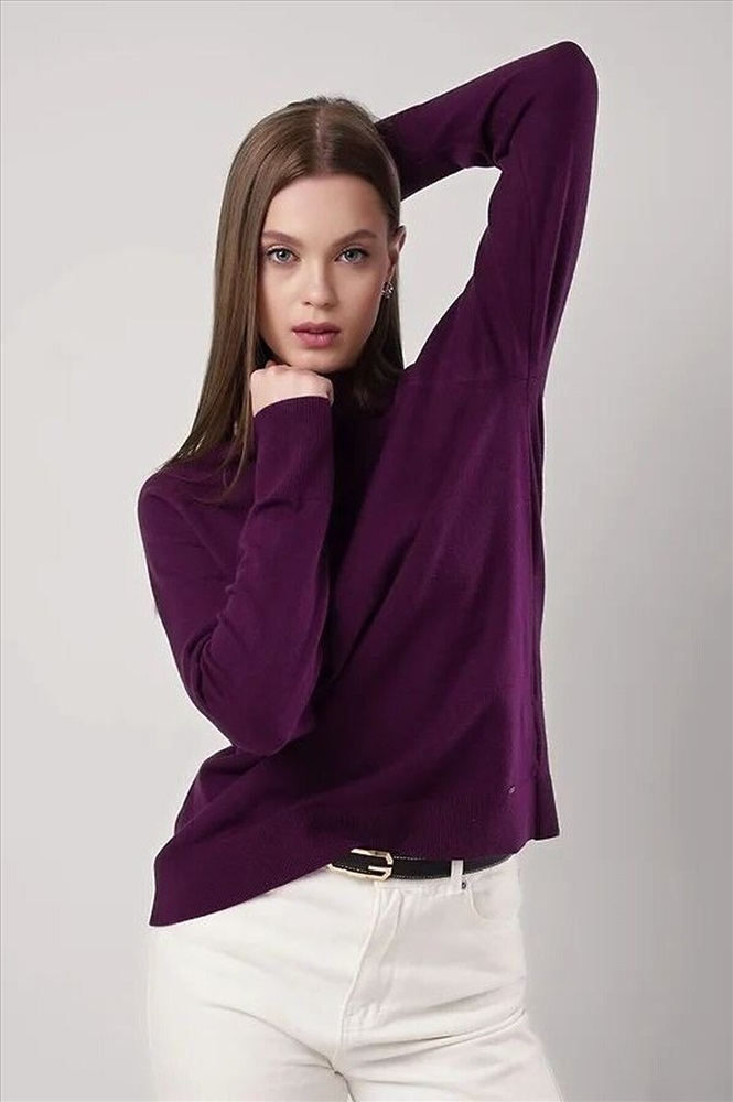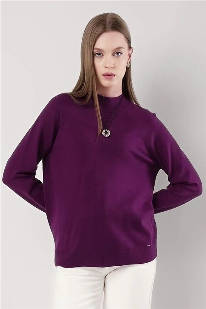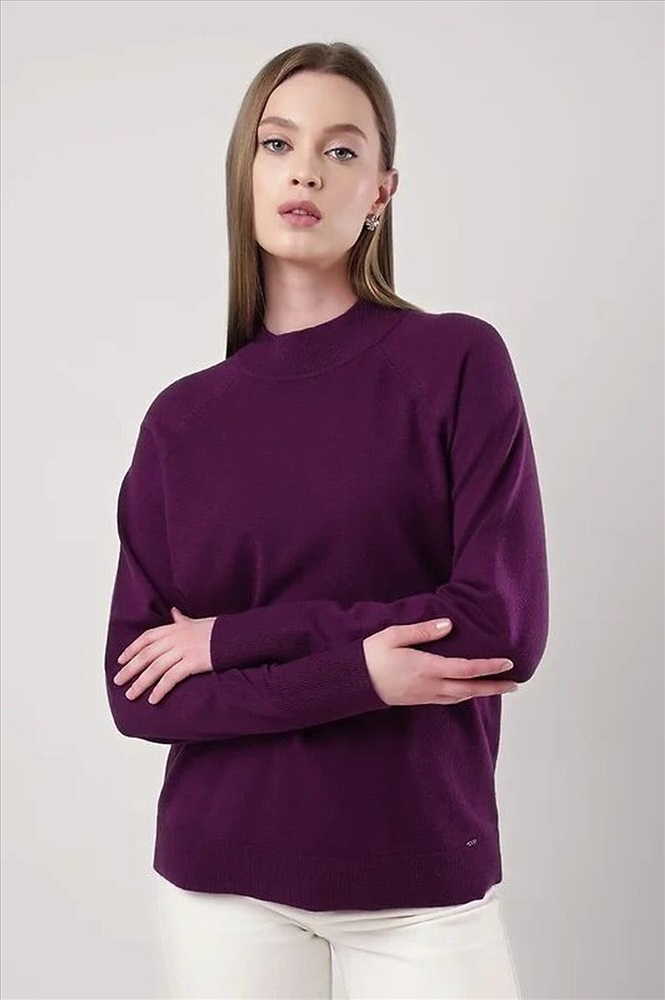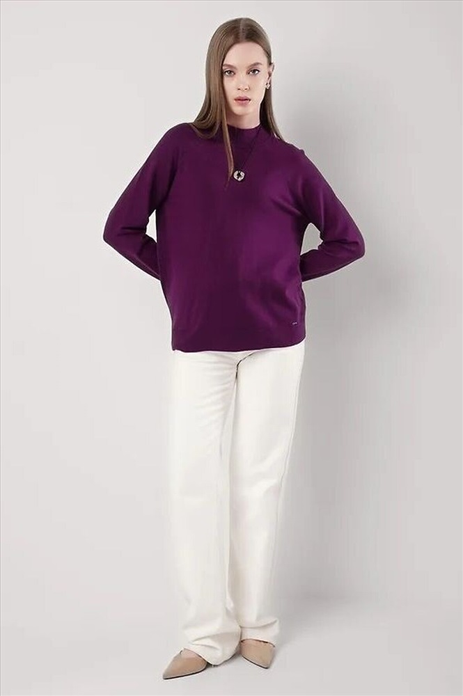 Вязаный джемпер свободного силуэта из вискозной пряжи, переплетения гладь. Длинный рукав реглан. Округлая горловина стойка без загиба. По низу изделия и рукавов манжеты. Спереди нашивка металл.